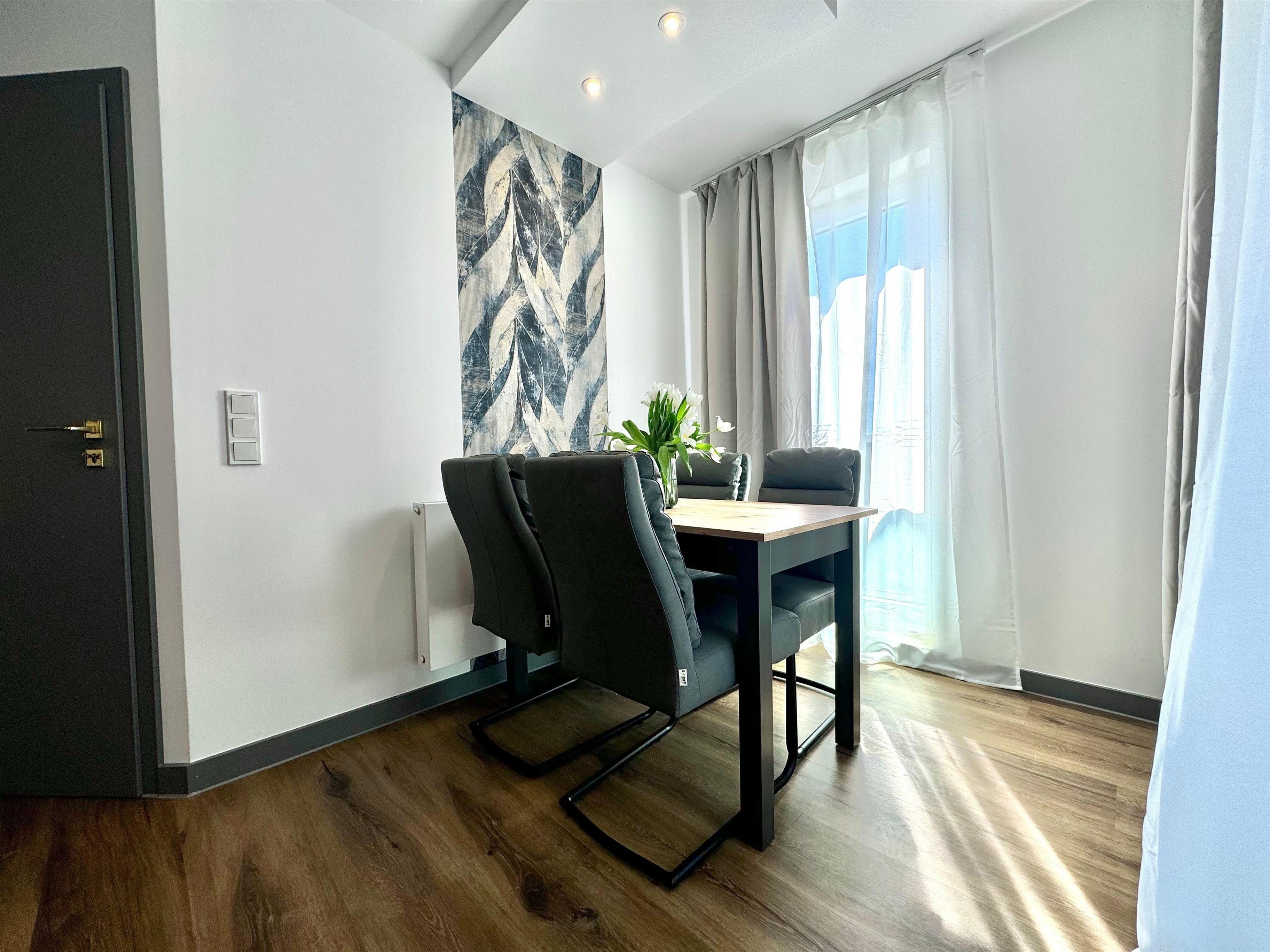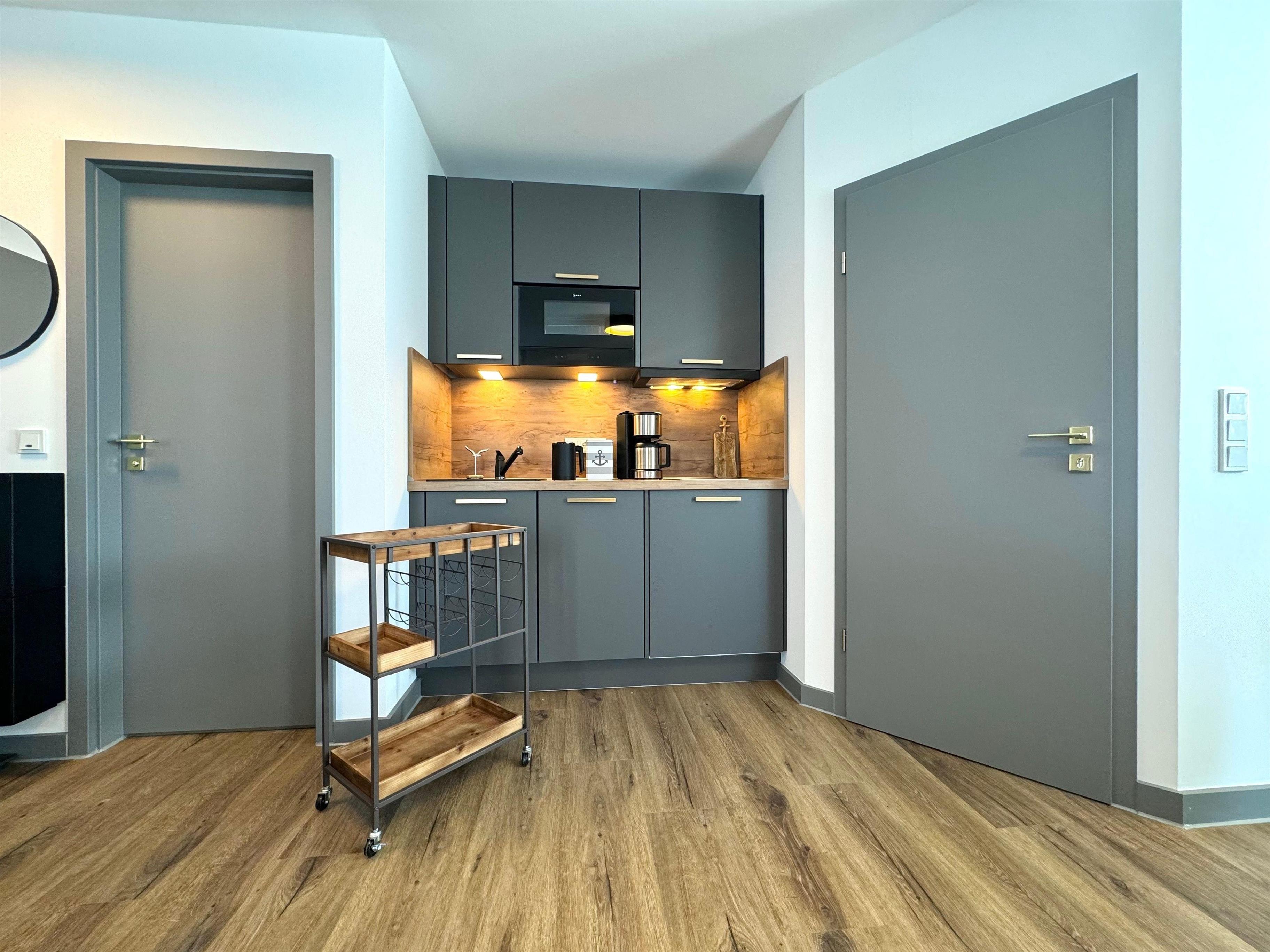 An das Wohnzimmer grenzt der Küchenbereich, der eine kleine, voll ausgestattete Küche sowie einen Esstisch mit 4 Stühlen beinhaltet.