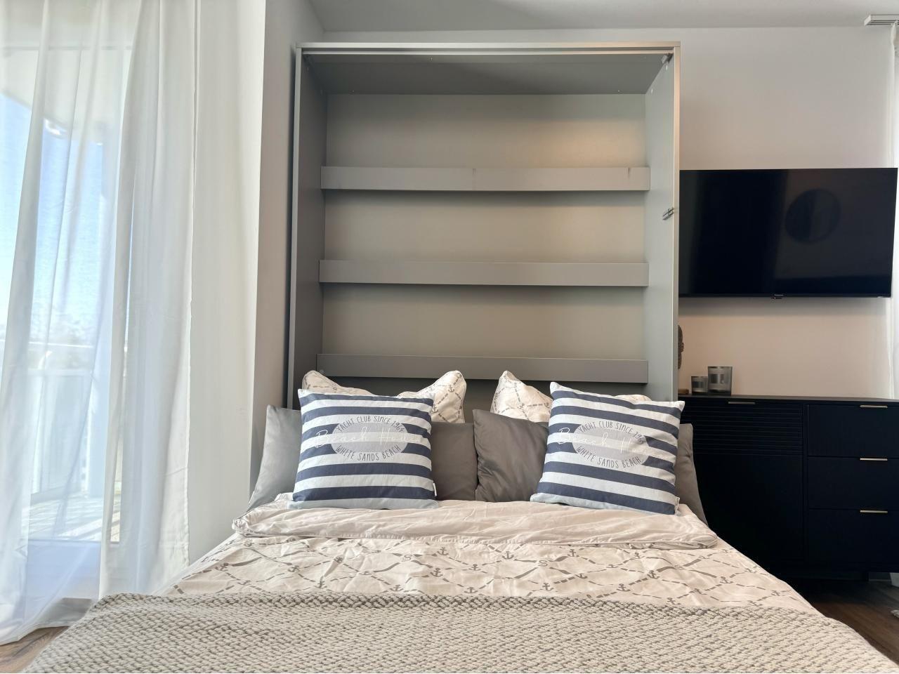 Das separate Schlafzimmer ist mit einem bequemen Doppelbett eingerichtet. Nach einem erholsamen Schlaf sind Sie gerüstet für einen weiteren erlebnisreichen Urlaubstag. Ihre Urlaubsgarderobe findet ausreichend Platz in dem vorhandenen Kleiderschrank. Ein weiteres Fernsehgerät rundet in diesem Bereich die Gemütlichkeit ab.