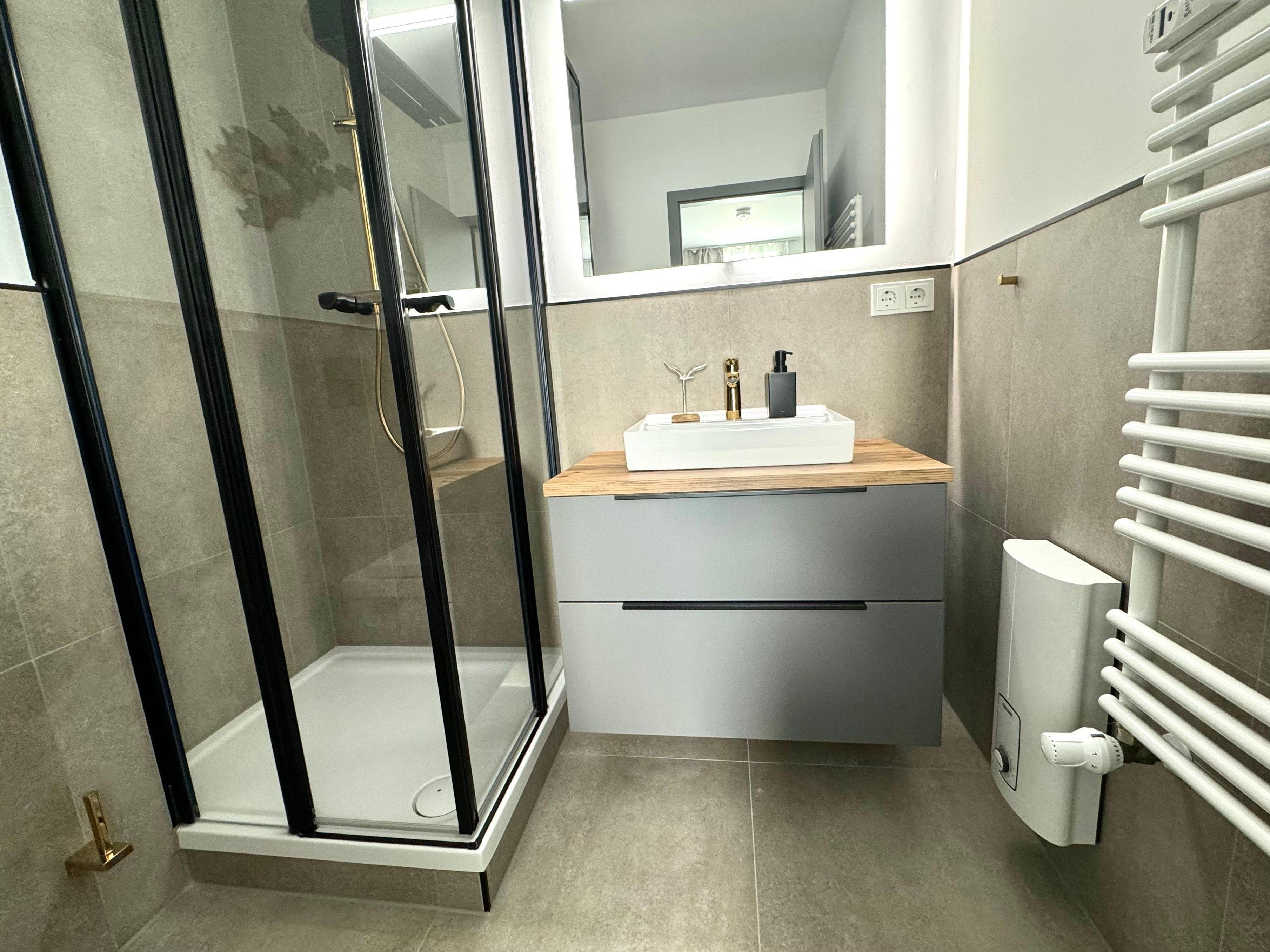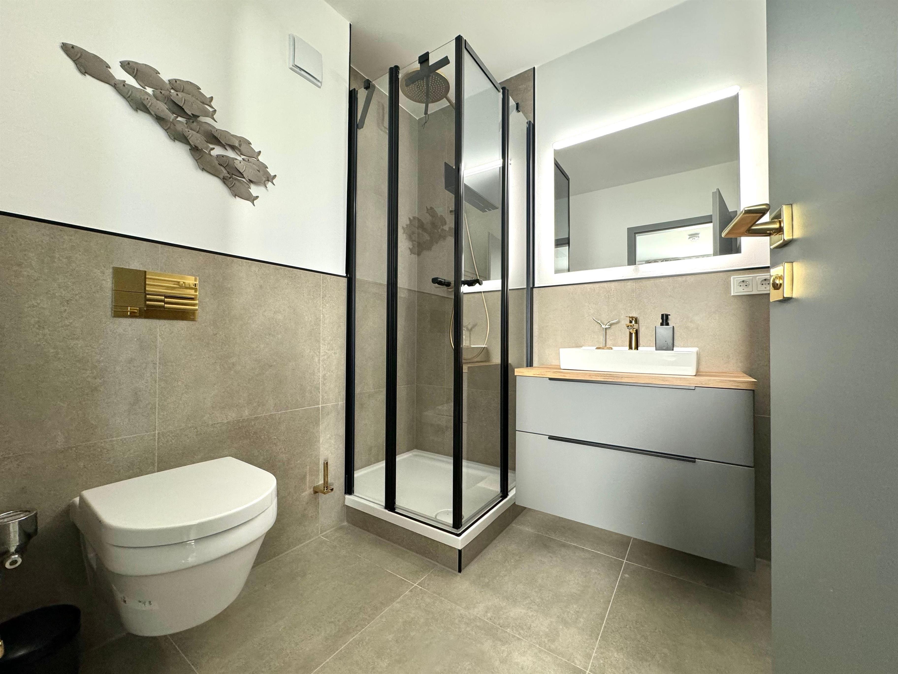 Das stilvolle Badezimmer ist mit einer Dusche, einem Waschbecken und einem WC ausgestattet.