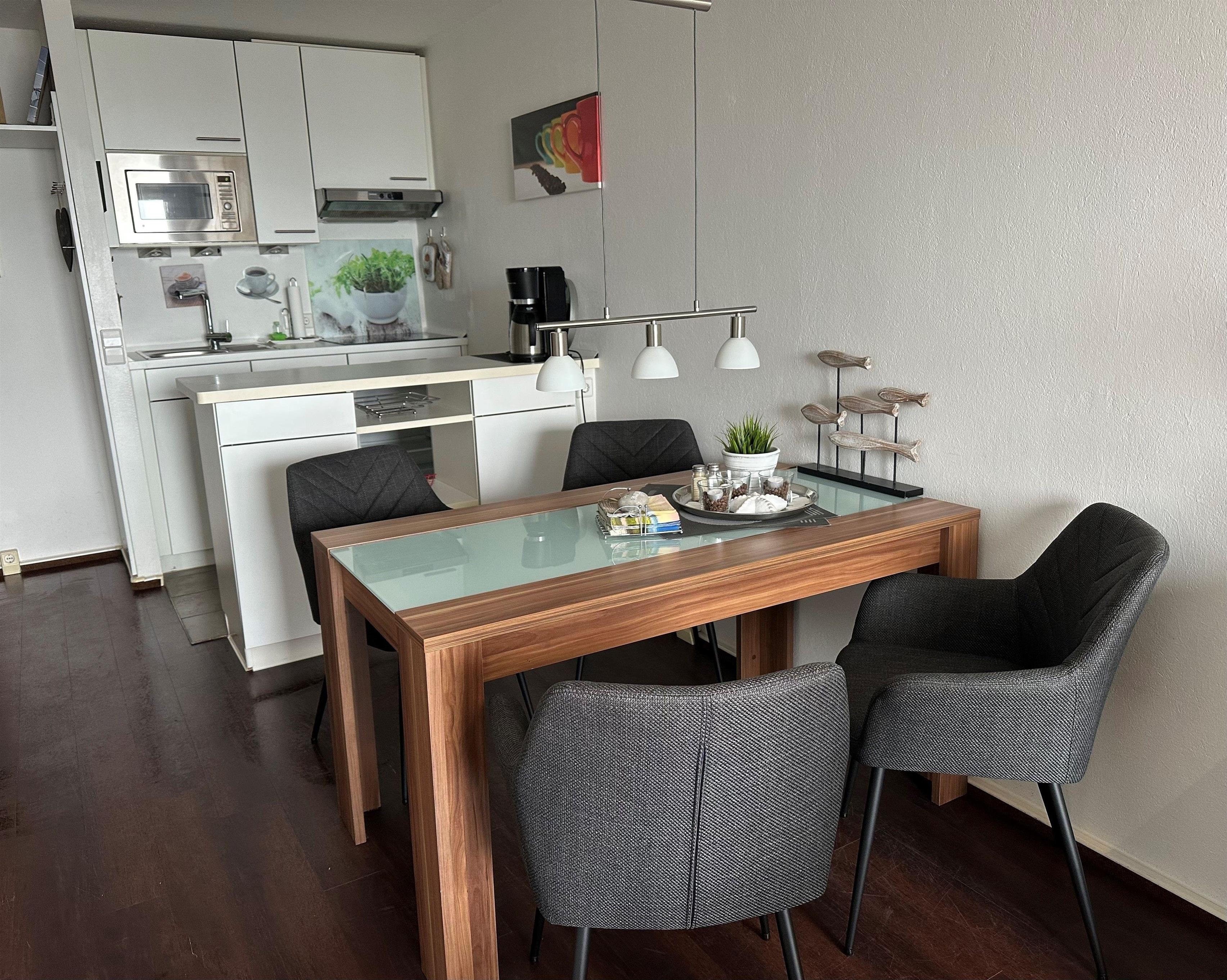 An den Wohnbereich grenzt die kleine Küchenzeile, die voll ausgestattet ist. Hier stehen Ihnen ein 4-Platten-Kochherd, eine Mikrowelle, ein Toaster, eine Kaffeemaschine, ein Wasserkocher sowie ein Geschirrspüler zur Verfügung. Und natürlich ist auch ausreichend Geschirr vorhanden.