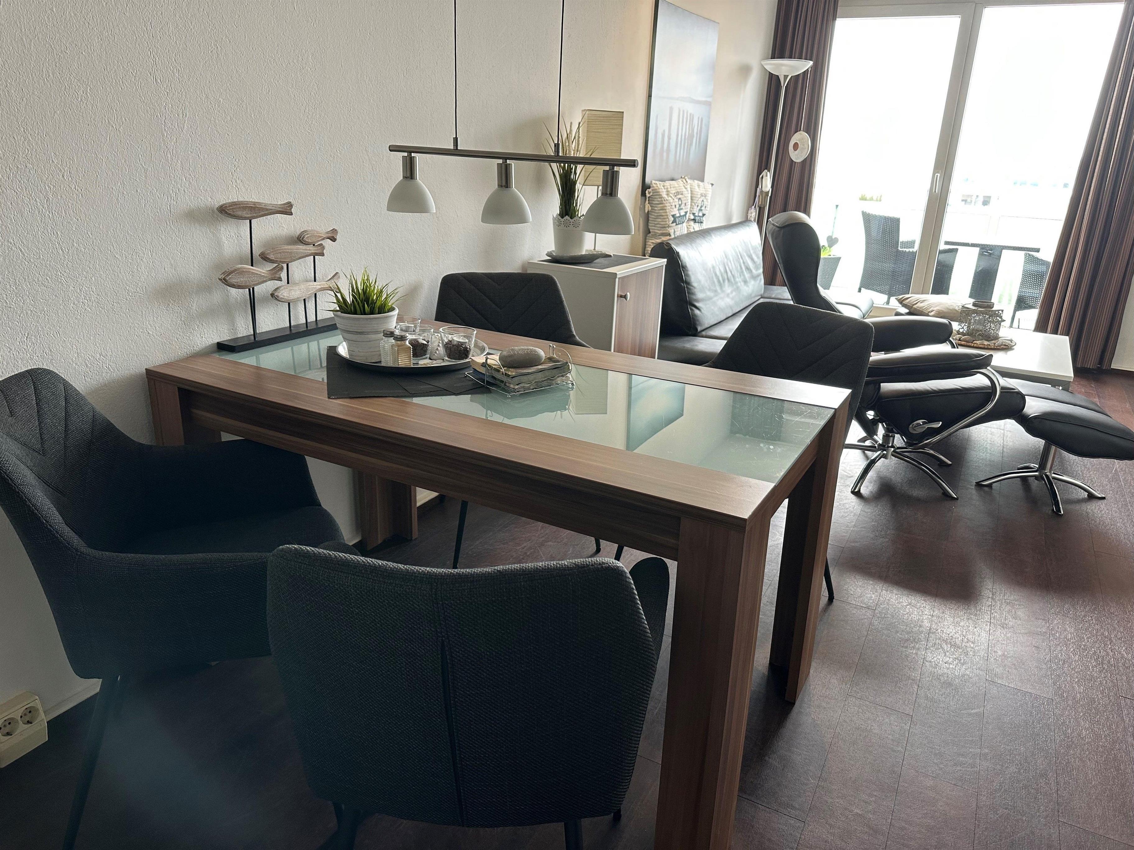 An Ihre Wohnung grenzt ein Balkon zur Nordseite, dieser ist mit modernen Balkonmöbeln ausgestattet und lädt zum gemütlichen Verweilen ein. Beim großartigen Blick auf die Ostsee können Sie hier die Seele baumeln lassen und den Alltagsstress schnell vergessen.