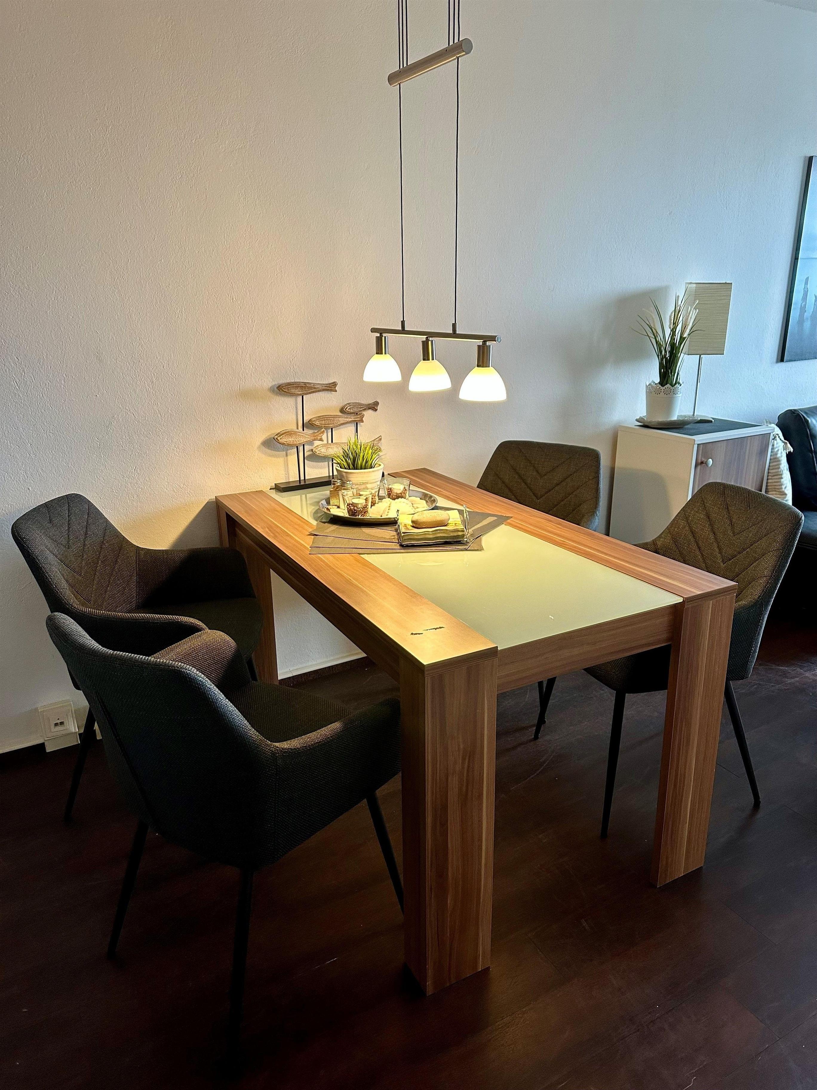 Ein praktischer sowie ansprechender Raumteiler in Form eines Sideboards trennt diese Küchenzeile von der Essecke, die mit einem Tisch und 4 bequemen Stühlen ausgestattet ist.