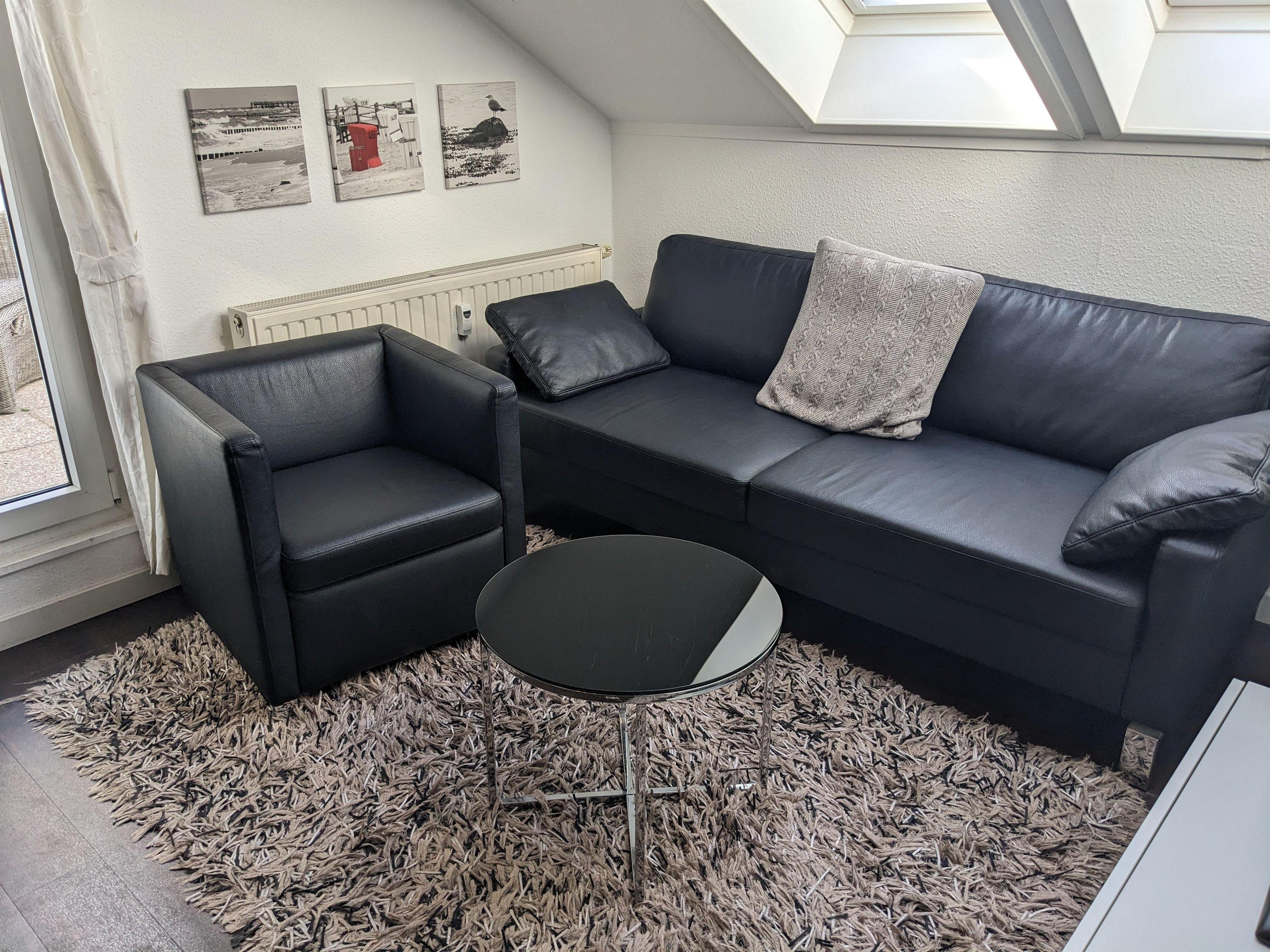 Der komfortable Wohnbereich ist mit einem Sofa und einem Sessel eingerichtet. Hier können Sie es sich nach einem ereignisreichen Tag gemütlich machen und bei einem Glas Wein zur Unterhaltung den Flachbildschirm-TV nutzen.
