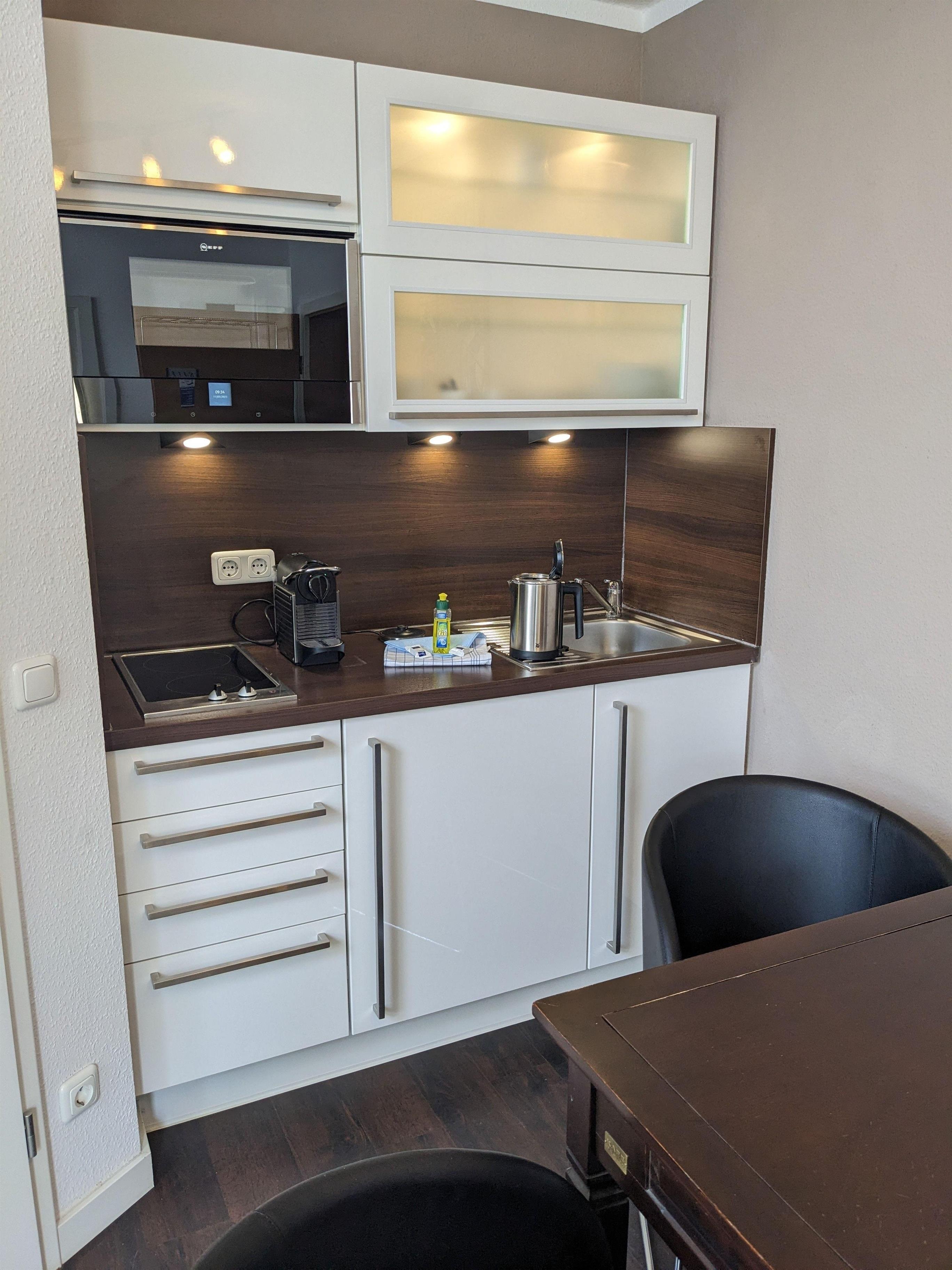 An den Wohnbereich grenzt die voll ausgestattete Küchenzeile. Hier finden Sie einen 2-Platten-Herd, Mikrowelle, Toaster, Kaffeekapselmaschine „Nespresso Kapseln Typ Original", Wasserkocher und natürlich genügend Geschirr. Kurzum: alles, was Sie für das Frühstück und die kleine Mahlzeit benötigen.