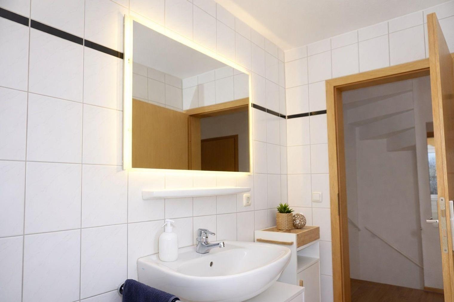 Das Bad verfügt über eine Dusche, ein Aufsatzwaschbecken mit Unterschrank, ein WC sowie einen großen Lichtspiegel.