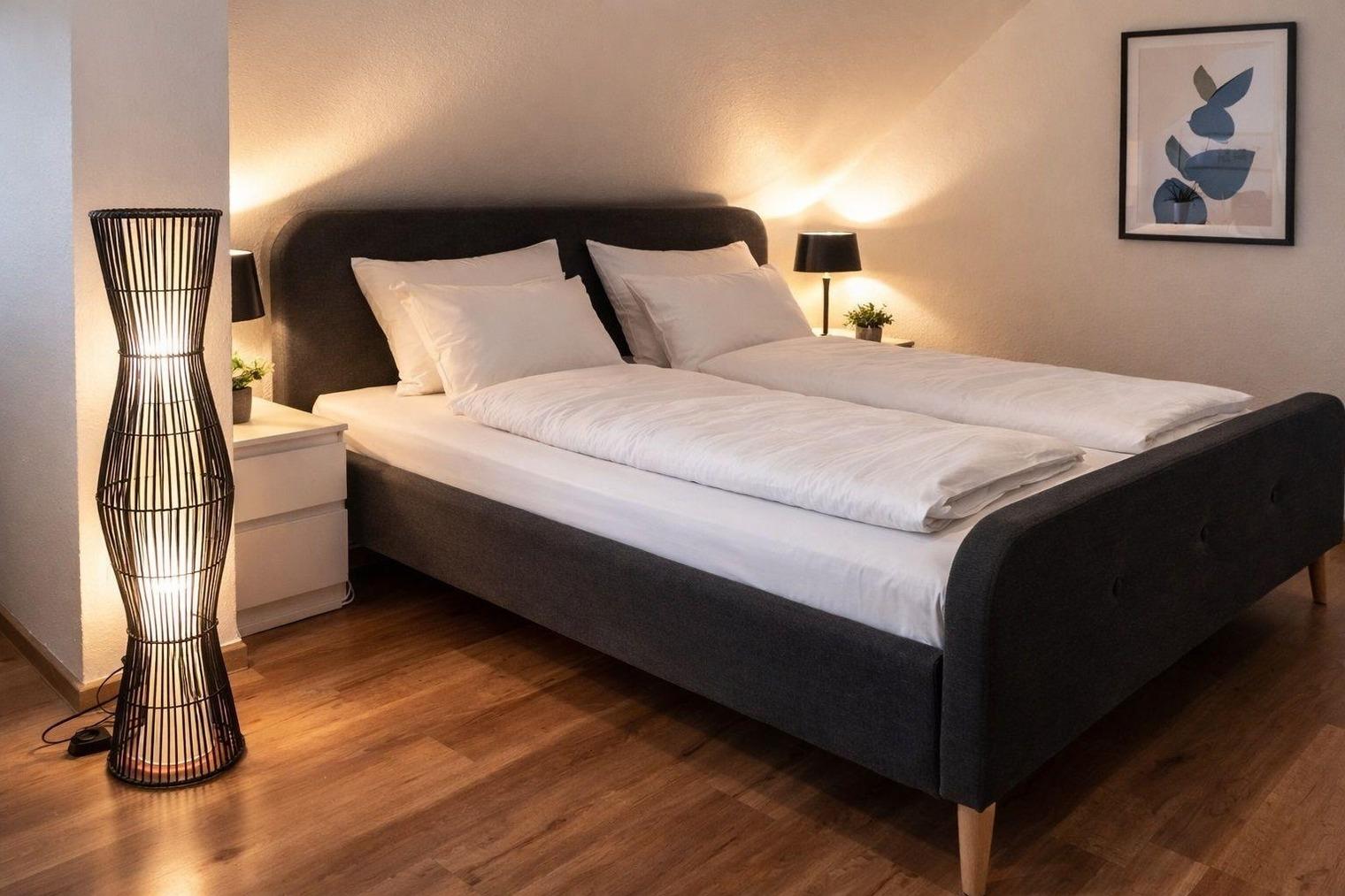 Das erste Schlafzimmer ist mit einem großen Doppelbett (1,80 x 2,00 m) und TV ausgestattet. Ein geräumiger Kleiderschrank und eine Kommode bieten ausreichend Platz für Ihre Urlaubsgarderobe. Im gemütlichen Ohrensessel können es sich die lesefreudigen Gäste mit einem Buch gemütlich machen.
