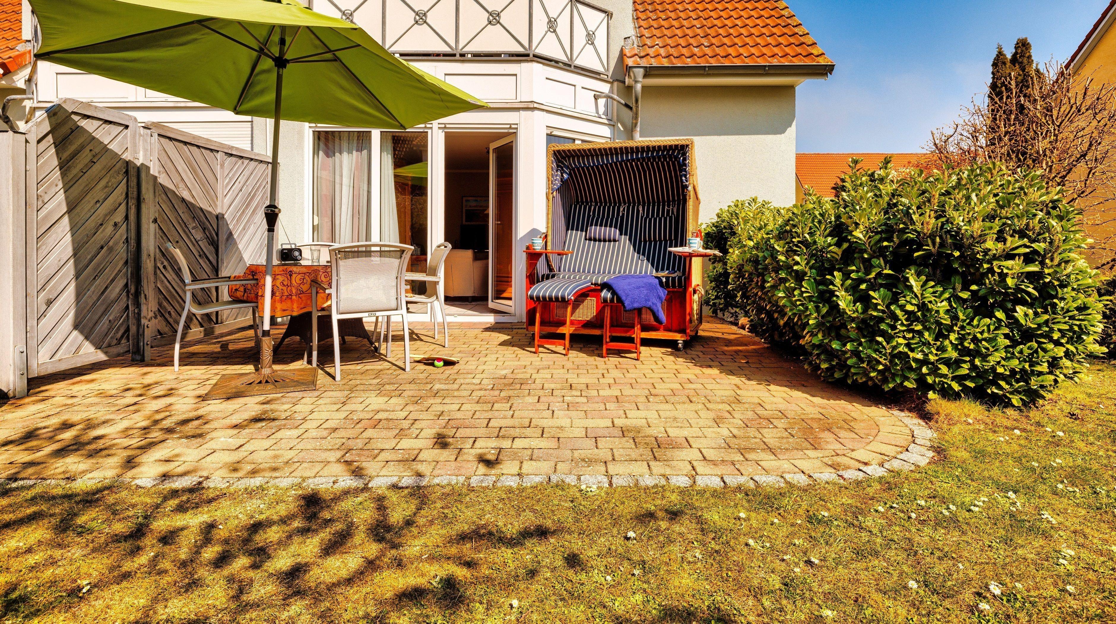 Ein Blickfang im Außenbereich - die sonnige Südterrasse! Gartenmöbel und ein Sonnenschirm runden das harmonische Ambiente ab. Von April bis Oktober steht hier ein ausladender Strandkorb bereit für das maritime Flair. Genießen Sie mit der Familie den Aufenthalt auf der Terrasse und lassen die Seele baumeln, der Alltagsstress ist schnell vergessen!