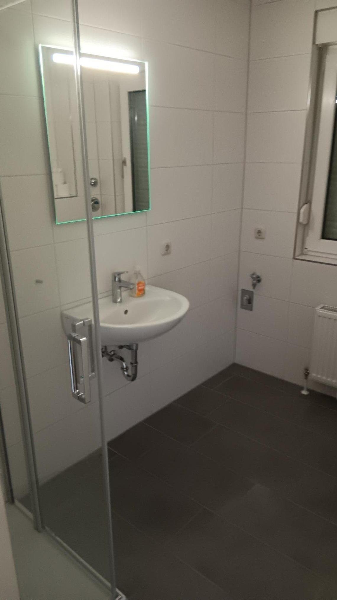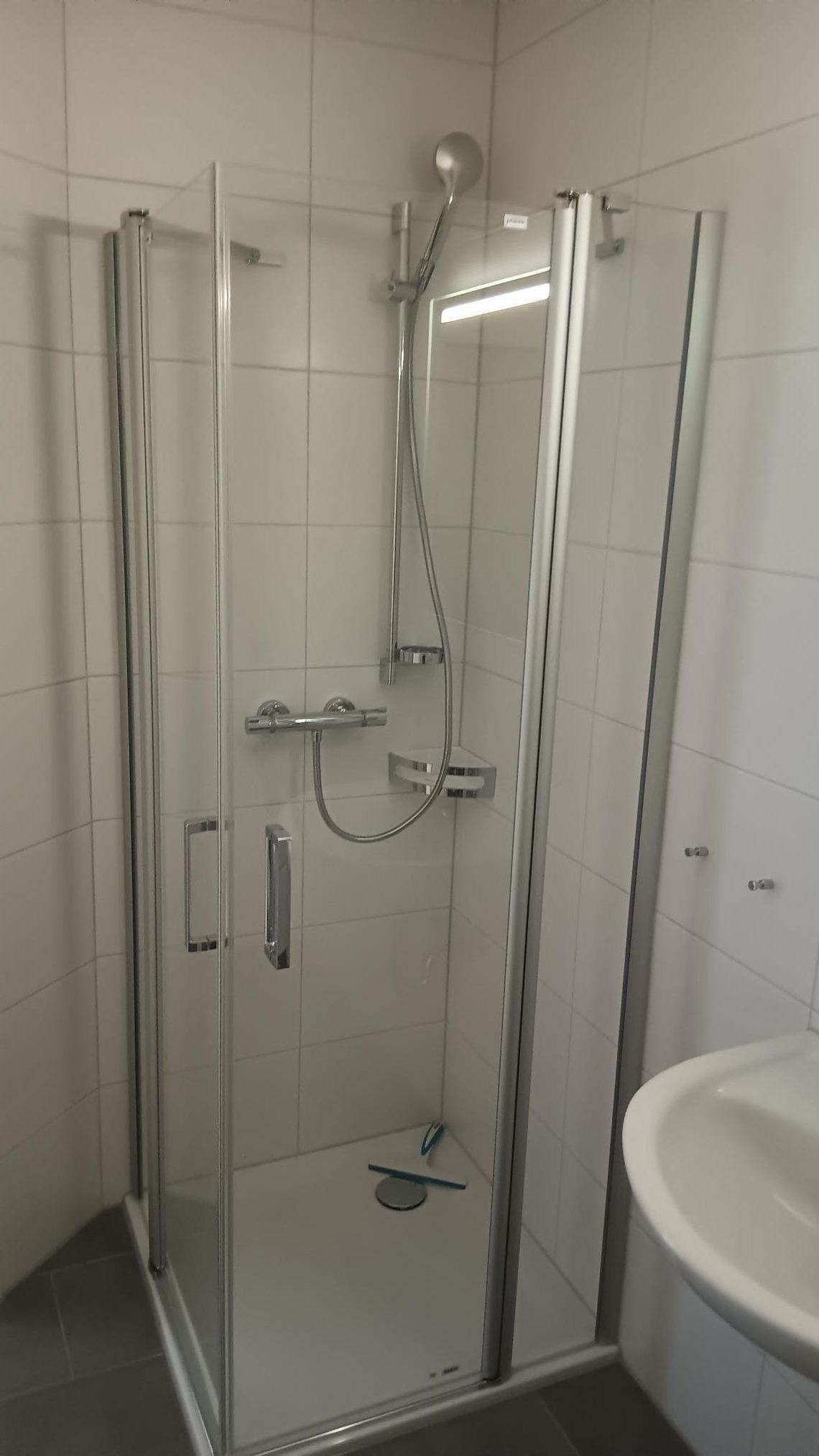 Das geflieste Bad mit Tageslicht verfügt über eine Dusche, ein WC und ein Waschbecken.