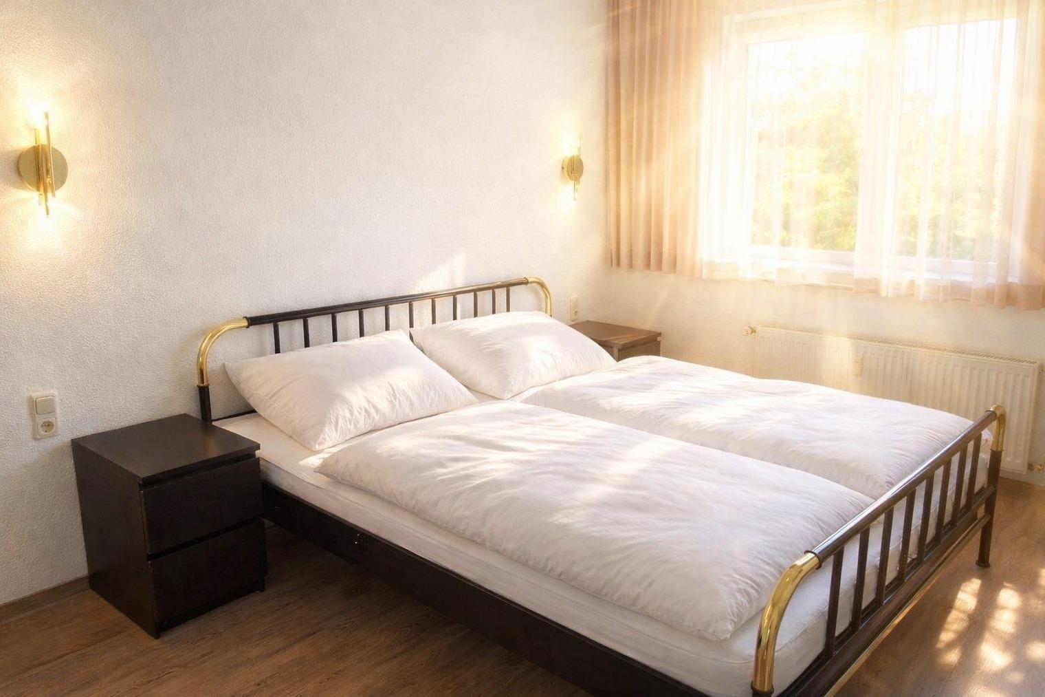 Das gemütliche Schlafzimmer verfügt über ein 1,80 x 2,00 m großes bequemes Doppelbett, in dem es sich erholsam schlafen lässt. Der große Kleiderschrank bietet ausreichend Stauraum für Ihre Urlaubsgarderobe. Zwei kleine Nachtschränke bieten Platz für persönliche Dinge.