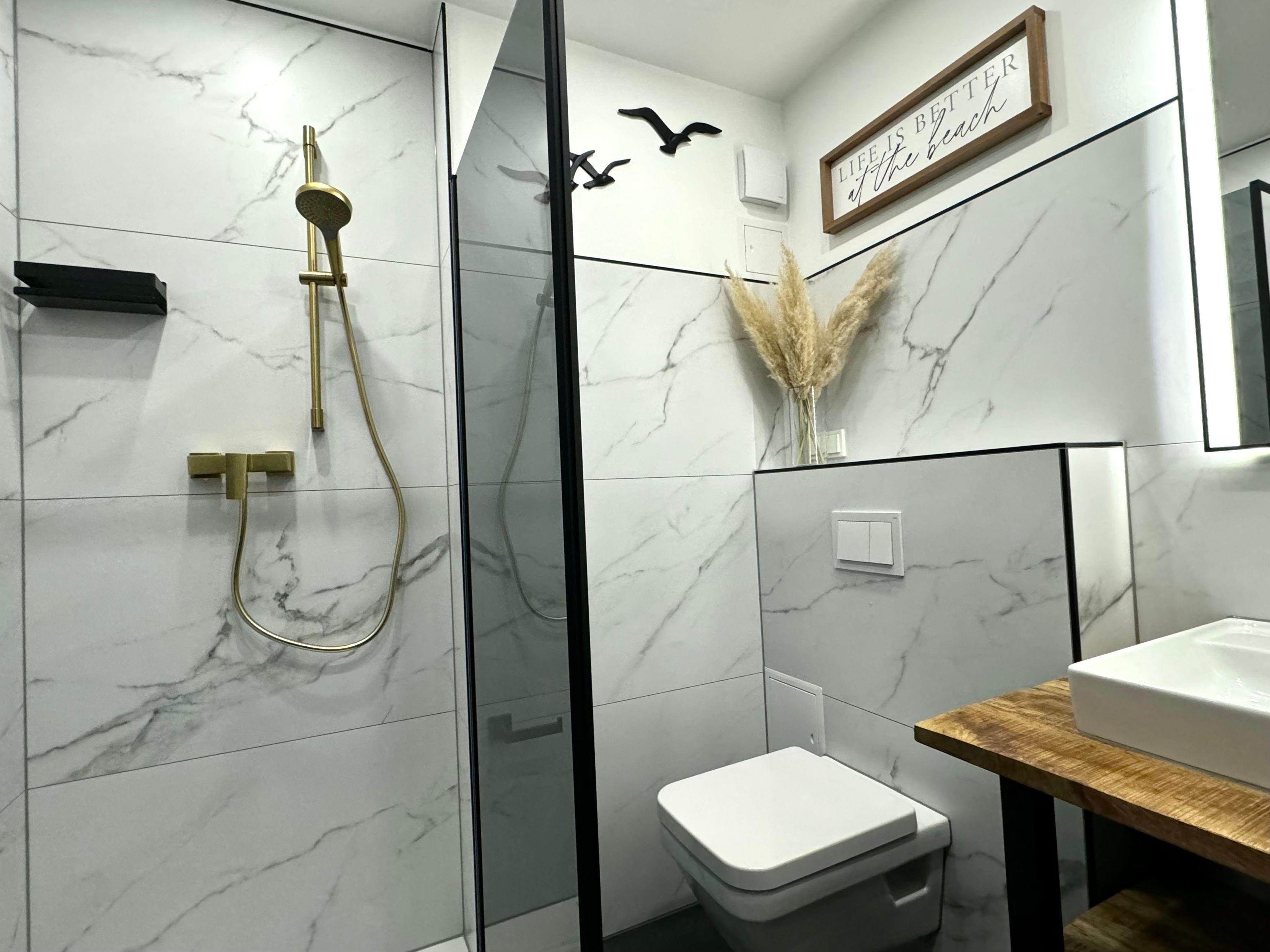 Das neu renovierte Badezimmer verfügt über eine Dusche mit flachem Einstieg sowie Sicherheits- und Echtglasabtrennung, ein Waschbecken mit Spiegel, ein WC, Ablageflächen für Ihr Badutensilien sowie einen Föhn.