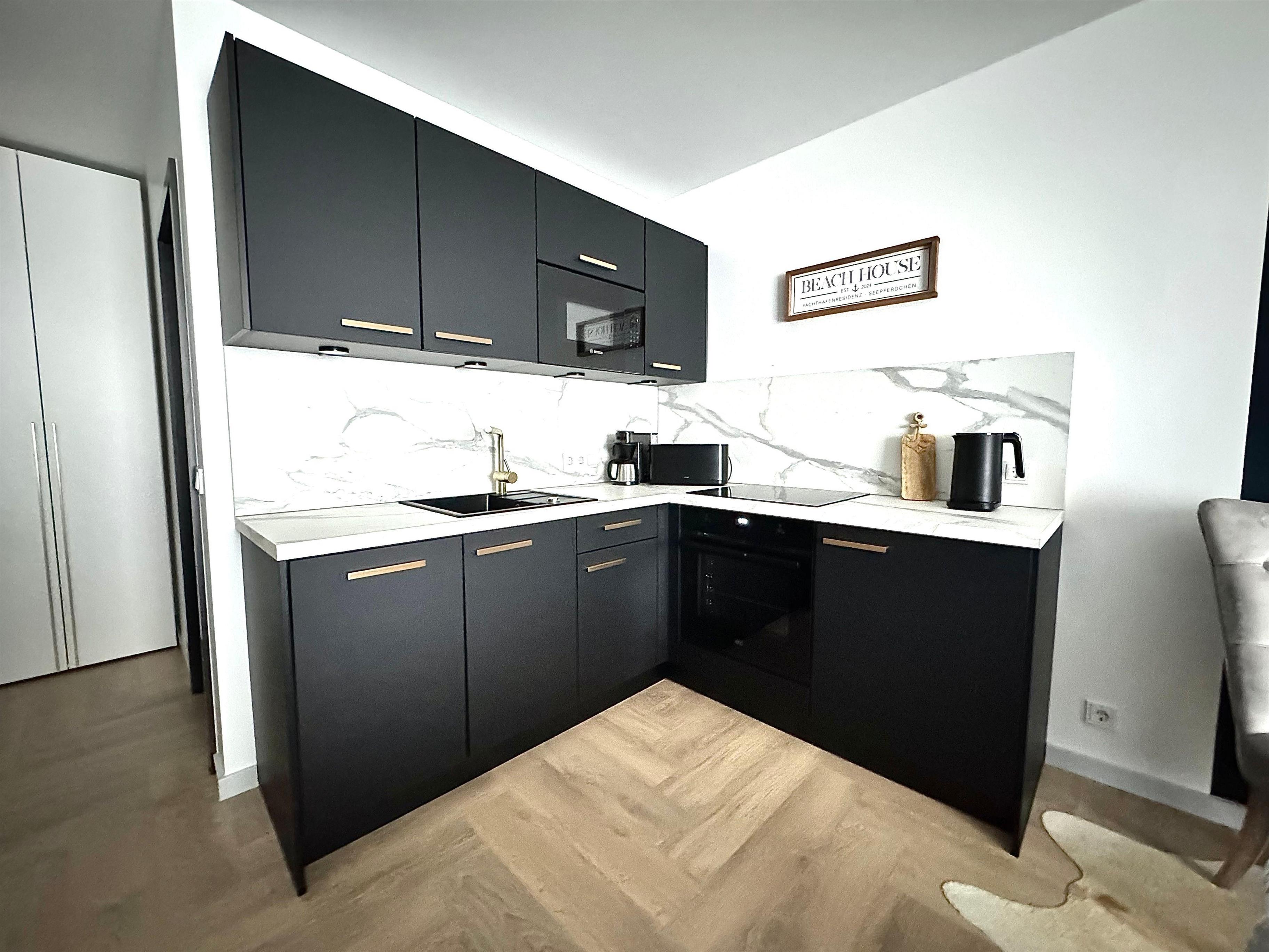 Die neue Einbauküche ist voll ausgestattet und hält alle modernen Geräte und weitere Küchenutensilien für Sie bereit. Hier müssen Sie auf nichts verzichten für die Zubereitung Ihrer Mahlzeiten, die Sie am kleinen Esstisch einnehmen können.