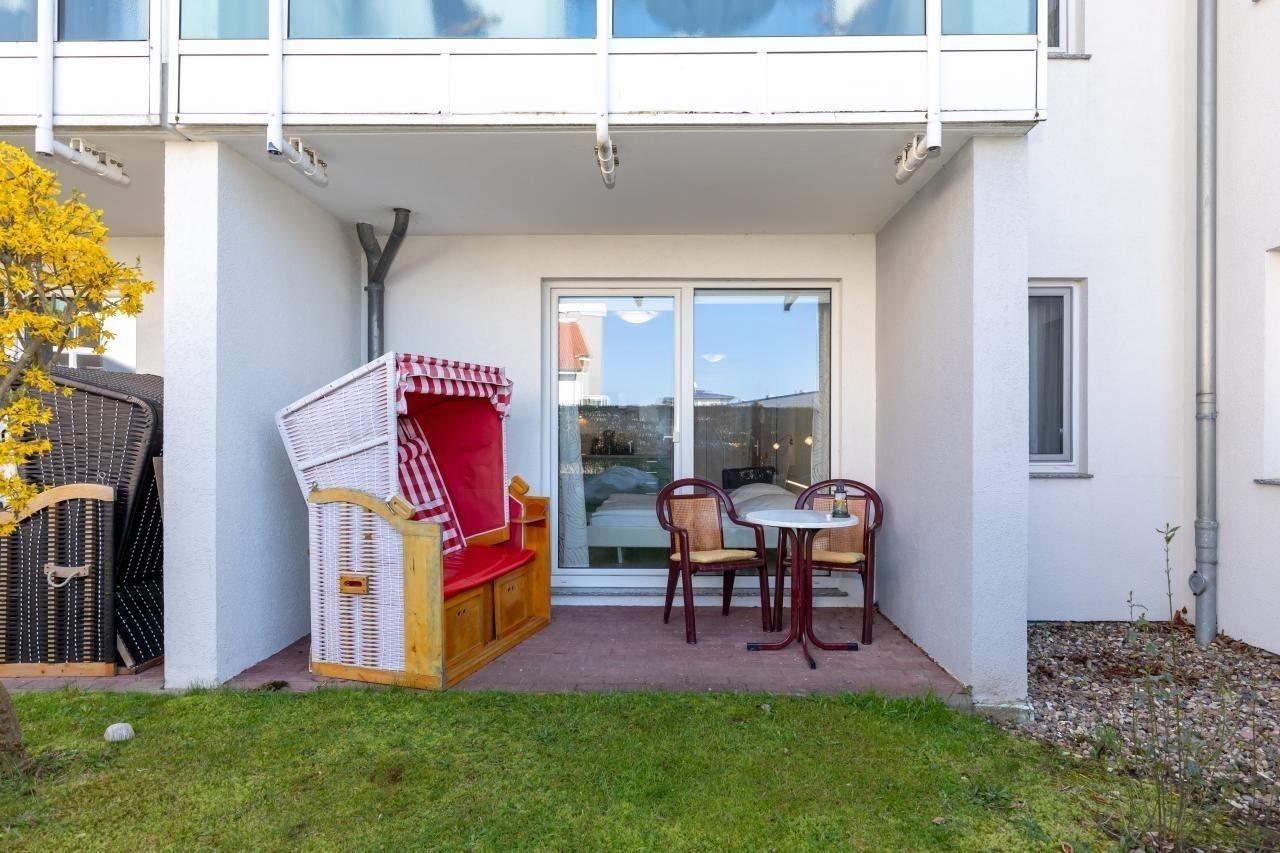 Vom Wohnbereich gelangen Sie auf die gemütliche Terrasse, die mit einer Sitzecke ausgestattet ist. Für das besondere maritime Ambiente sorgt ein hübscher Strandkorb. Auf dieser kleinen Wohlfühloase können Sie die Seele baumeln lassen und gemeinsam einen ereignisreichen Urlaubstag gemütlich bei einem leckeren Getränk ausklingen lassen.