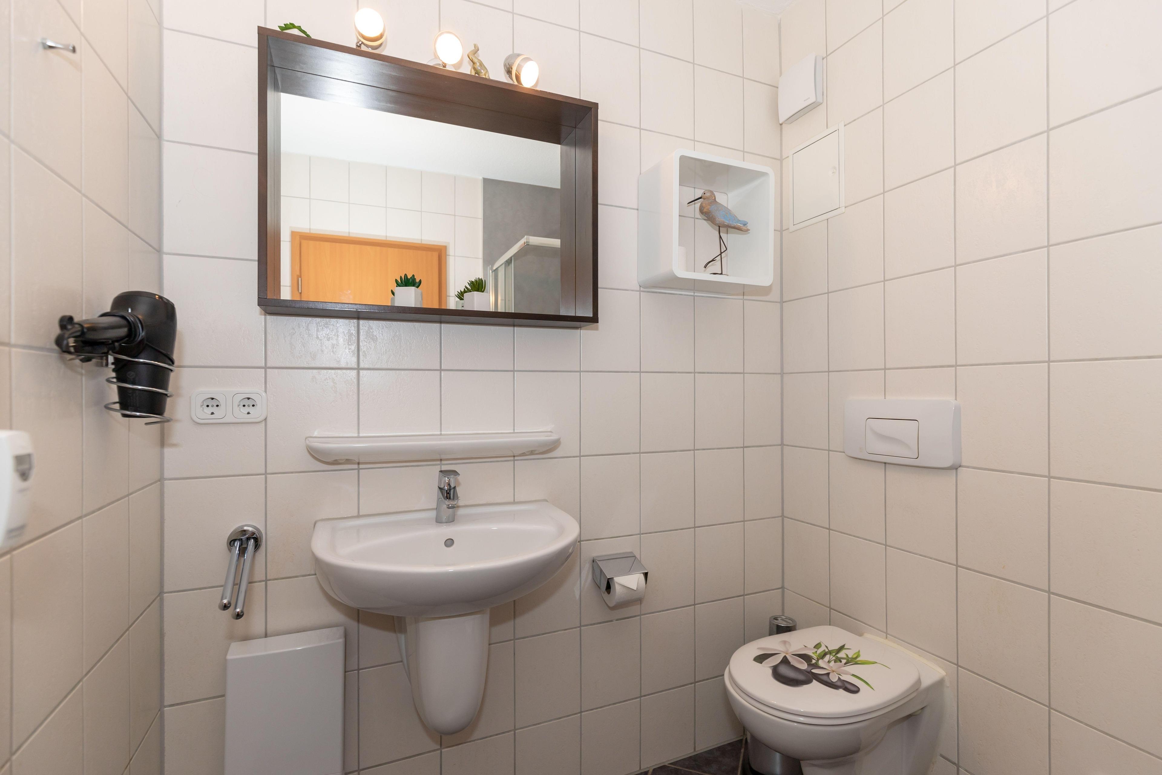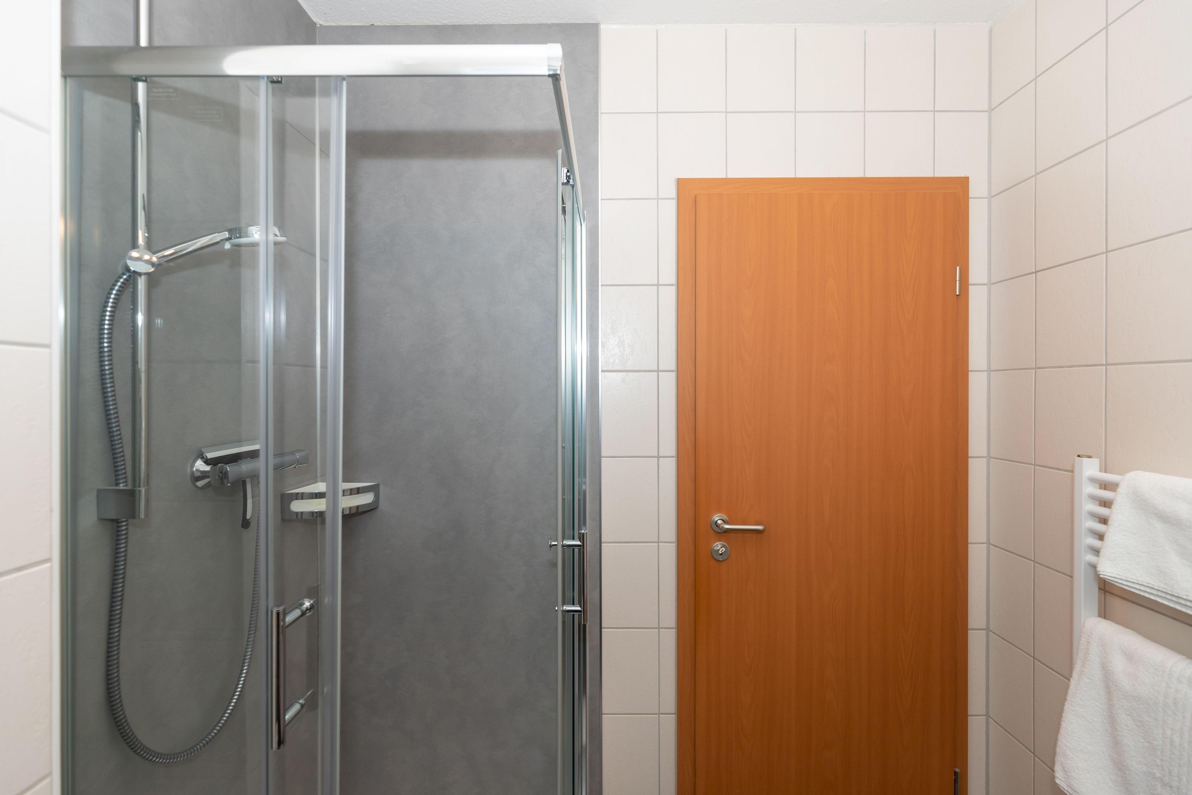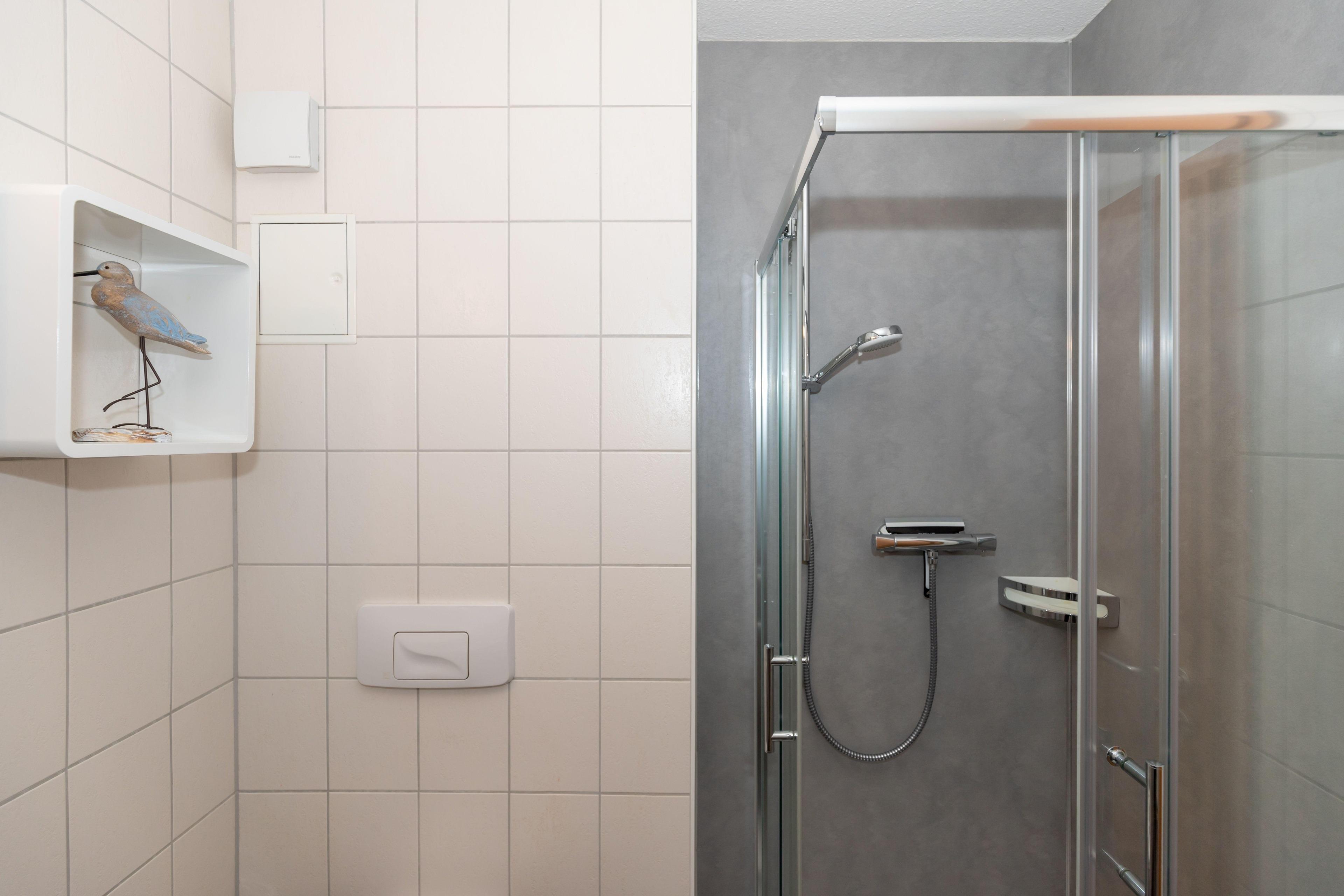 Das neu renovierte, geräumige Badezimmer verfügt über ein Waschbecken mit Spiegel, Ablagemöglichkeiten, WC, Föhn, Handtuchheizkörper sowie eine Dusche mit flachem Einstieg sowie neuer komfortabler Sicherheits-Echtglasabtrennung.