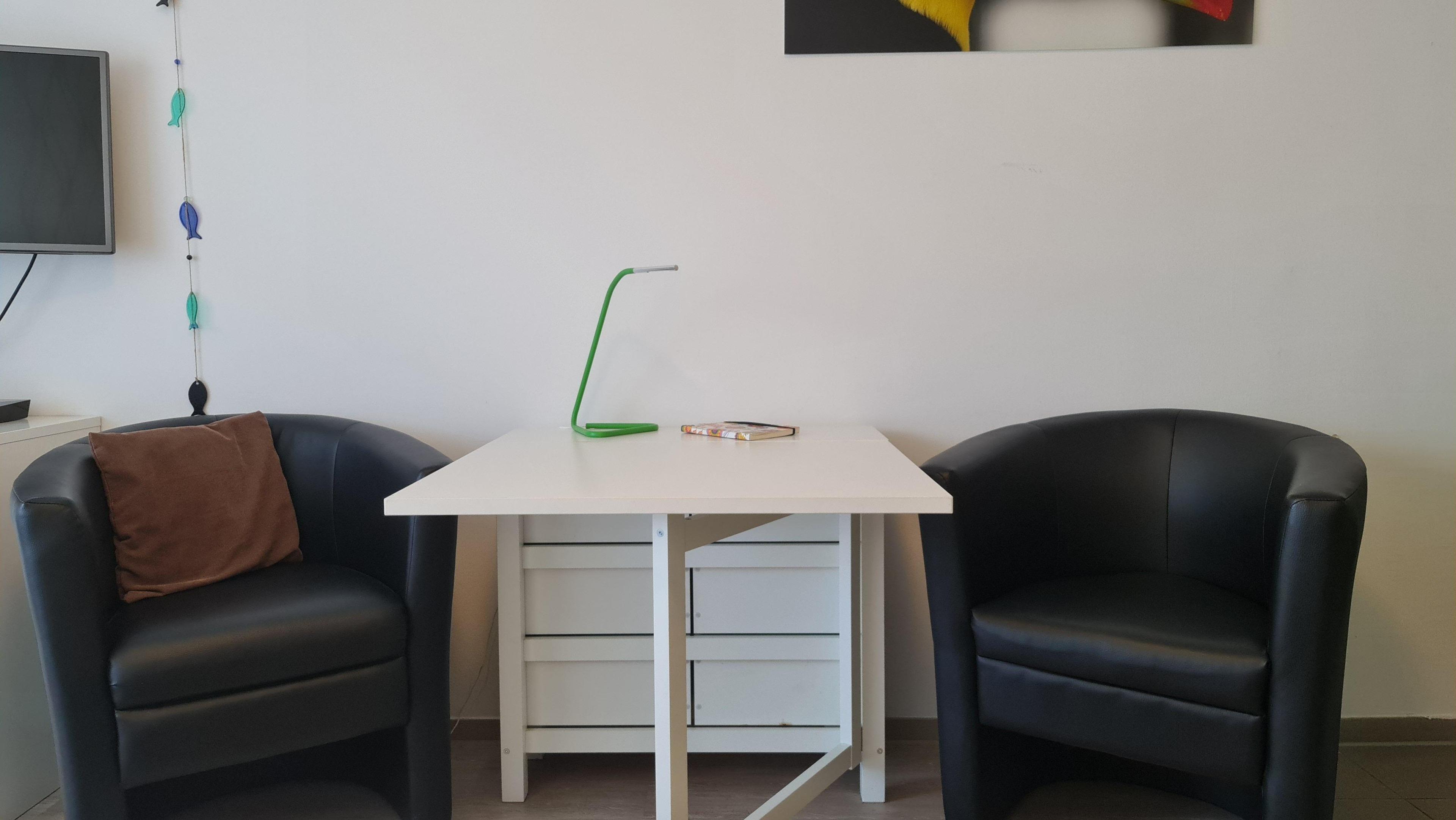 Zur Ausstattung gehören ebenfalls 3 gemütliche Cocktail-Sessel und ein ausklappbarer Tisch für die gemeinsamen Mahlzeiten.