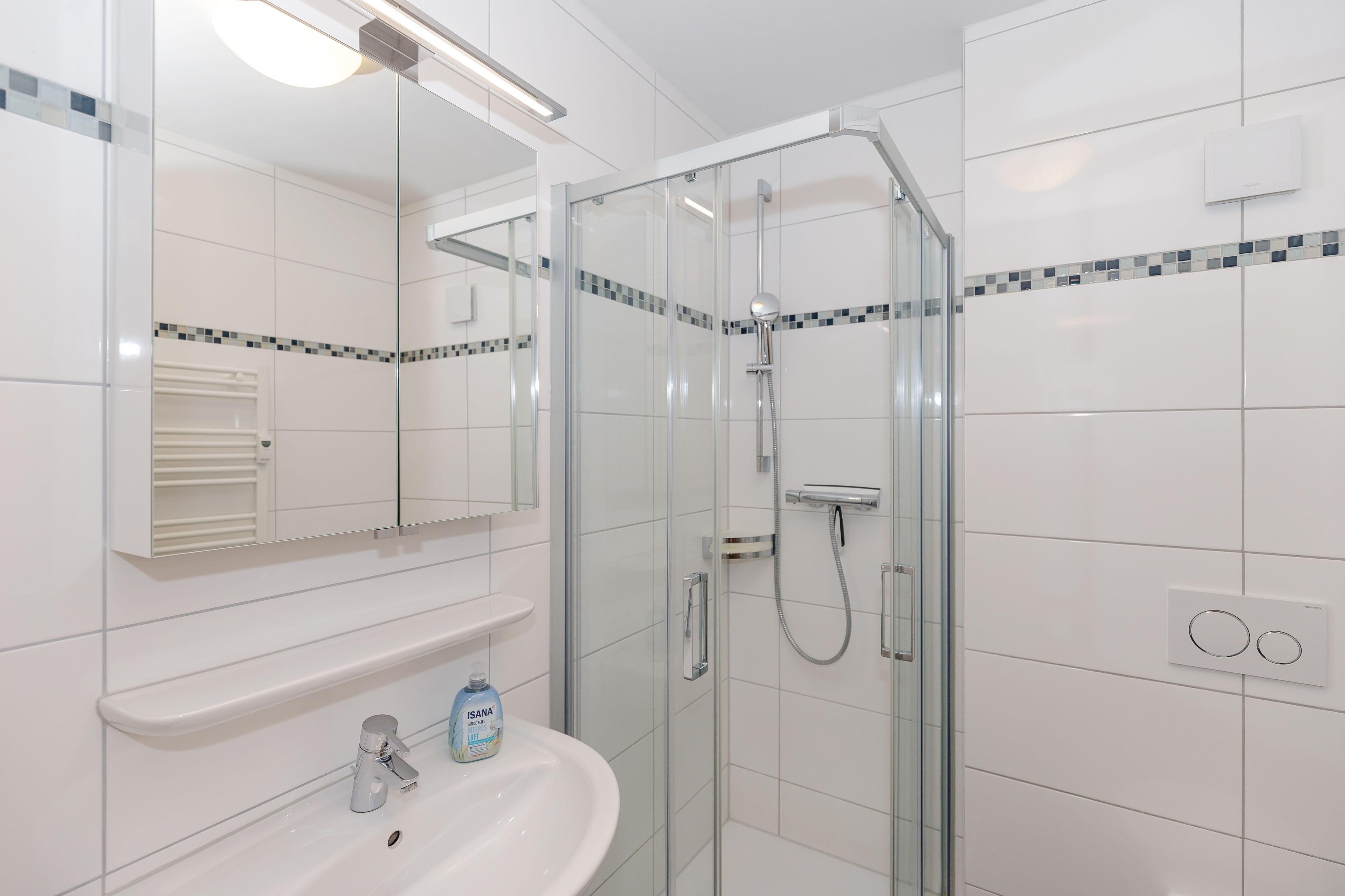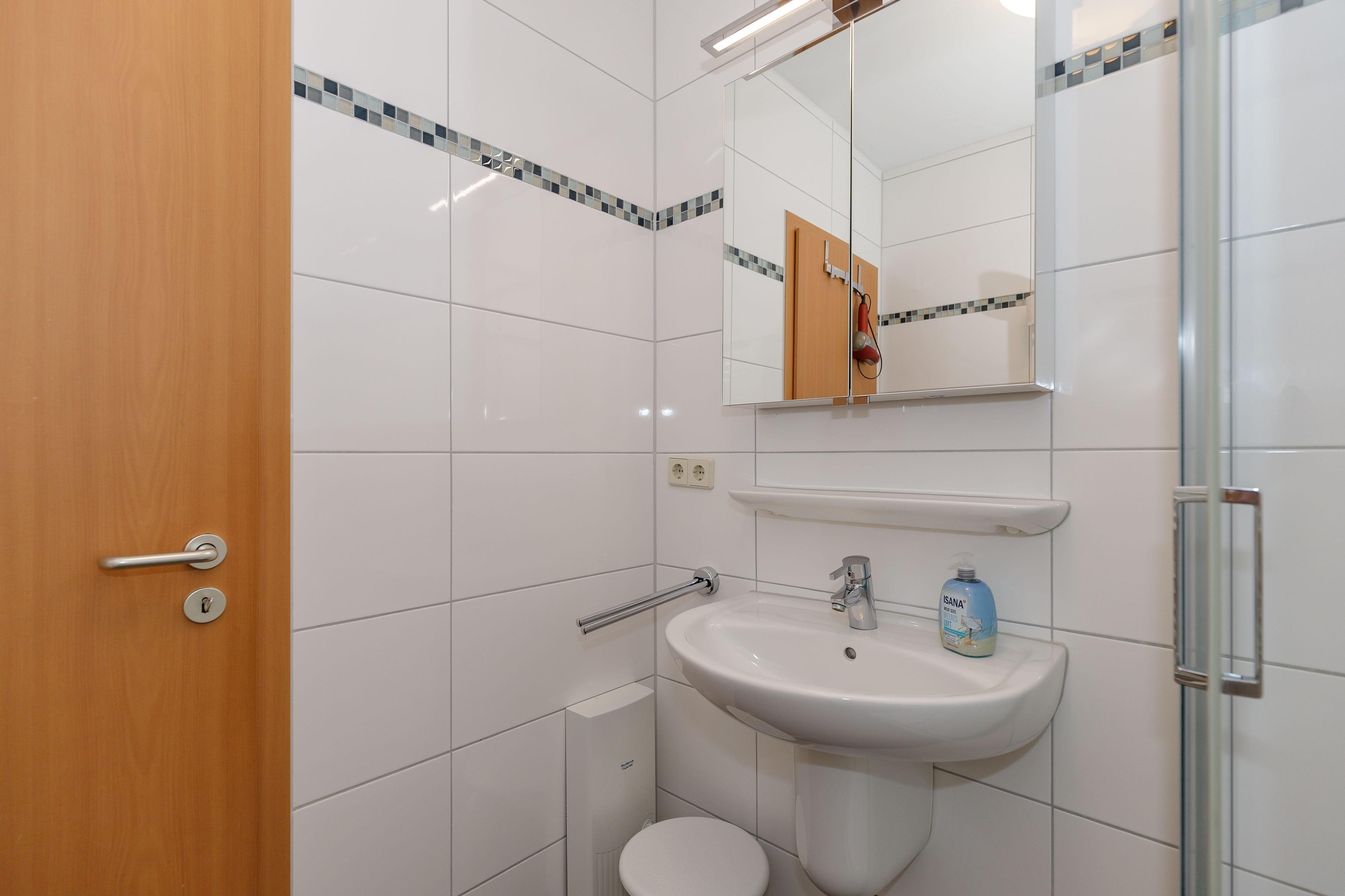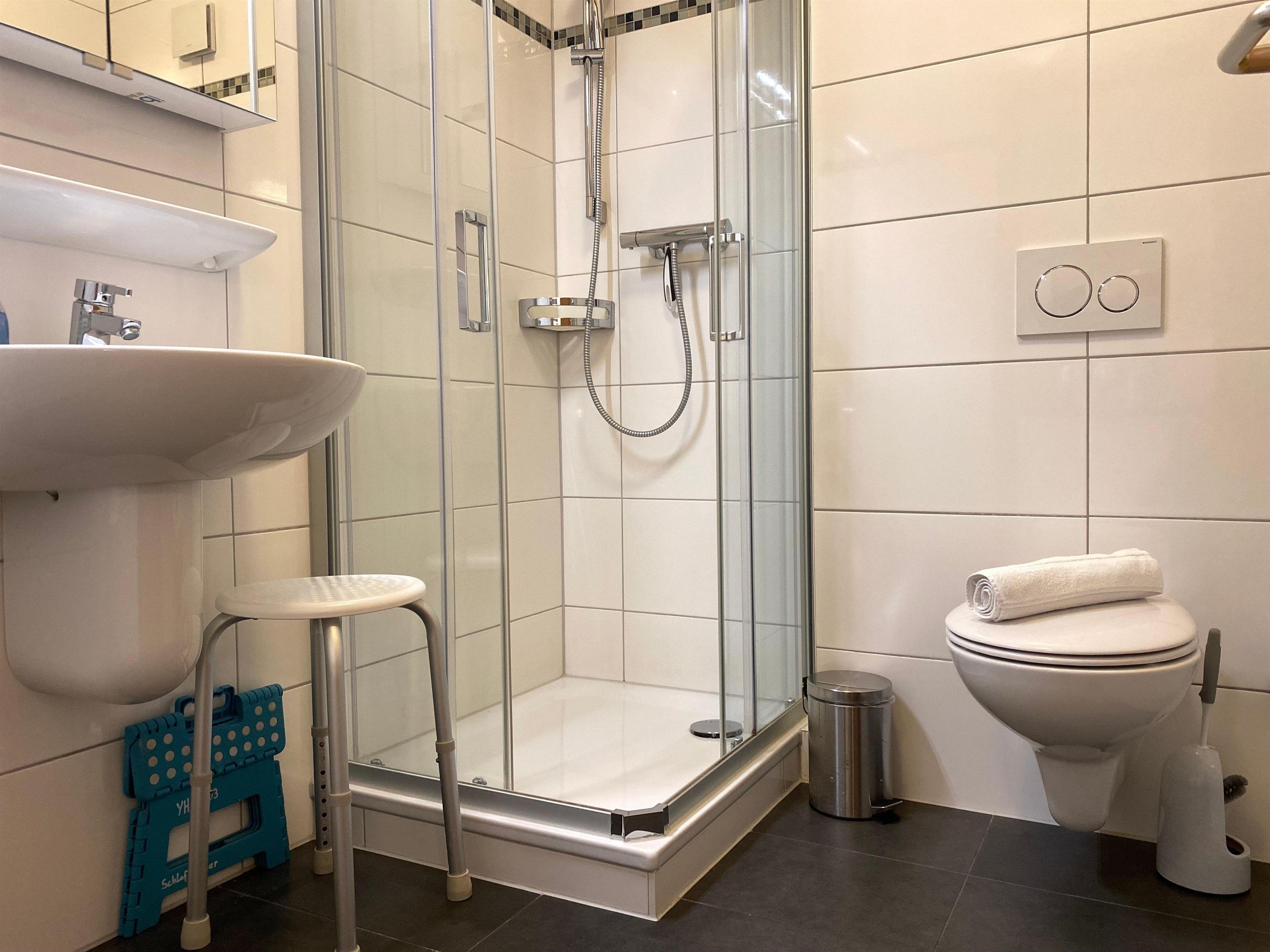 Das Badezimmer verfügt über eine Dusche, ein WC und ein Waschbecken.