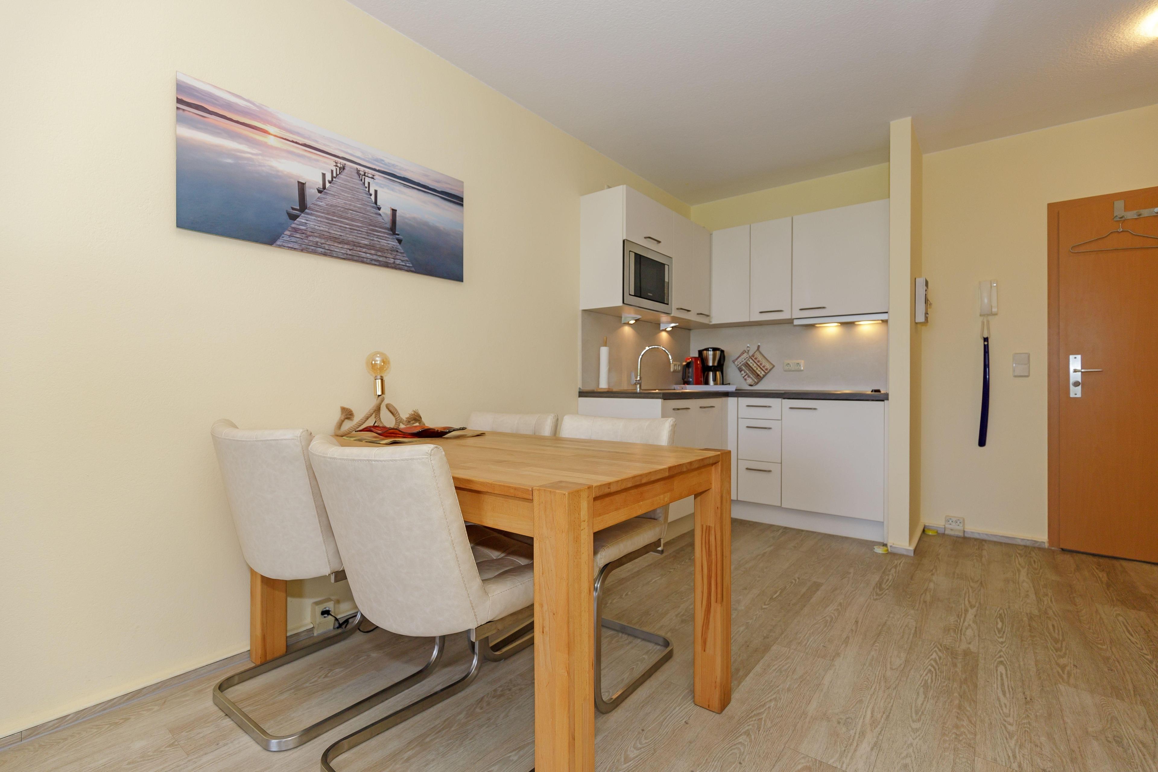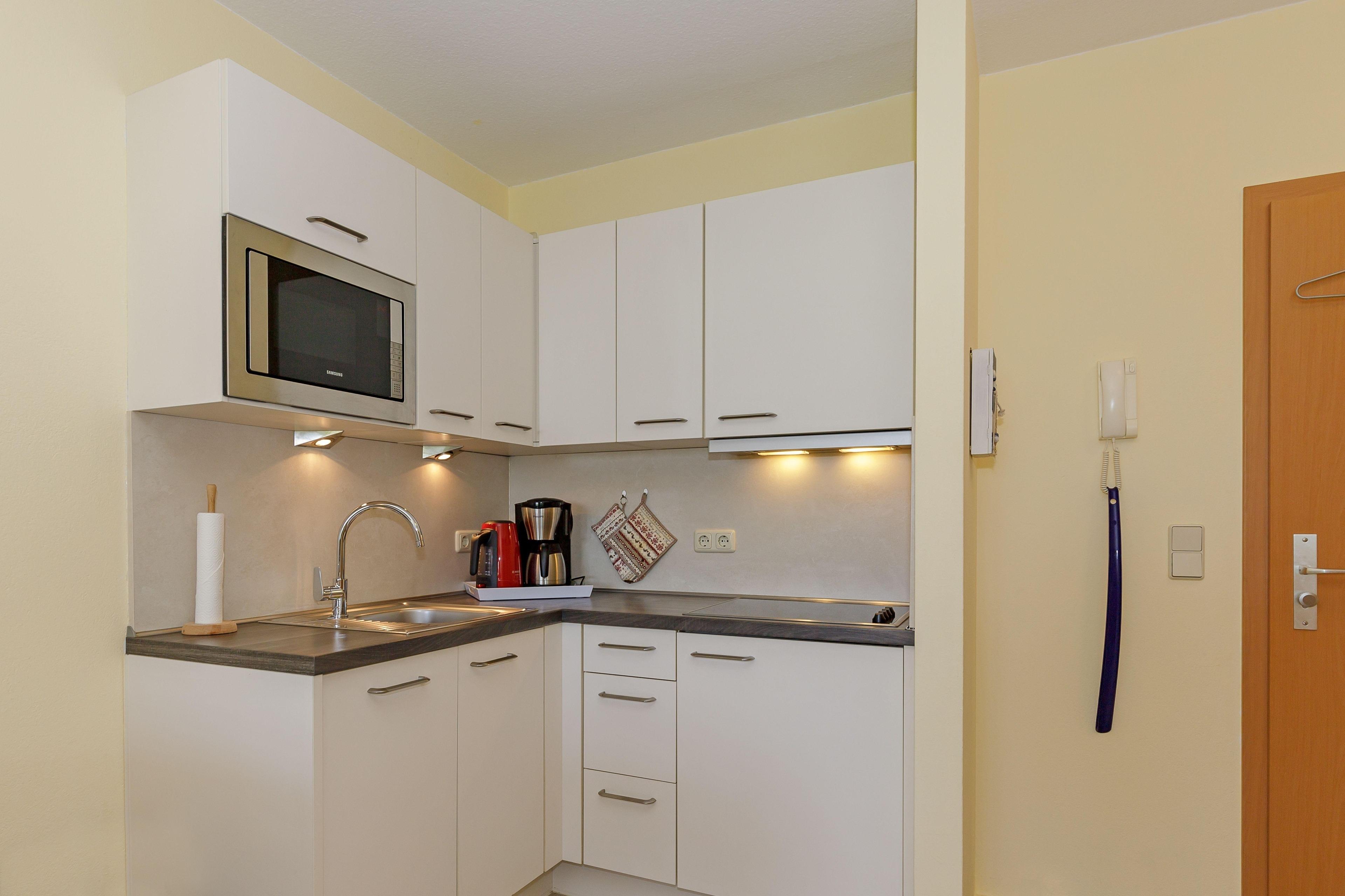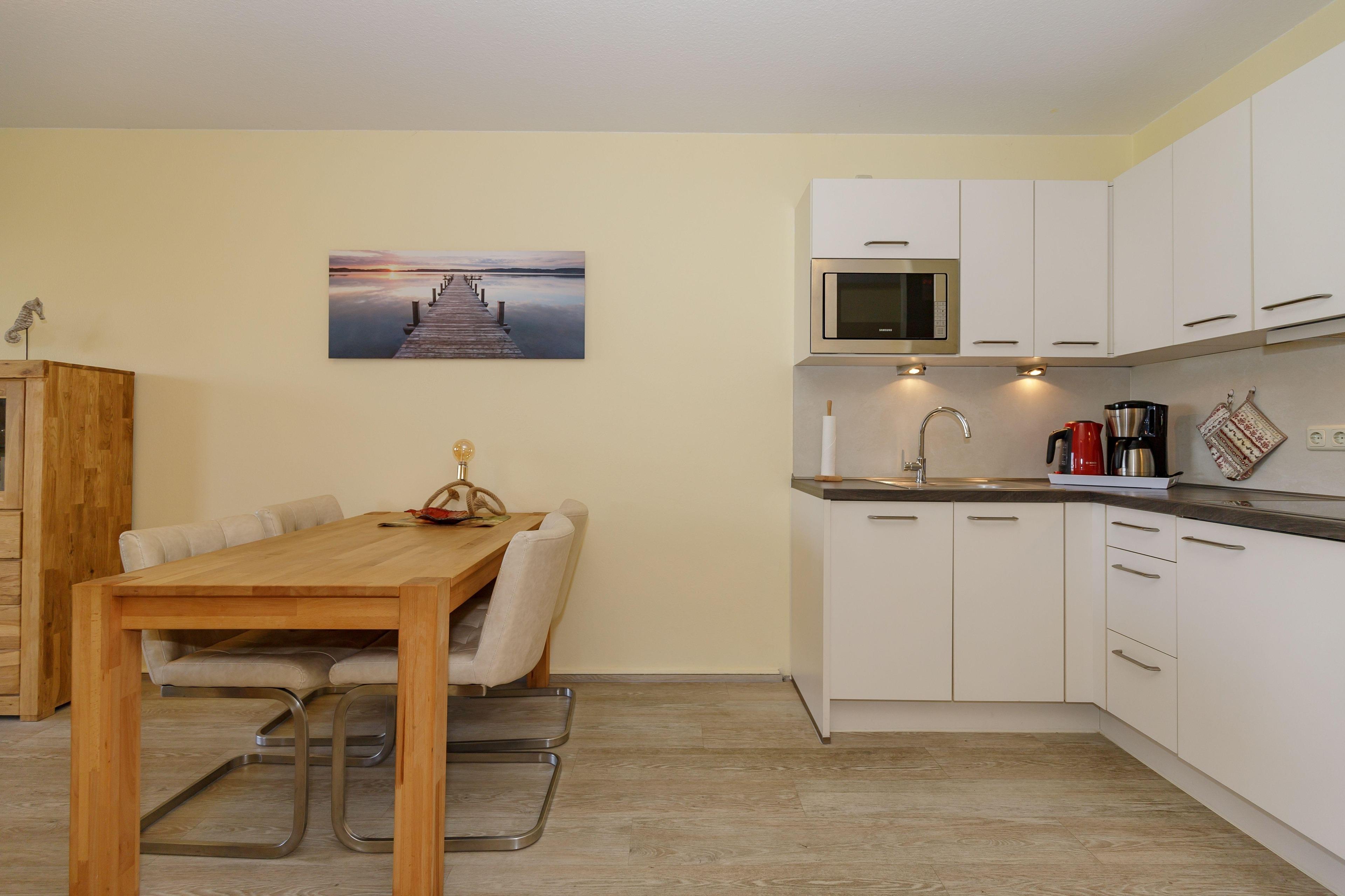 An den Wohnbereich grenzt die voll ausgestattete Küchenzeile, die Ihnen alle Bequemlichkeiten einer modernen Küche bietet. Schnell und problemlos können Sie hier Ihre Lieblingsmahlzeit zaubern. Sie müssen auf nichts verzichten.