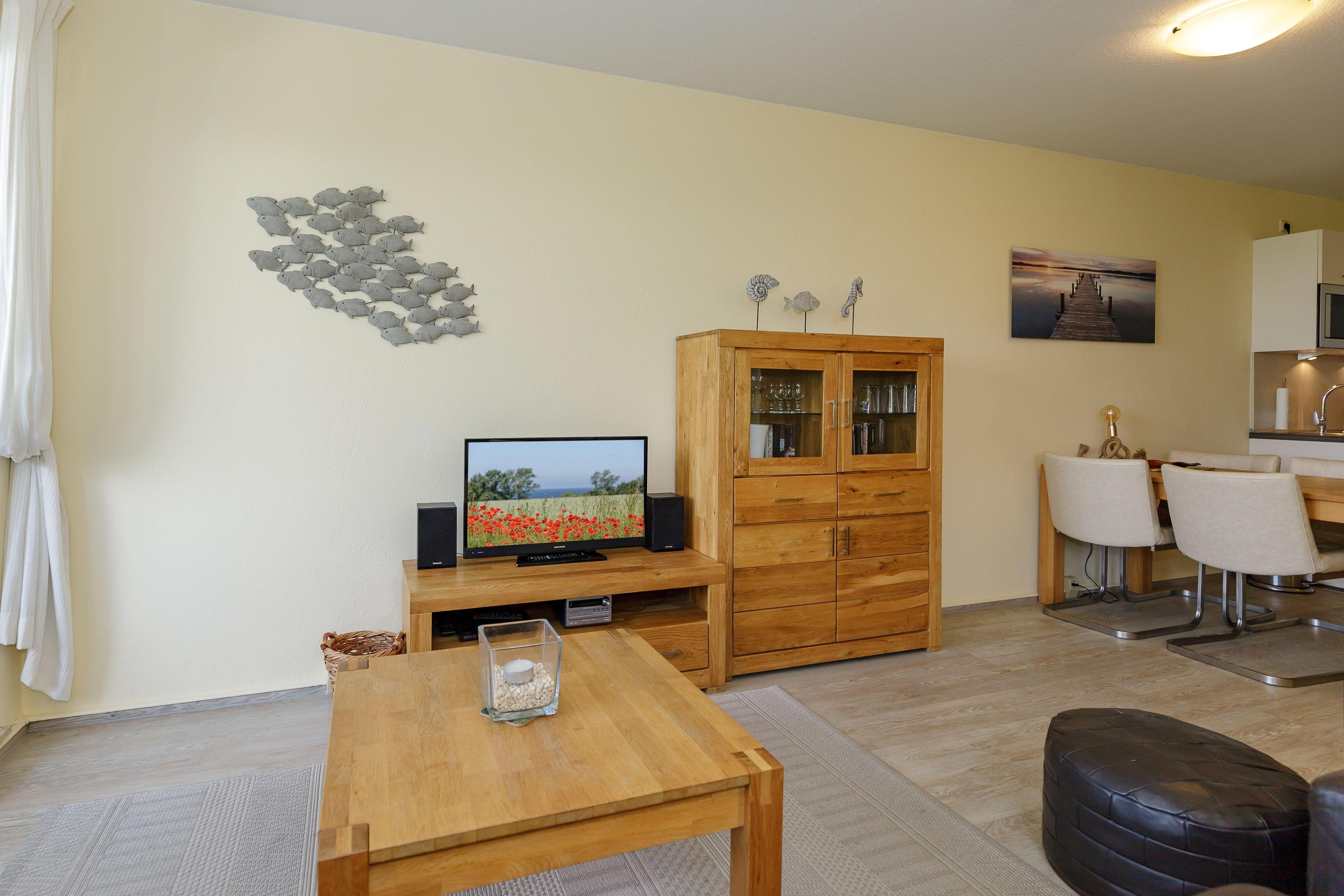 Der gemütlich möblierte Wohnbereich ist mit einem Sofa und einer Sesselecke eingerichtet. Tagsüber ein Mittelpunkt für gemeinsame Stunden, für die Nacht bietet das ausziehbare Sofa einen Schlafplatz für 2 Personen.