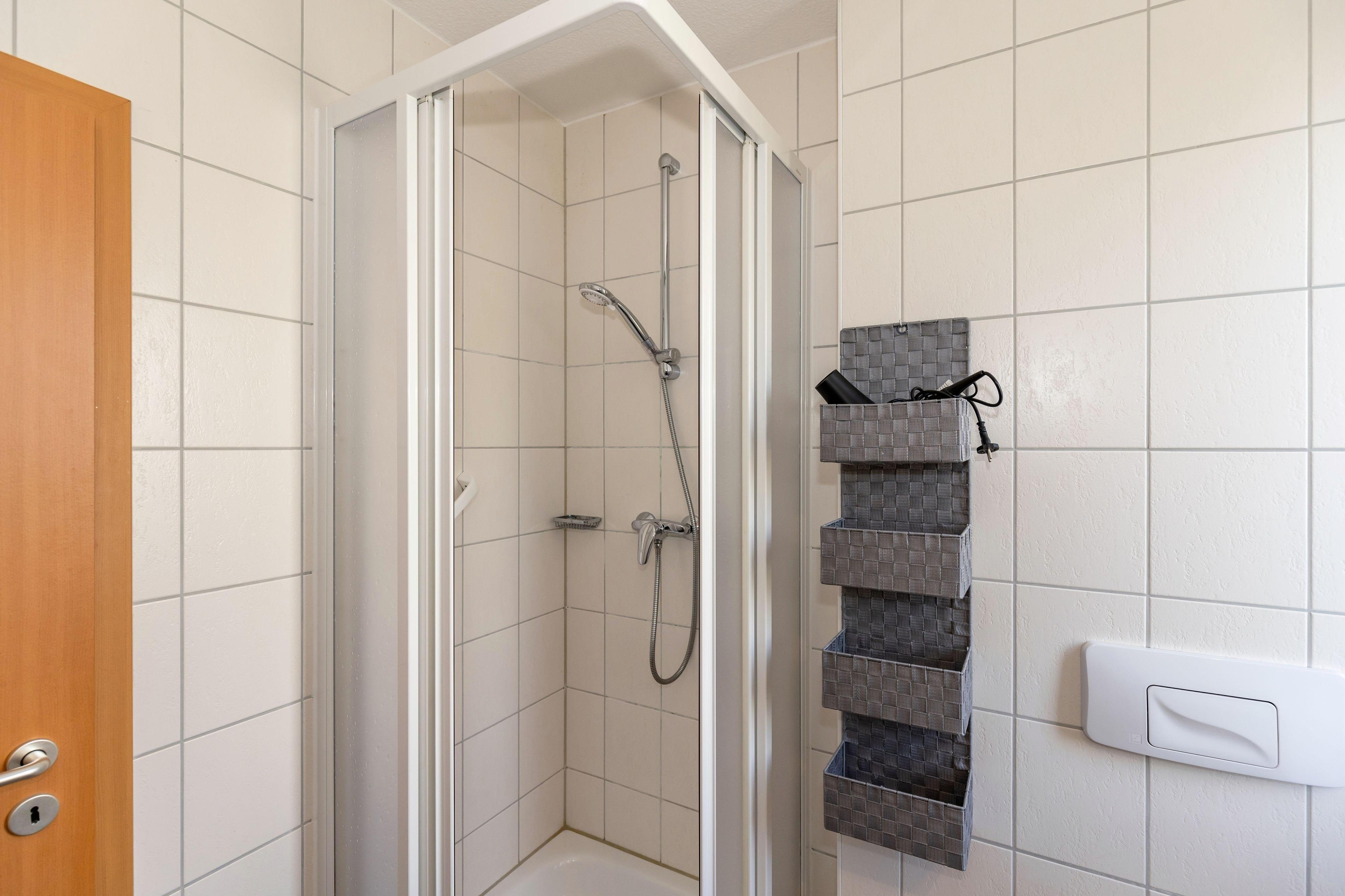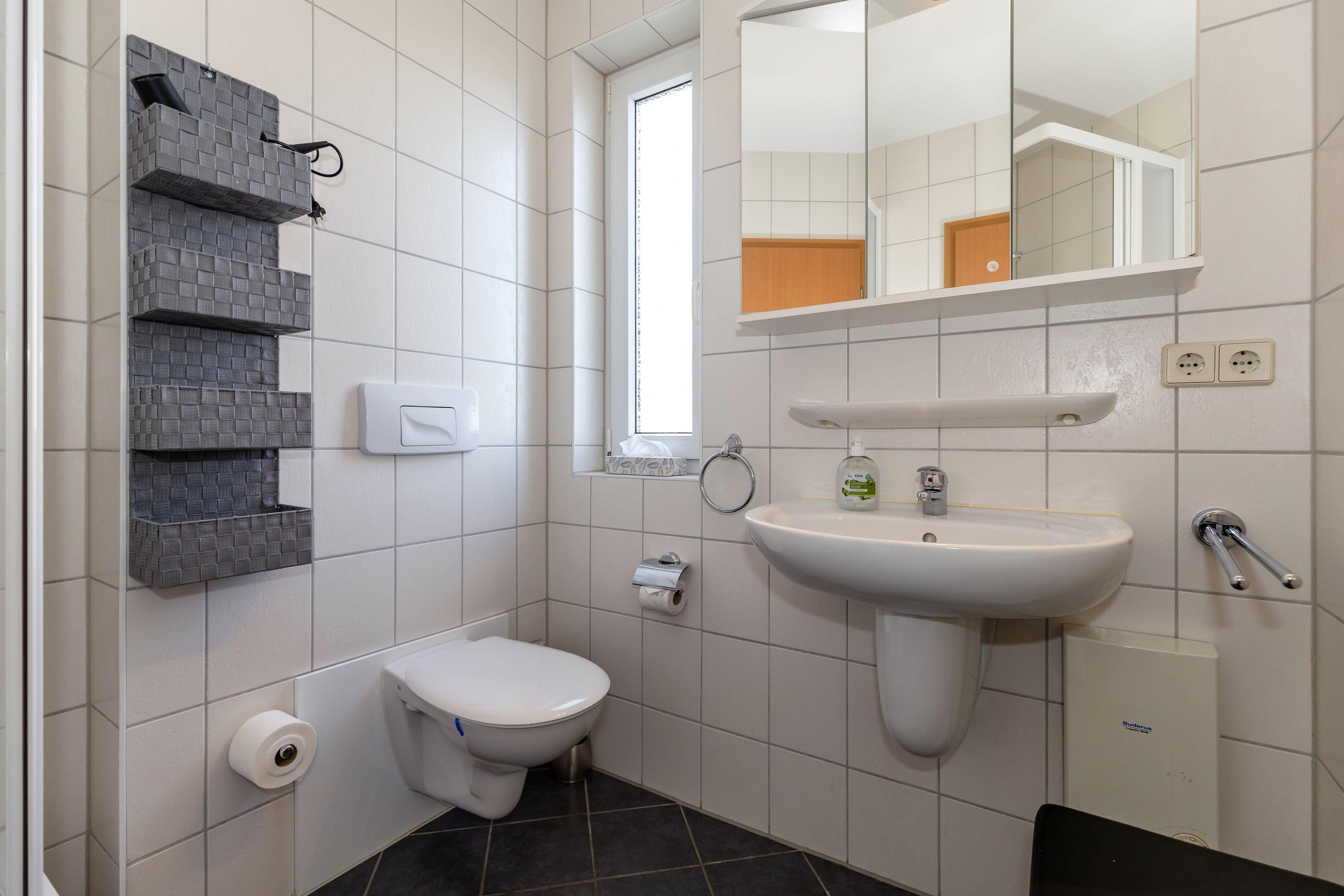Das Badezimmer ist mit einer Dusche, einem Waschbecken und einem WC ausgestattet.