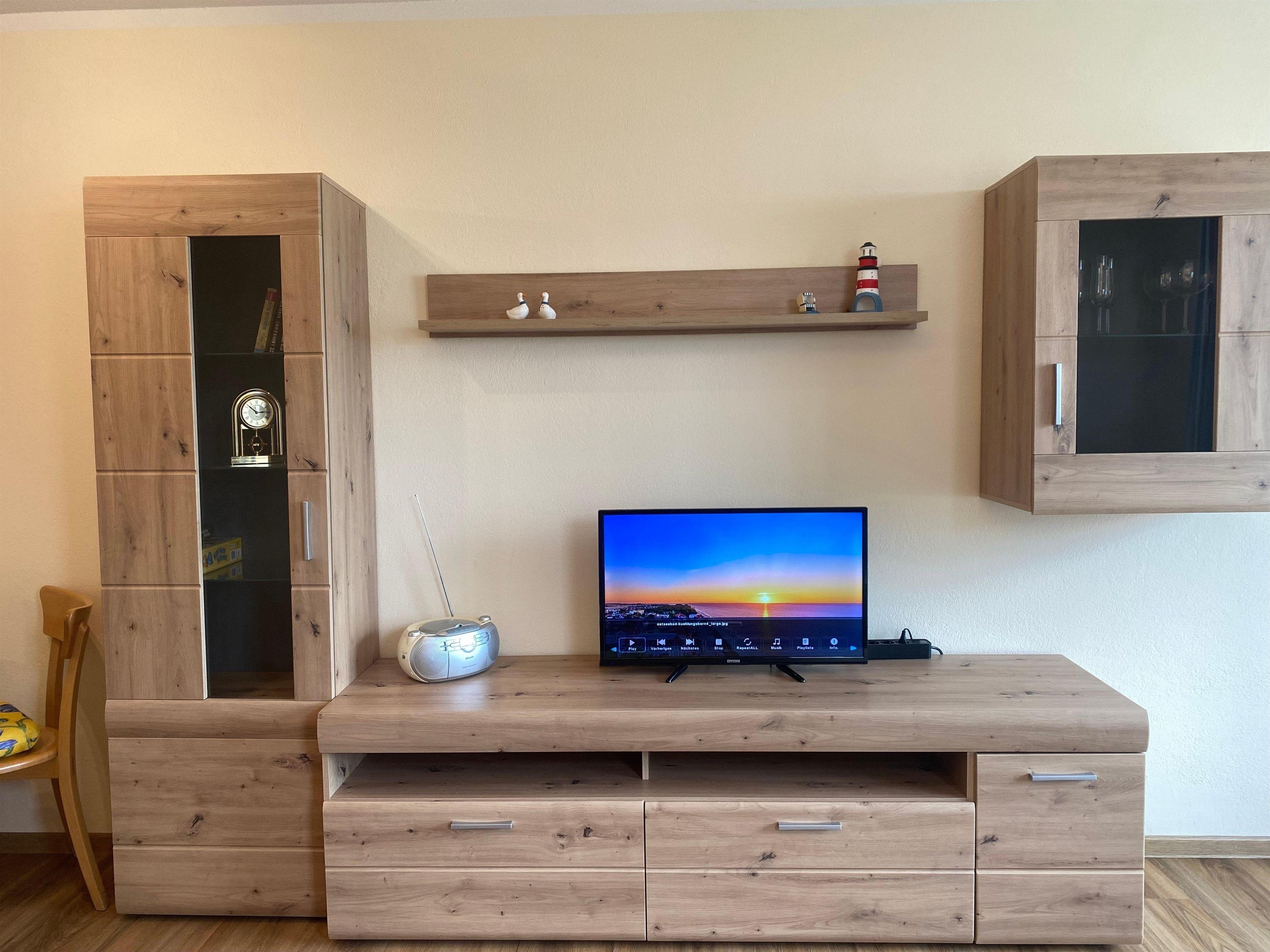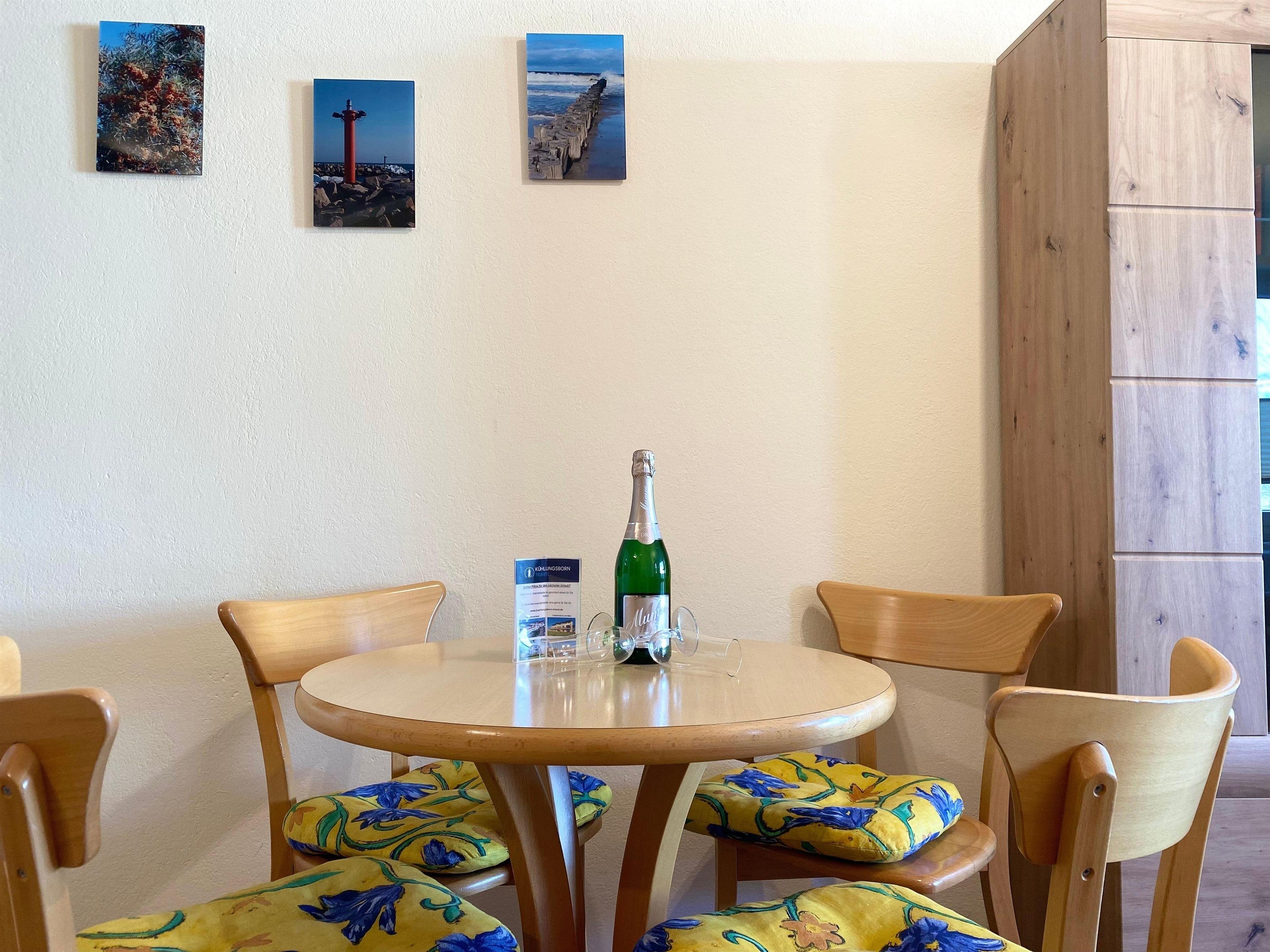 An das Wohnzimmer grenzt der Küchen-/Essbereich. Die kleine Küchenzeile ist voll ausgestattet, hier müssen Sie auf nichts verzichten. Am Esstisch mit 4 Stühlen können die gemeinsamen Mahlzeiten eingenommen werden.