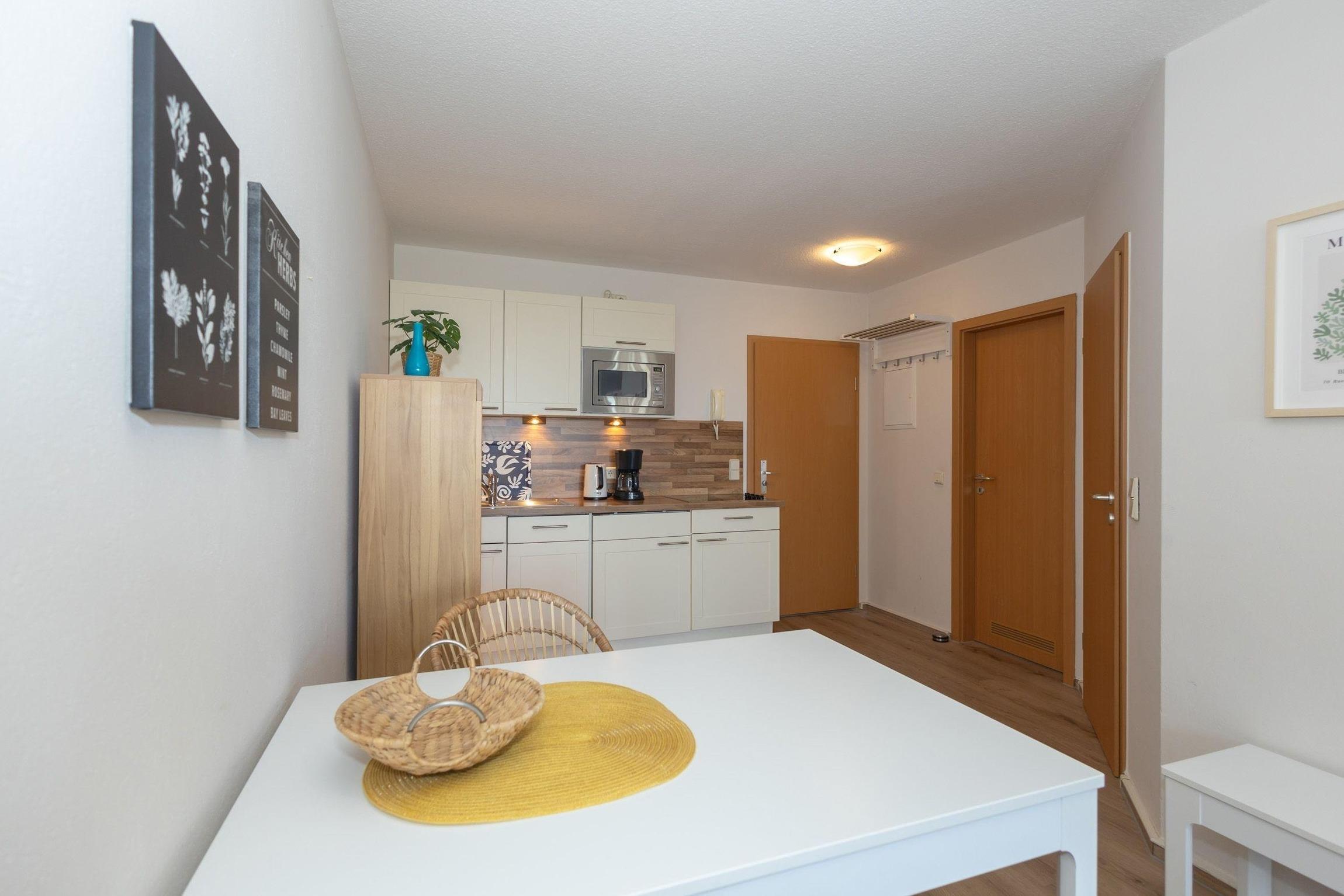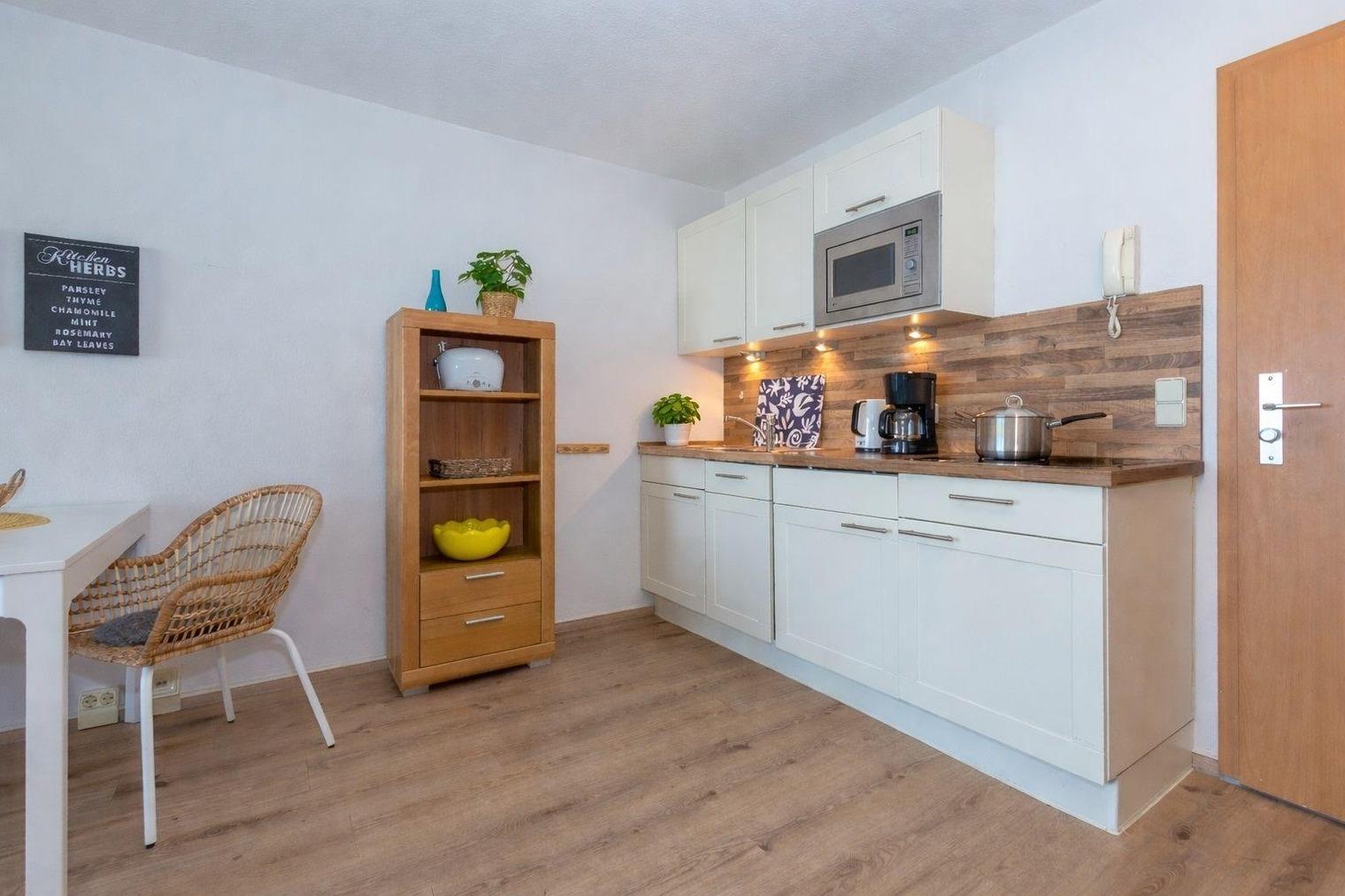 An den Wohnzimmer grenzt die kleine, voll ausgestattete Küchenzeile, schnell können Sie hier Ihre Lieblingsmahlzeit zaubern.
