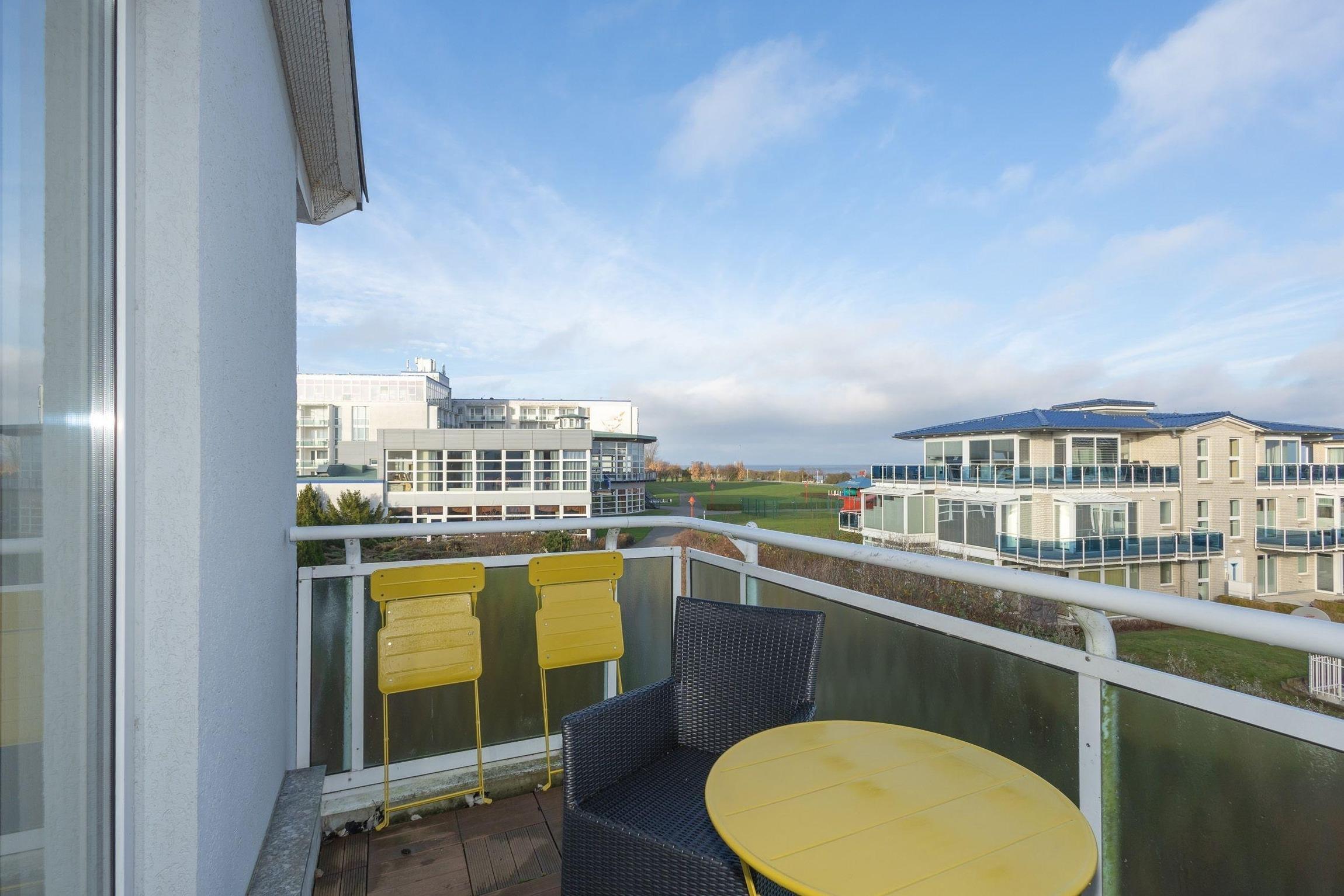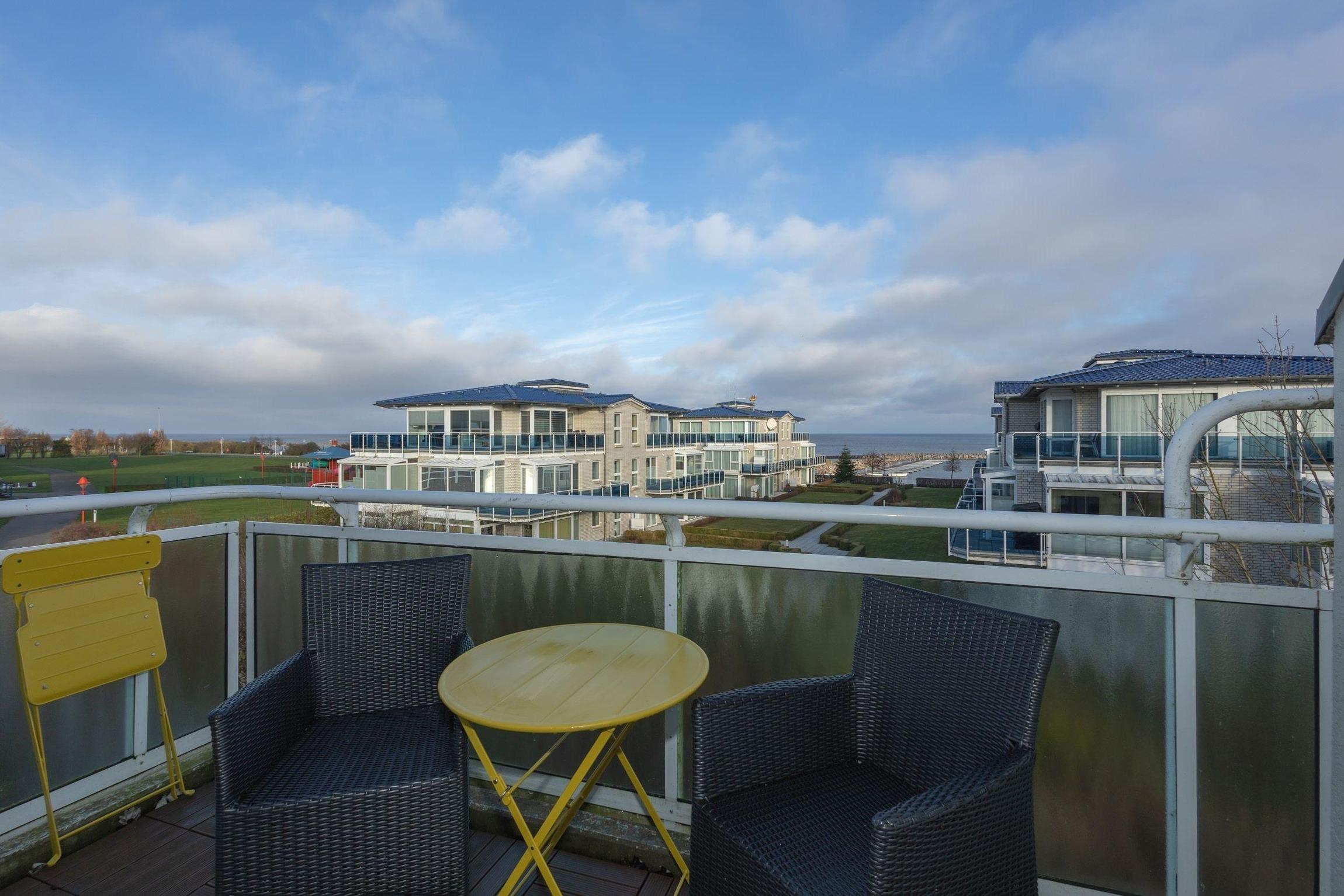 An Ihre Wohnung grenzt ein Balkon zur Nordseite mit Meerblick. Mit hübschen Möbeln ausgestattet, lädt der Balkon zum gemeinsamen Verweilen ein, so können Sie ein wenig Sonne genießen und bei einem leckeren Getränk am Abend einen ereignisreichen Tag gemütlich ausklingen lassen.