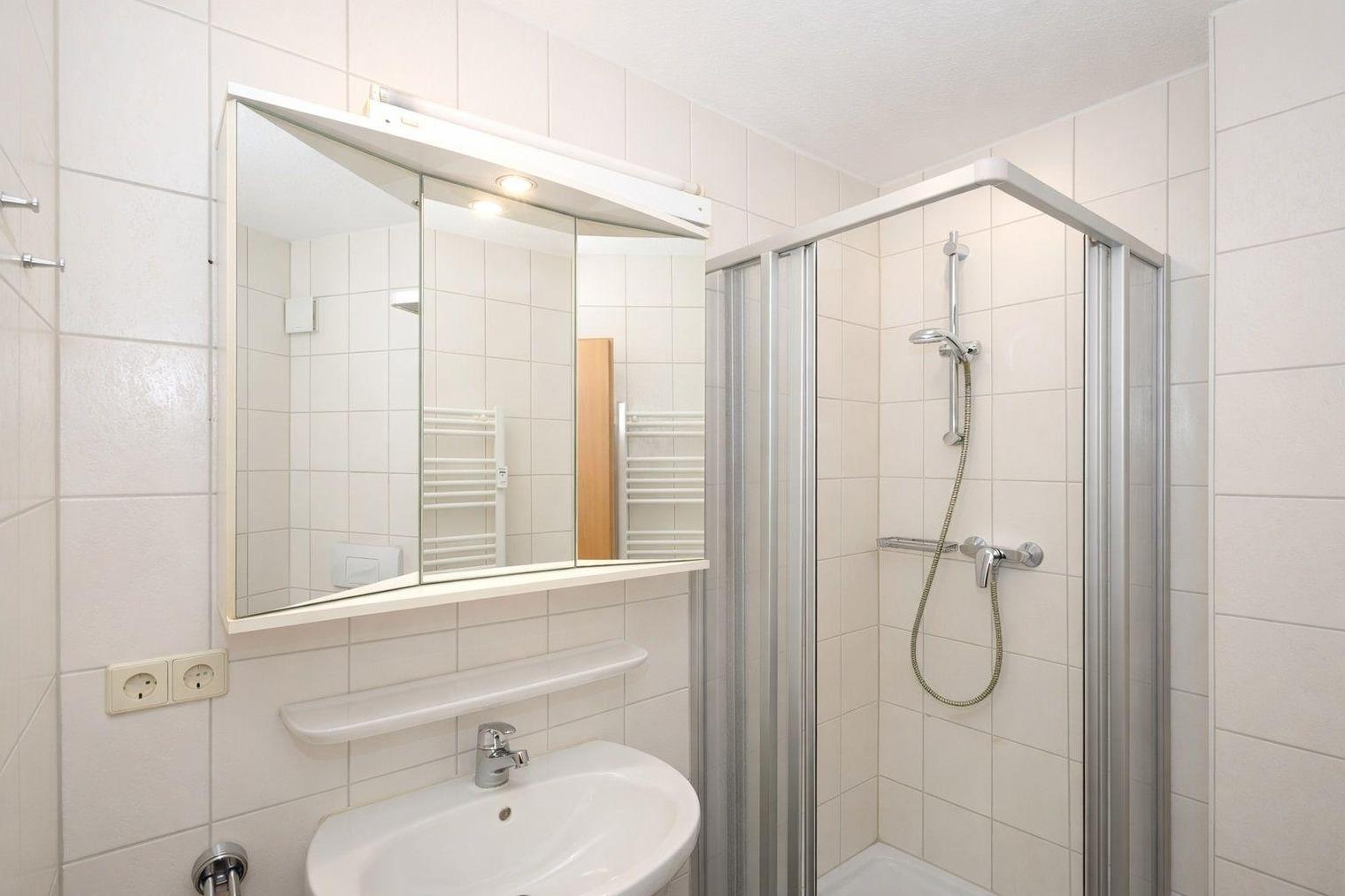 Das Badezimmer ist mit einer Dusche, einem WC, einem Waschbecken und einem Handtuchheizkörper ausgestattet.