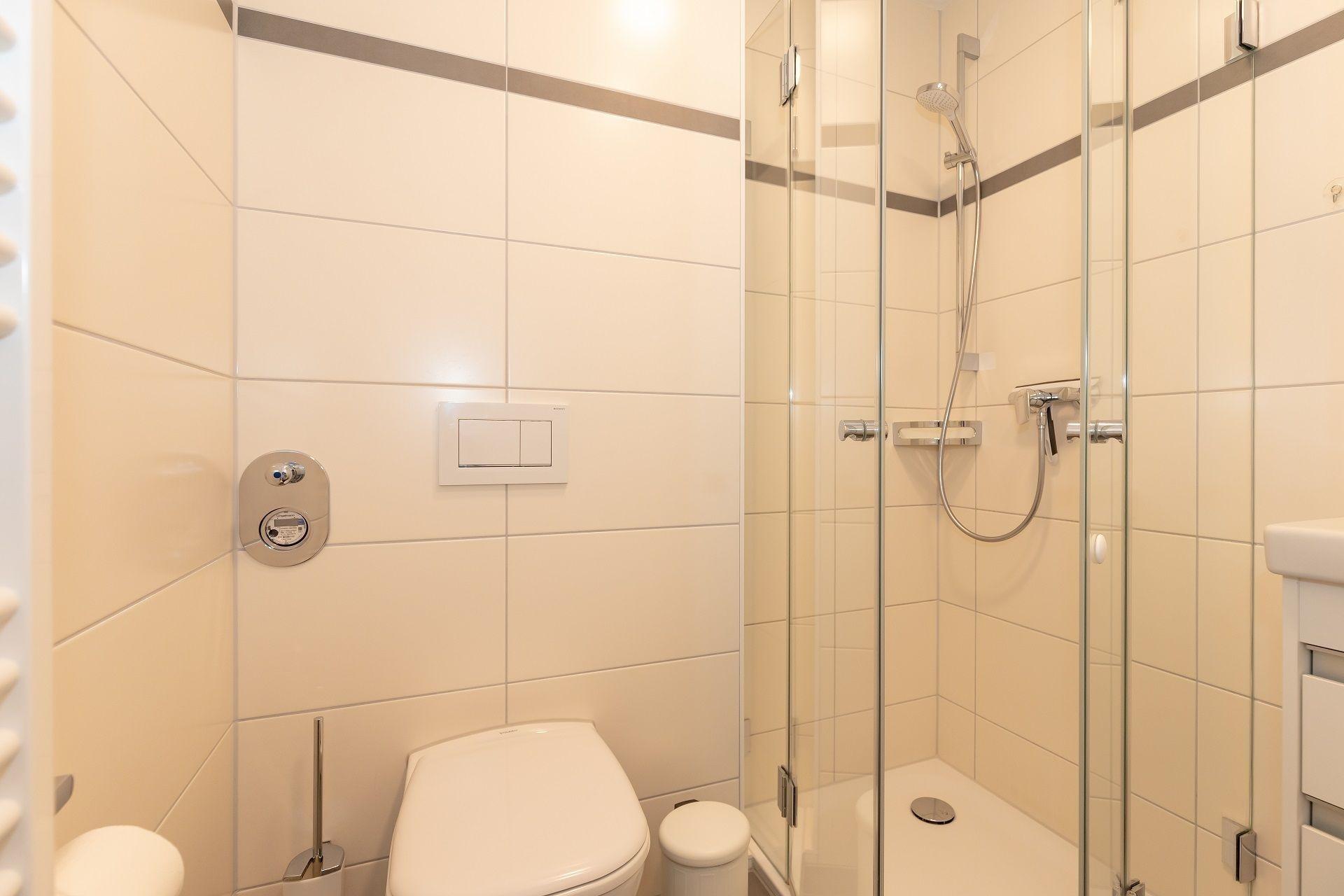 Das Badezimmer verfügt über eine Dusche, ein WC sowie einen Waschtisch mit Unterschrank für Ihre Badutensilien.