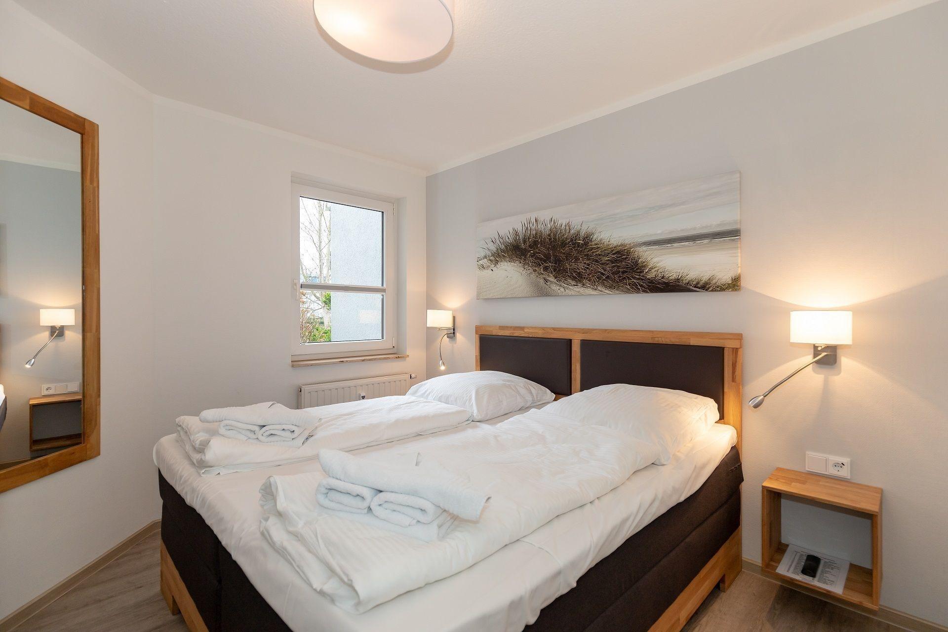 Das separate Schlafzimmer ist mit einem komfortablen Boxspringbett eingerichtet - hier liegen Sie richtig! Für Ihre Urlaubsgarderobe steht Ihnen ein geräumiger Kleiderschrank zur Verfügung. Ein zweiter Fernseher ist ebenfalls vorhanden.