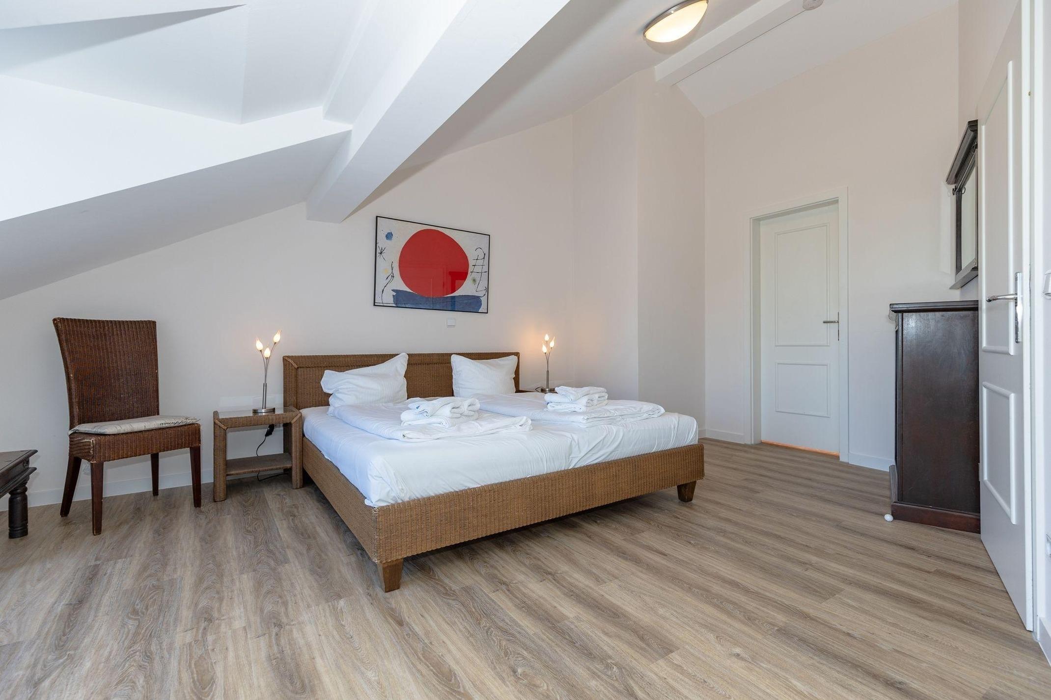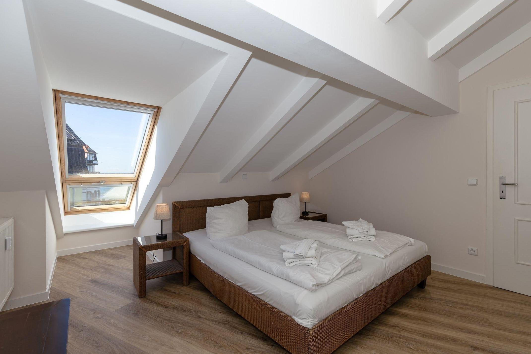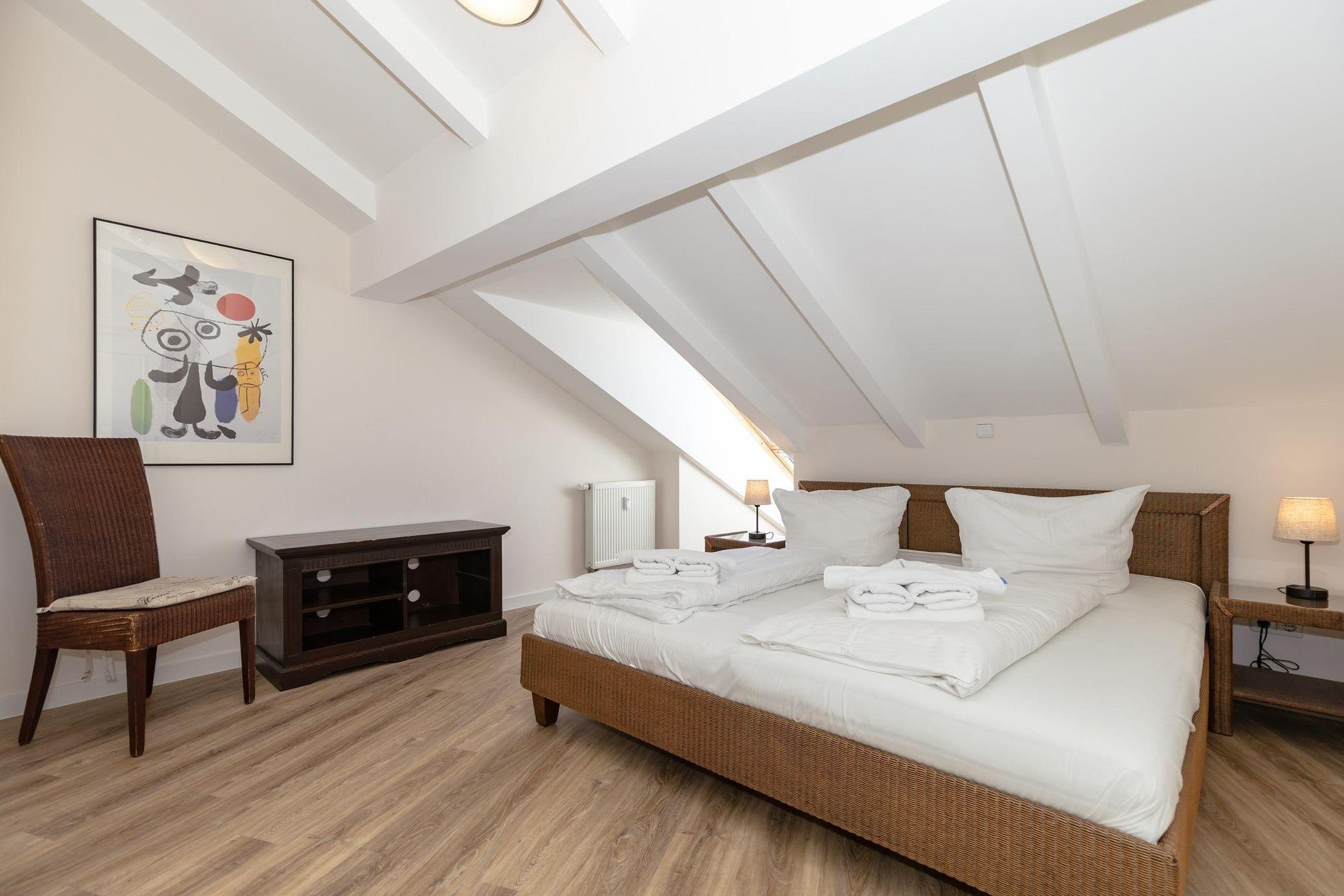 In den zwei separaten Schlafzimmern im Obergeschoss der Wohnung finden Sie jeweils ein großes, bequemes Doppelbett. Das zweite Schlafzimmer besitzt einen begehbaren Kleiderschrank. Im ersten Schlafzimmer befindet sich ein geräumiger Einbauschrank.