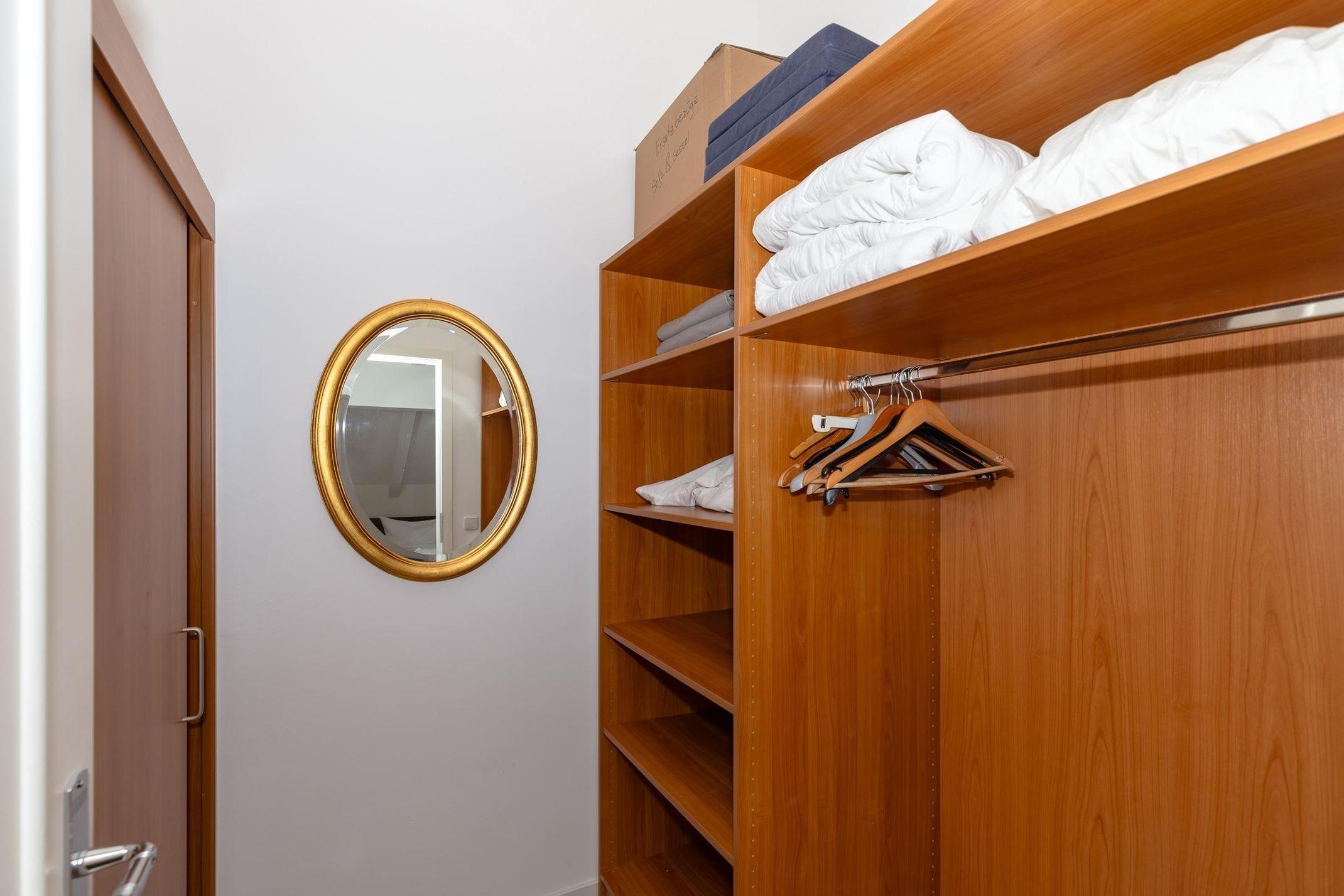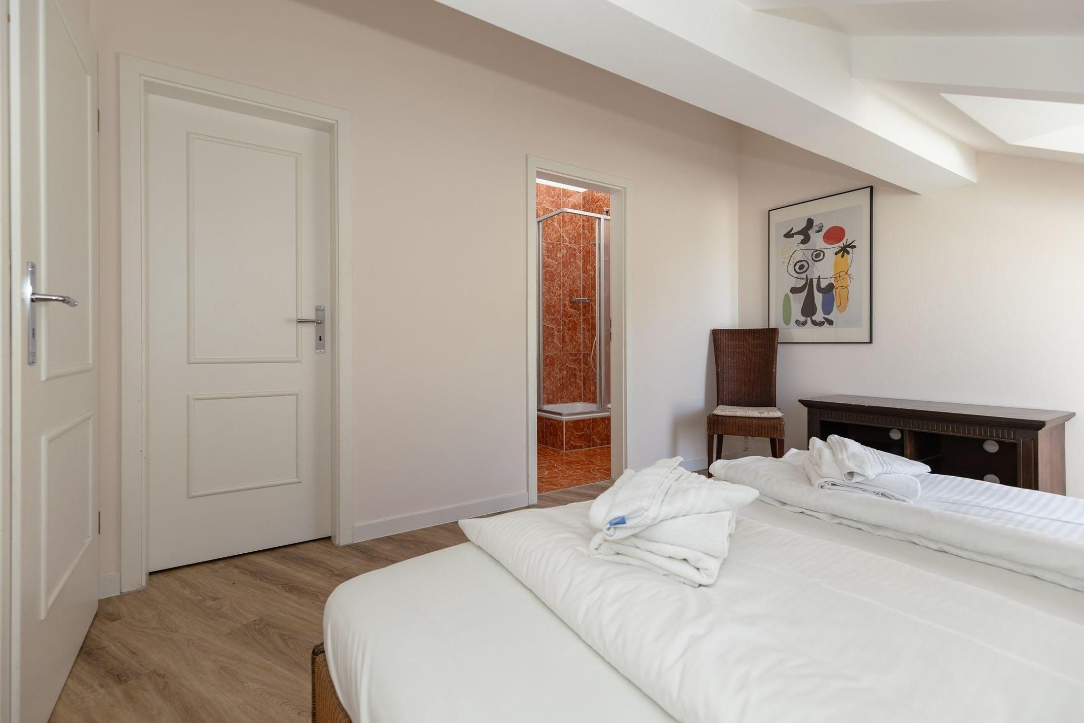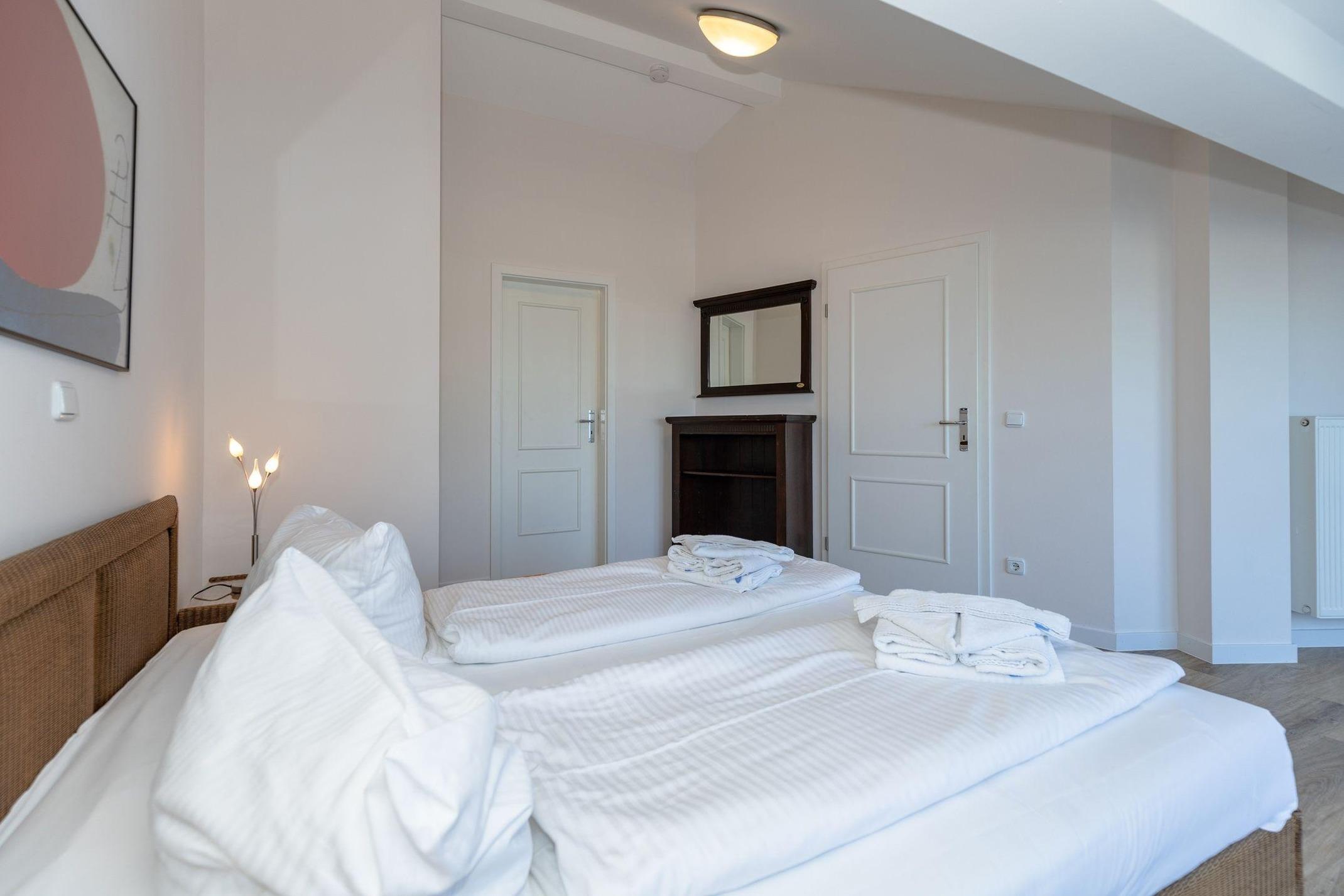 In den zwei separaten Schlafzimmern im Obergeschoss der Wohnung finden Sie jeweils ein großes, bequemes Doppelbett. Das zweite Schlafzimmer besitzt einen begehbaren Kleiderschrank. Im ersten Schlafzimmer befindet sich ein geräumiger Einbauschrank.