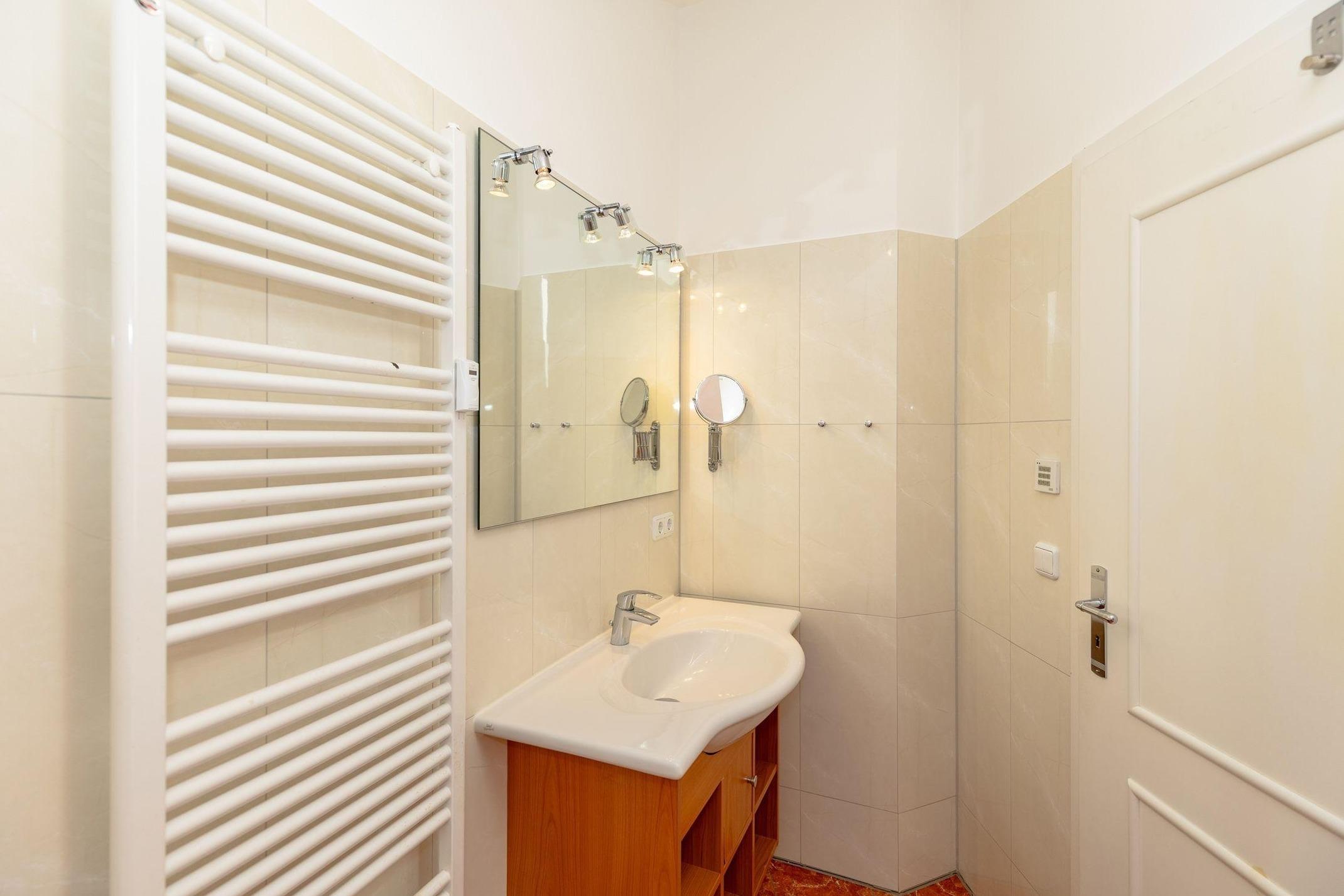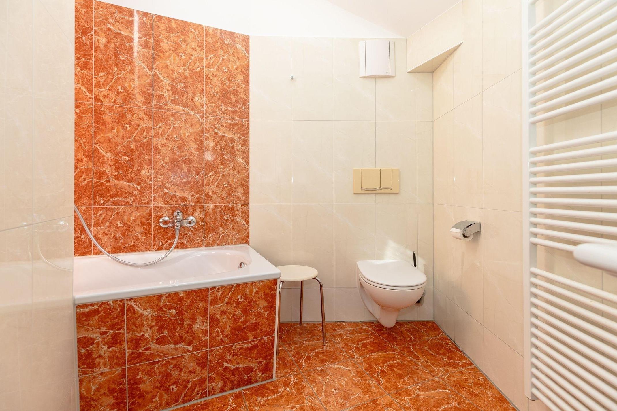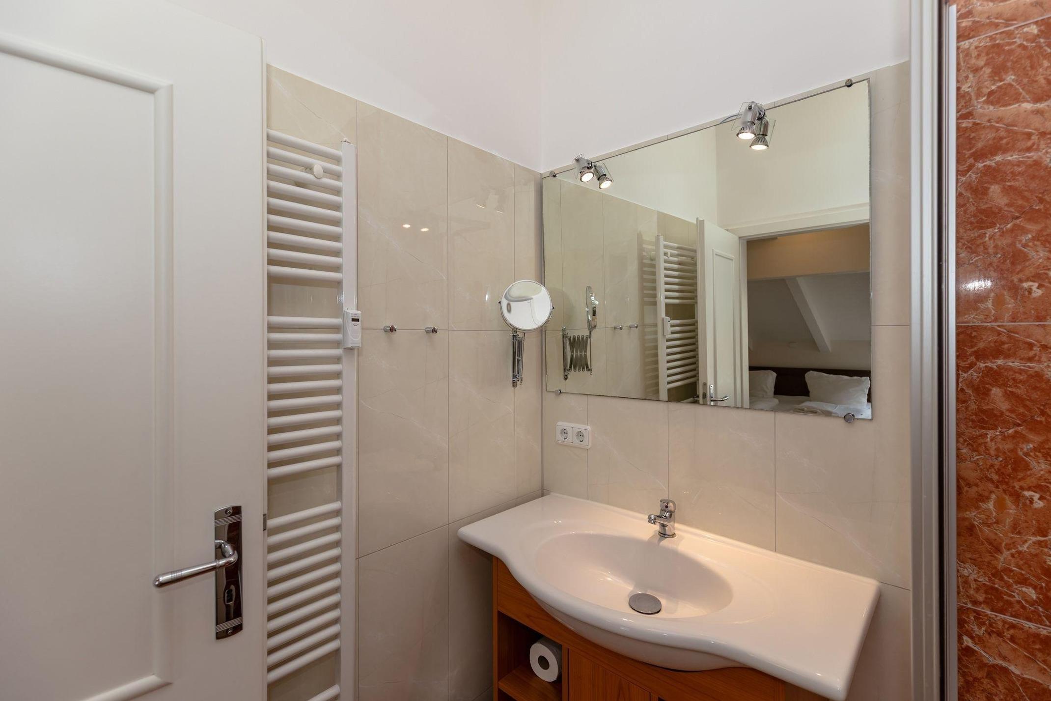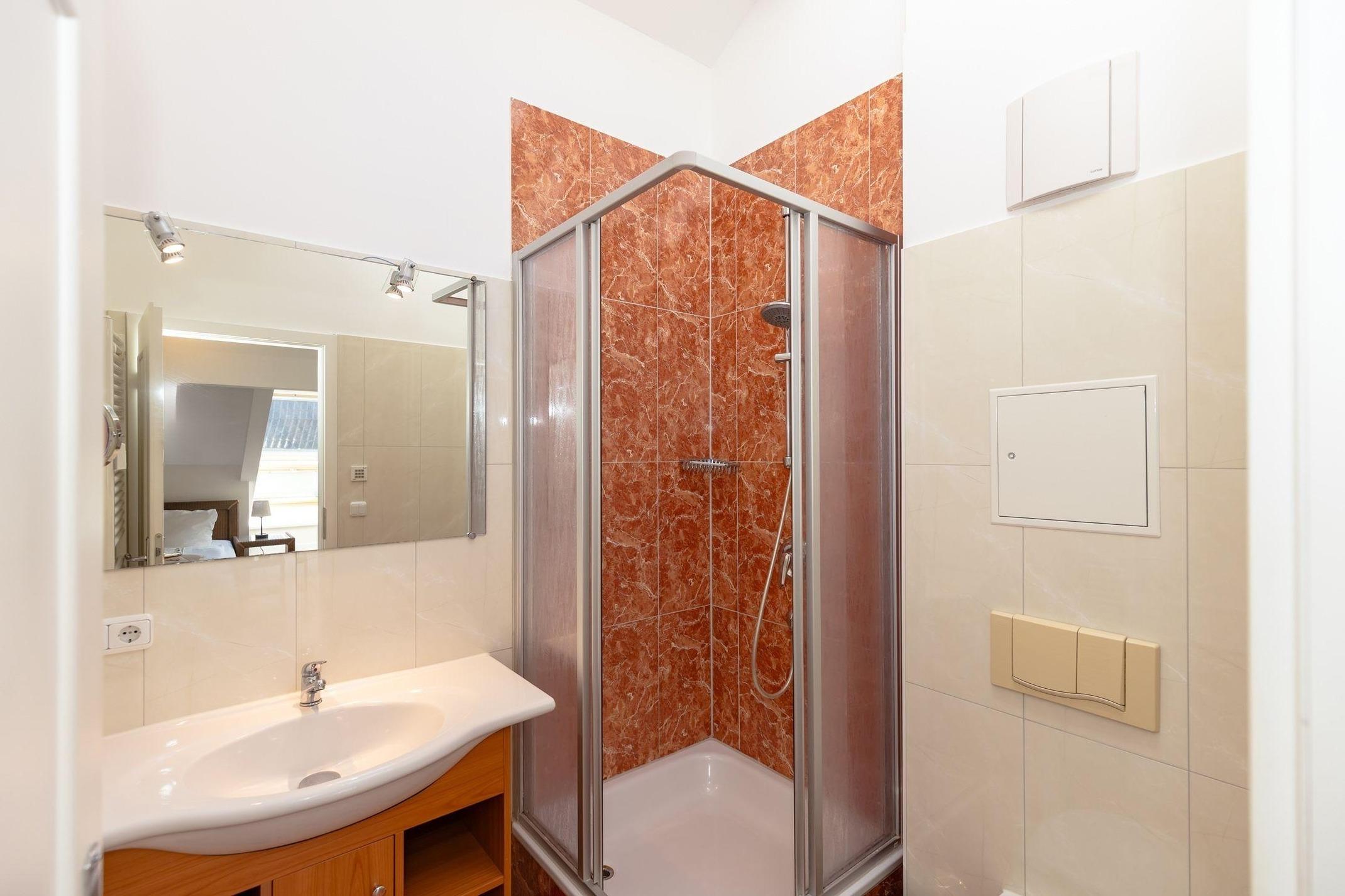 Das Apartment verfügt über insgesamt 3 Bäder. Eines befindet sich im unteren Bereich der Wohnung mit WC und jeweils ein Badezimmer an beiden Schlafzimmern angrenzend. Ein Bad ist mit einer Badewanne und das zweite mit einer Dusche ausgestattet.