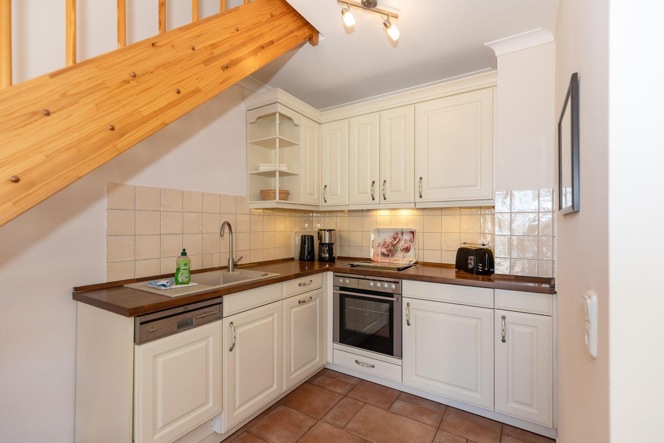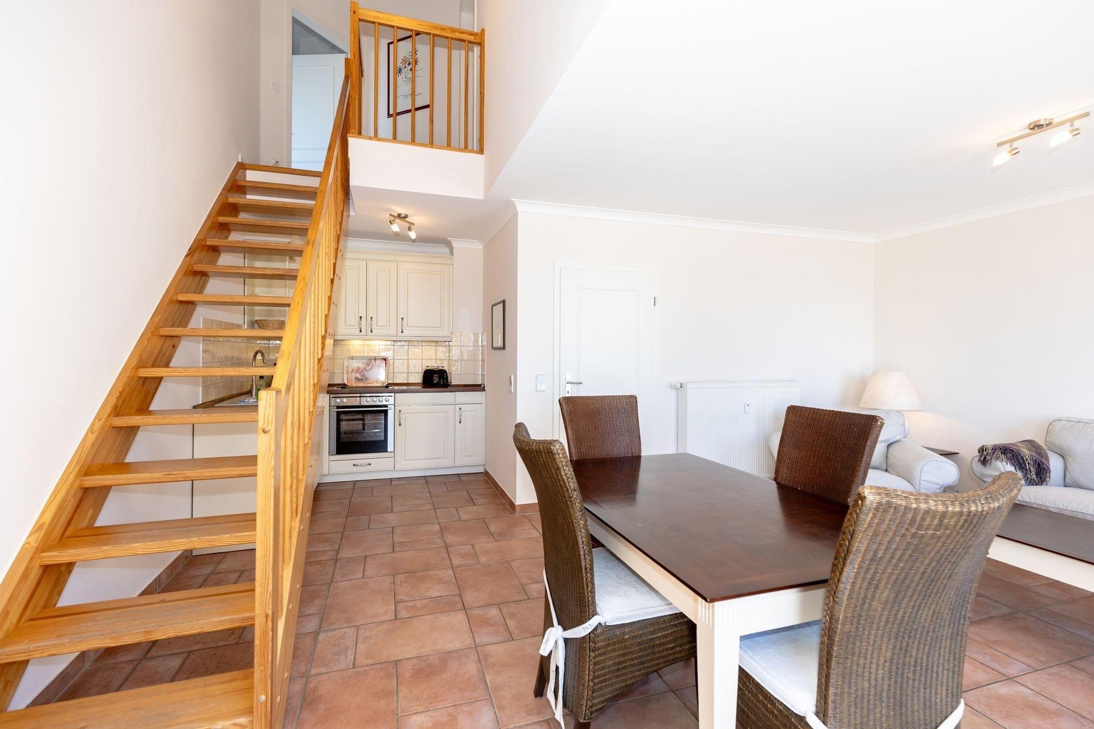 In dem zur Seeseite ausgerichteten hellen Wohnzimmer mit offenem Wohn- und Essbereich, befindet sich eine voll ausgestattete Küche, hier bleiben keine Wünsche offen.