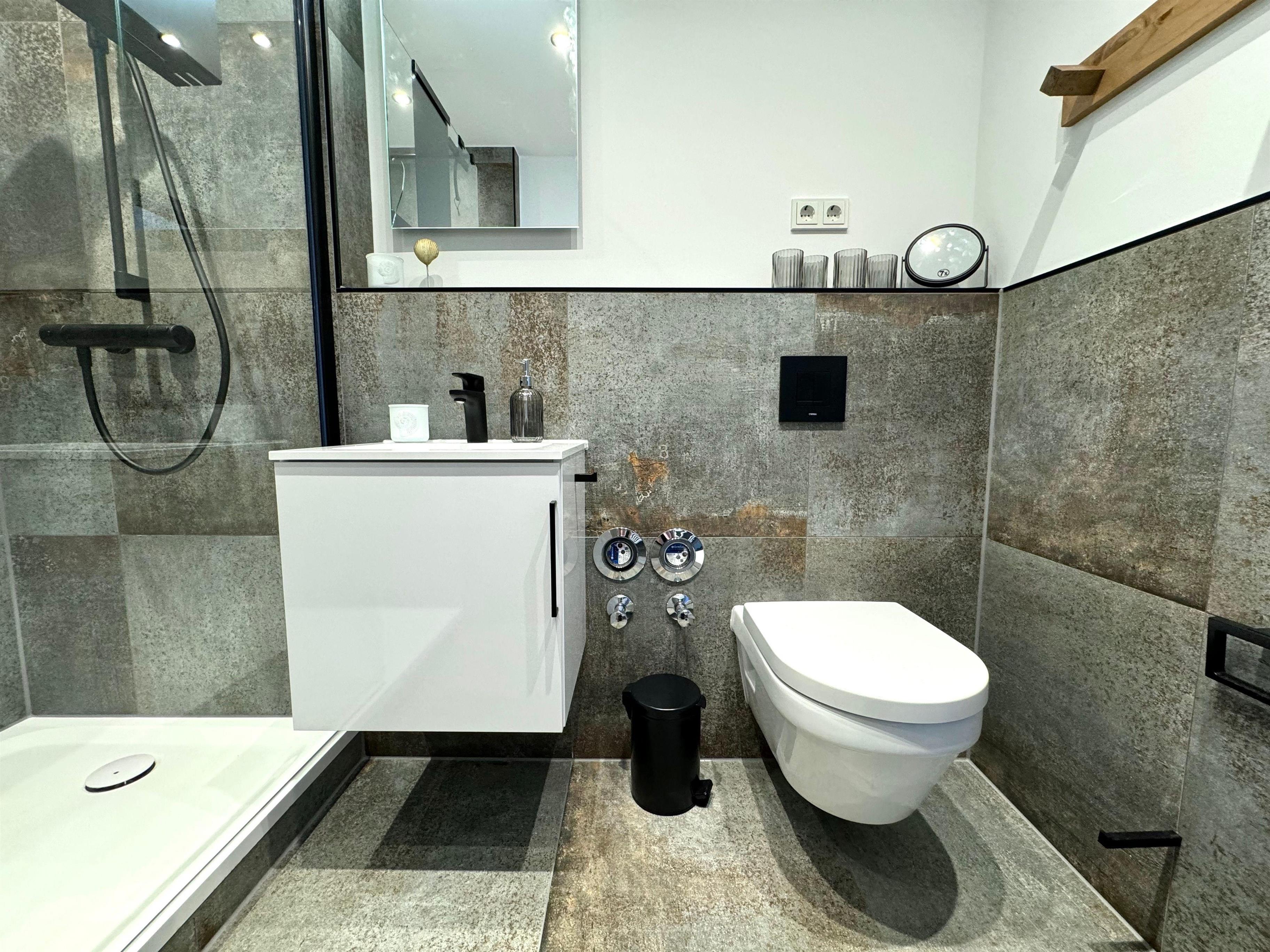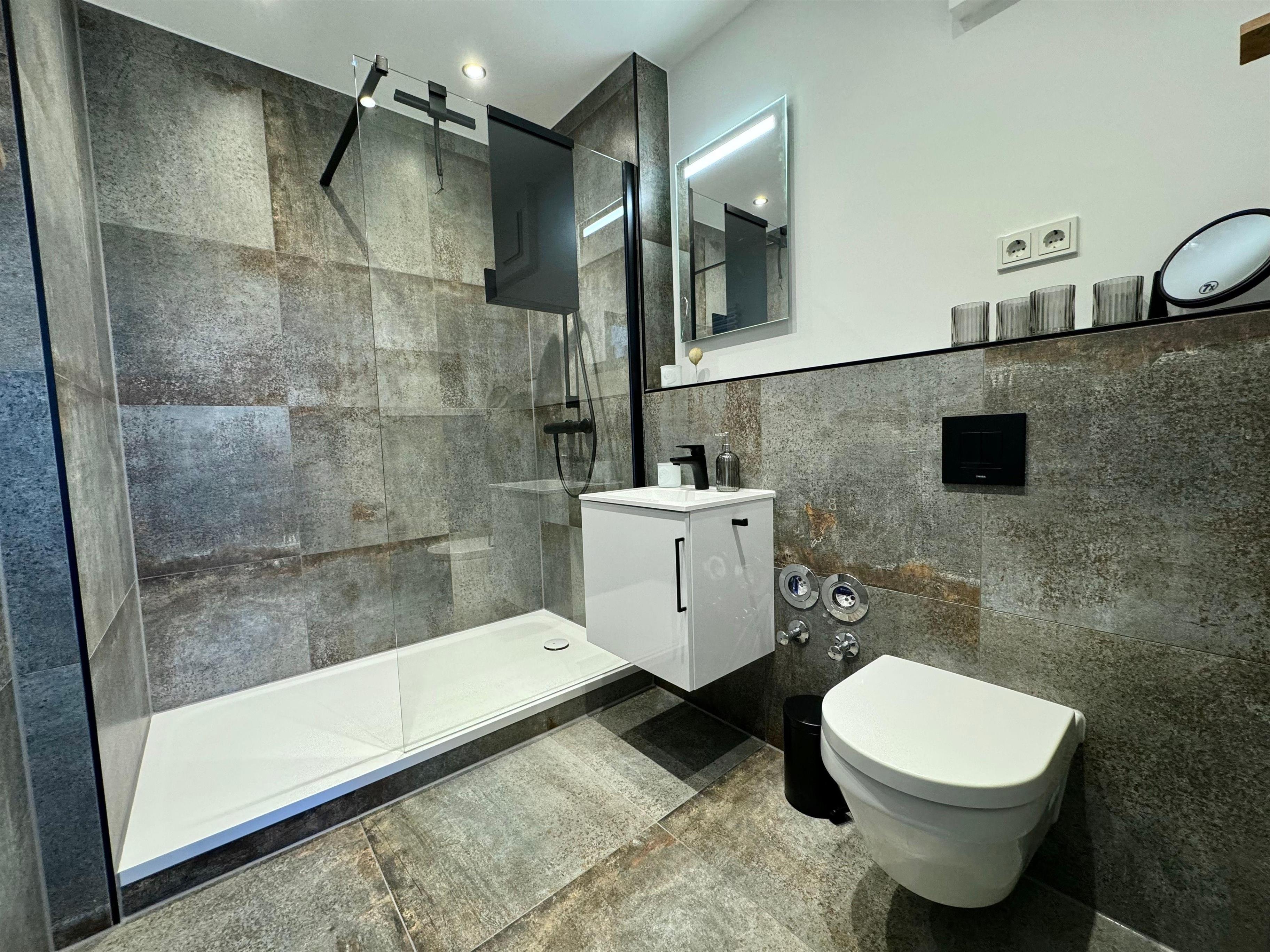 Das Badezimmer ist mit einer großen bodentiefen Dusche, einem WC und einem Waschbecken ausgestattet.