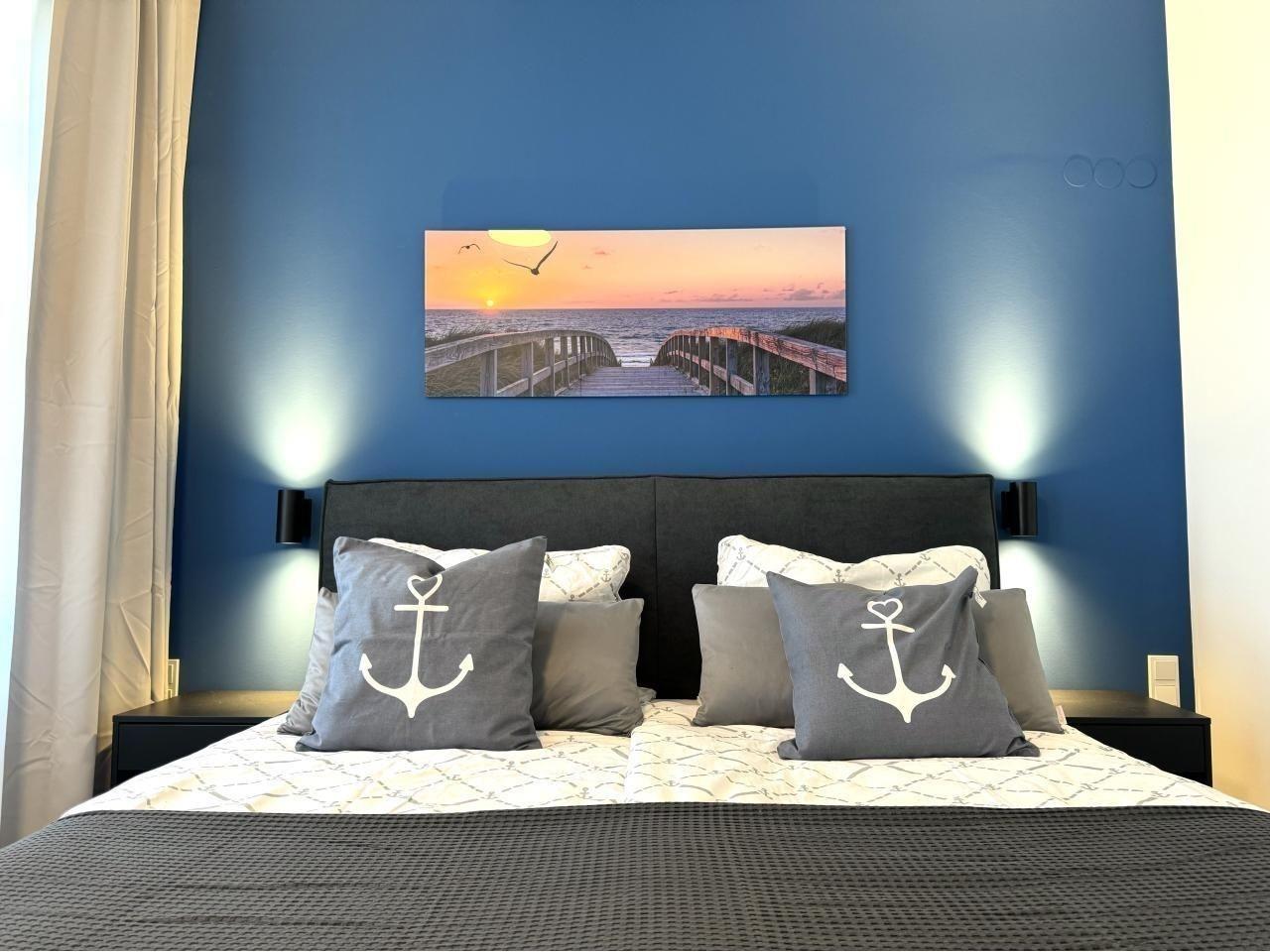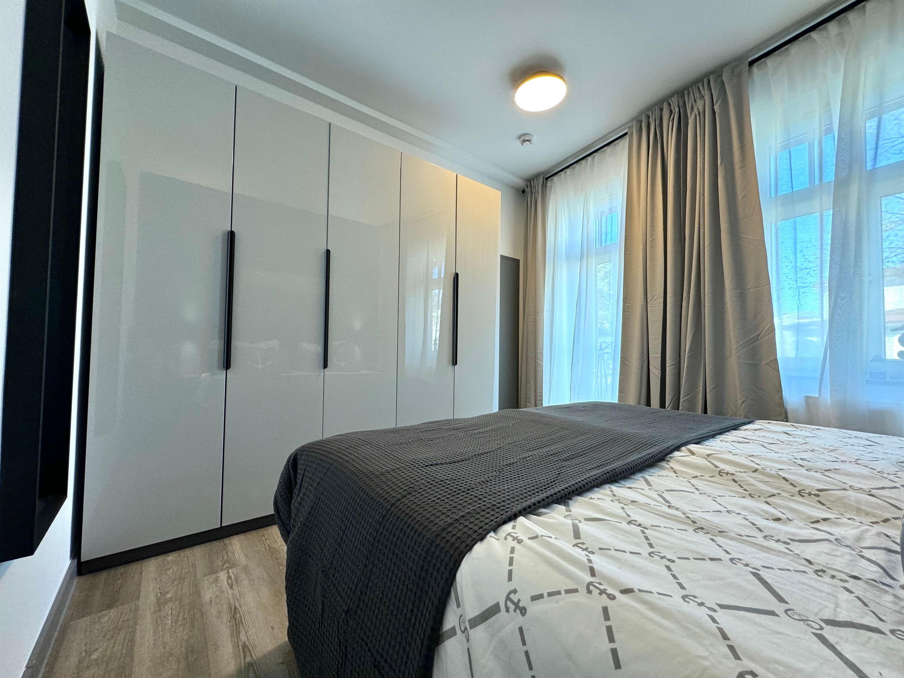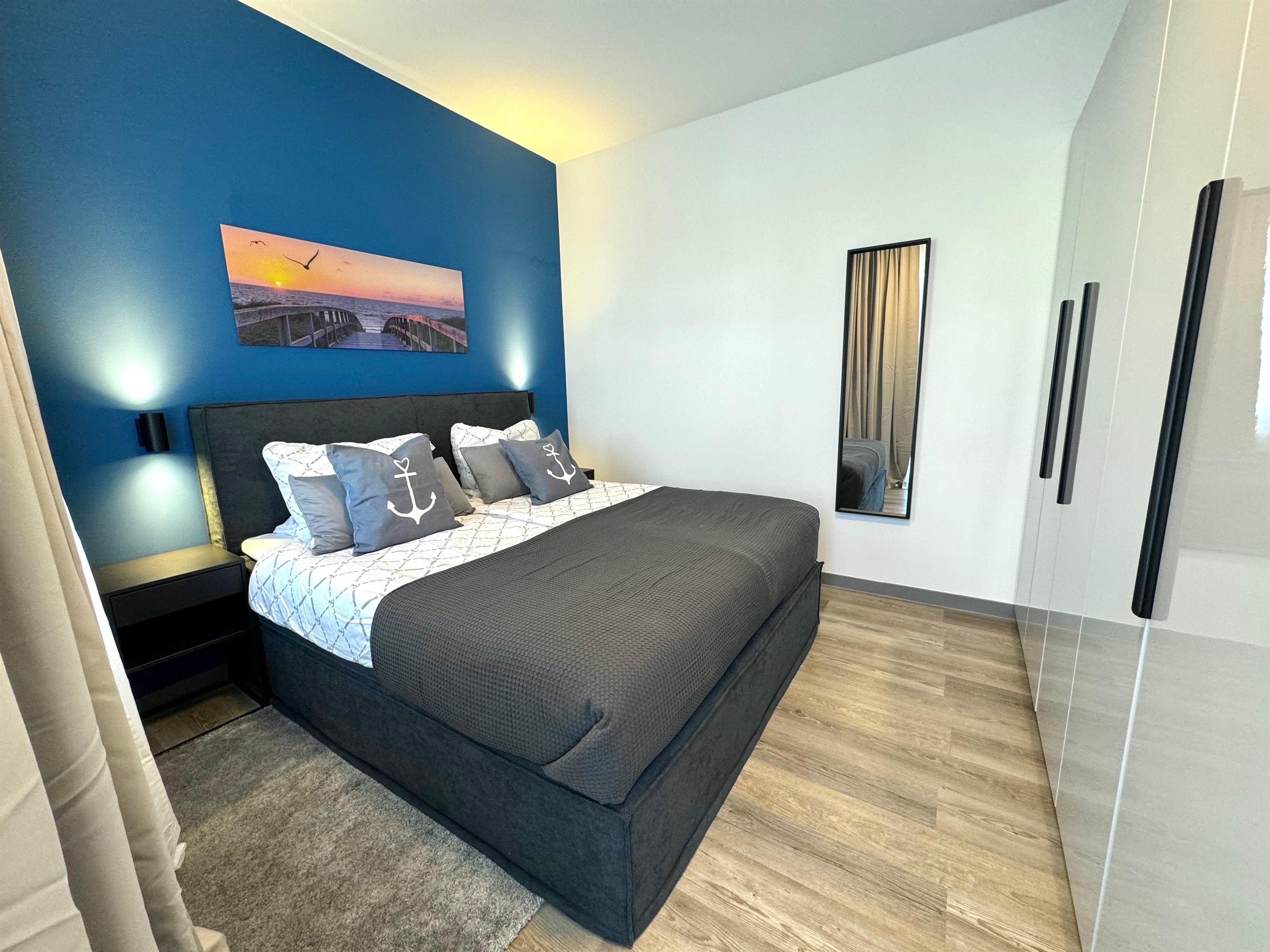 In dem geräumigen Schlafzimmer befindet sich ein großes komfortables Doppelbett sowie ein geräumiger Kleiderschrank mit ausreichend Platz für Ihre Urlaubsgarderobe.