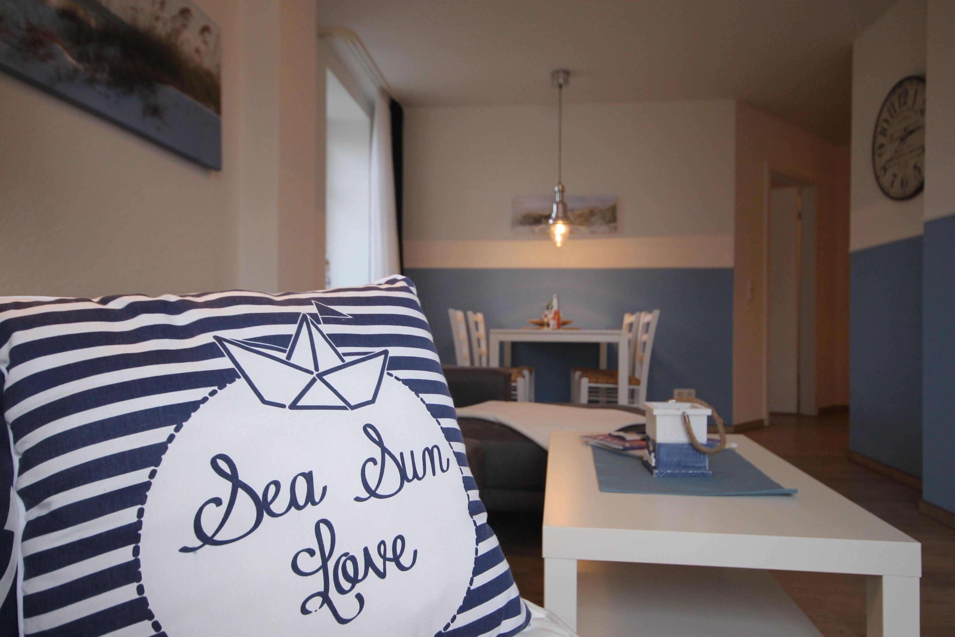 Der Wohnbereich mit dem gemütlichen Sofa und Wärme und Komfort ausstrahlenden Einrichtungsgegenständen sowie dem Flachbildschirm-TV bildet das Herzstück der Ferienwohnung. Nach einem ereignisreichen Urlaubstag können Sie hier mit der ganzen Familie entspannen und gemeinsam gemütliche Momente genießen.