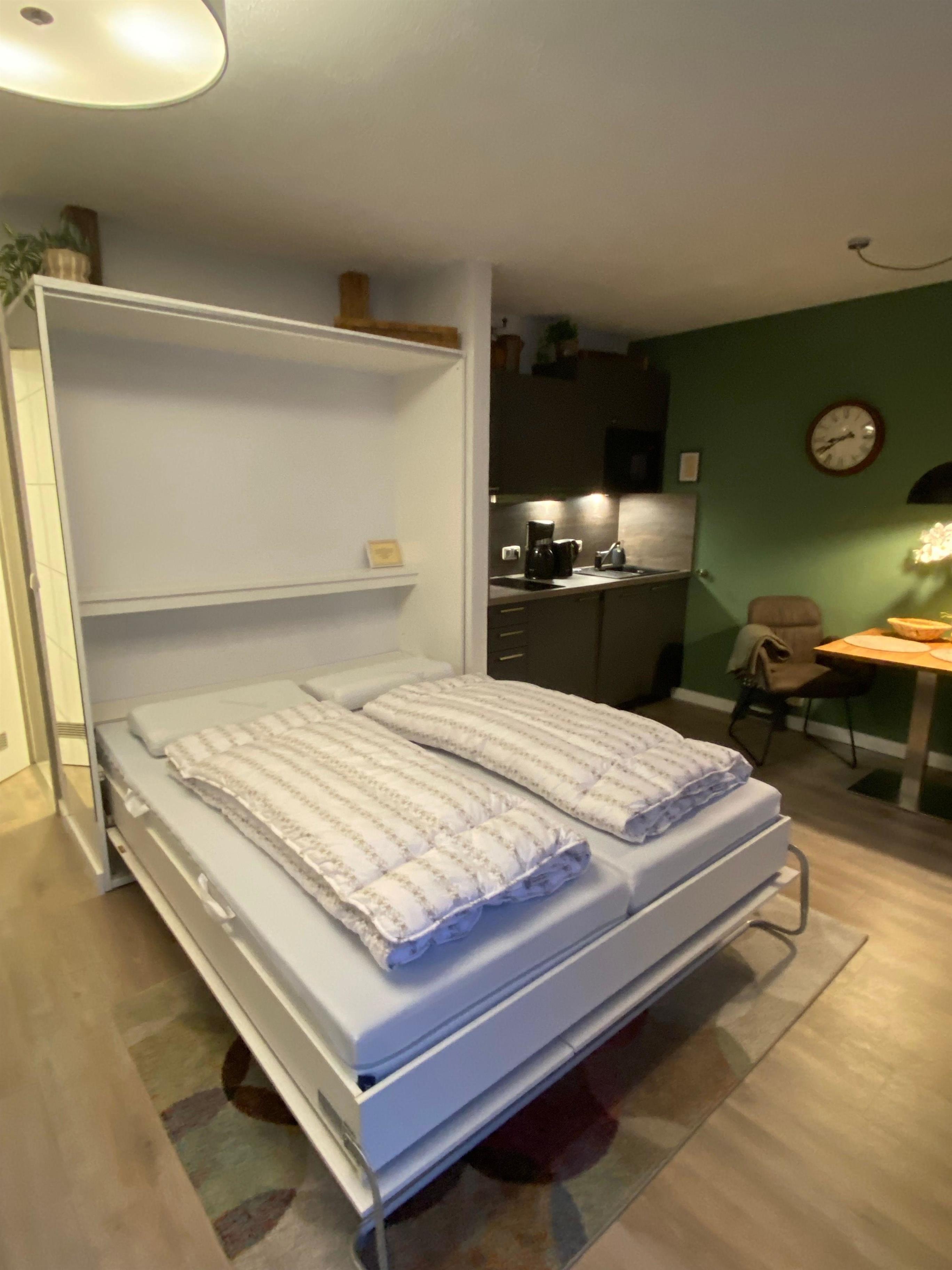 Für die Zubereitung des Frühstücks und anderer kleiner Mahlzeiten steht eine gut ausgestattete neue ALNO-Pantry-Küchenzeile (Geschirrspülmaschine, Ceranfeld, Kaffeemaschine, Wasserkocher, Mikrowelle, Toaster und Kühlschrank mit Gefrierfach) zur Verfügung. Ein Bistro-Tisch aus geölter Eiche mit 2 komfortablen Esstischsesseln lädt zu einem gemütlichen Essen ein.