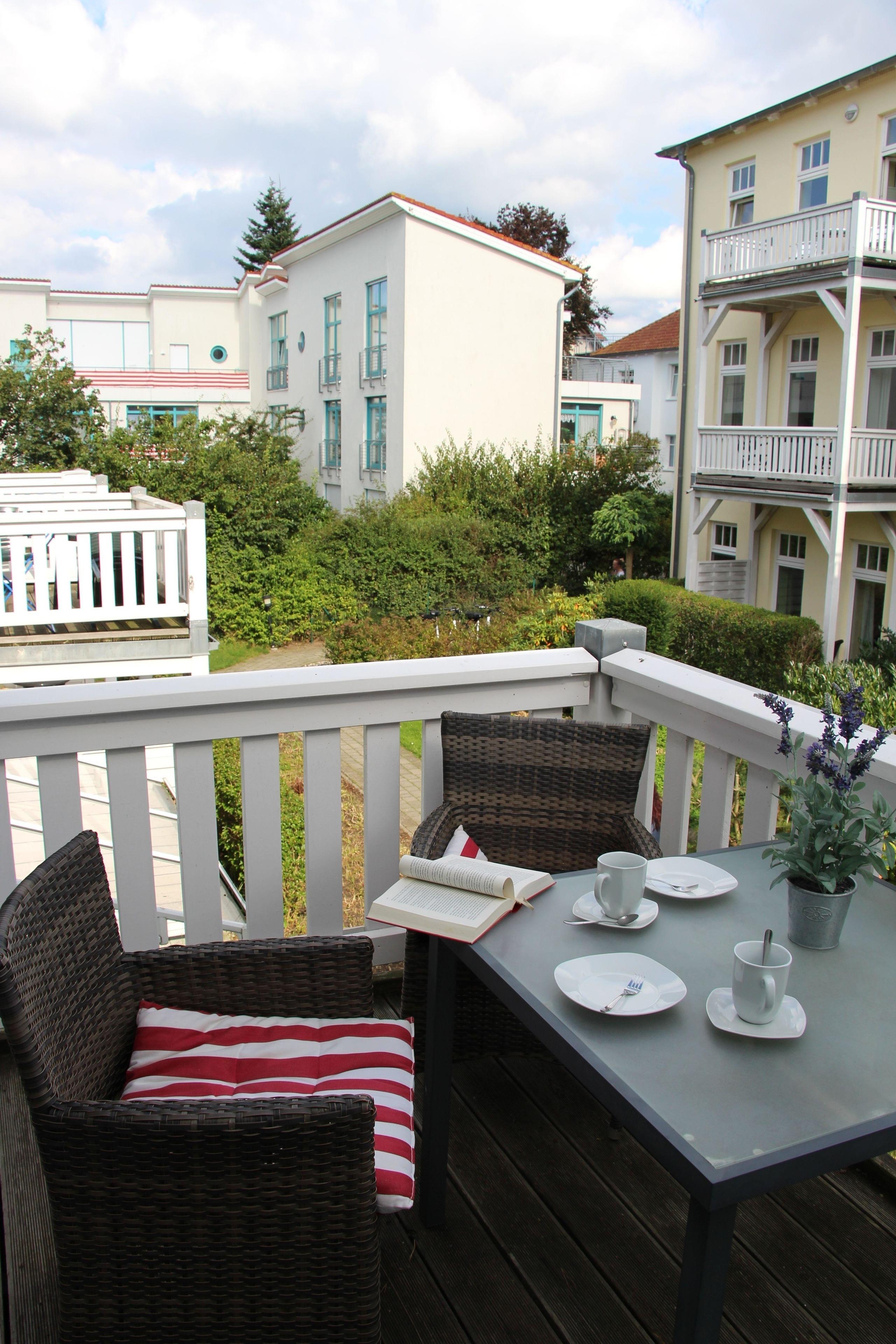 Bei schönem Wetter verlegen Sie Ihren Aufenthalt einfach ins Freie! Der große Balkon im Bäderstil mit Tisch und Sitzgelegenheiten inkl. Auflagen und einem Sonnenschirm, bietet ein tolles Ambiente, im Freien zu speisen, Kaffee zu trinken oder abends ein Glas Wein zu genießen.