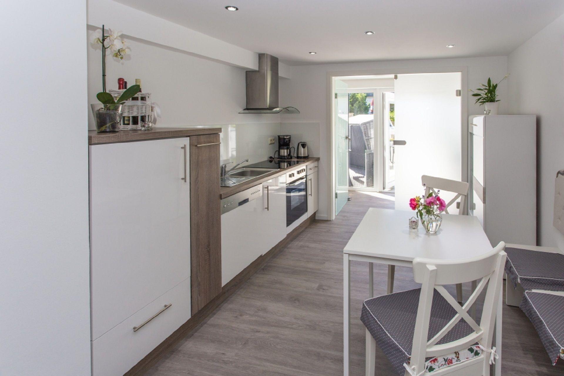 An den Wohnbereich und die Küche grenzt der Essbereich. Die Küchenzeile ist mit allen Geräten, wie 4-Platten-Ceran-Kochfeld, Kühlschrank mit Gefrierfach, Kaffeemaschine, Wasserkocher und ausreichend Kochutensilien ausgestattet.