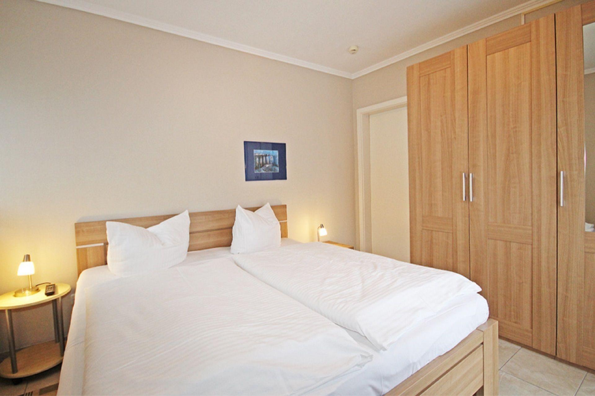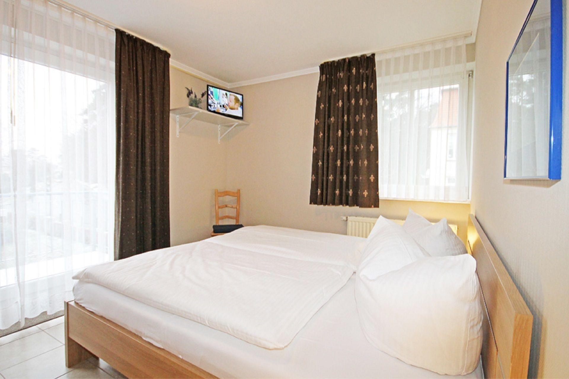 Den zweiten Balkon erreichen Sie über das Schlafzimmer. Hier stehen Ihnen ein Kleiderschrank und ein Doppelbett (2 x 90 x 200 cm) zur Verfügung. Einen zweiten Fernseher finden Sie hier ebenfalls. An den Fenstern der Ferienwohnung dienen Vorhänge zur Verdunkelung.