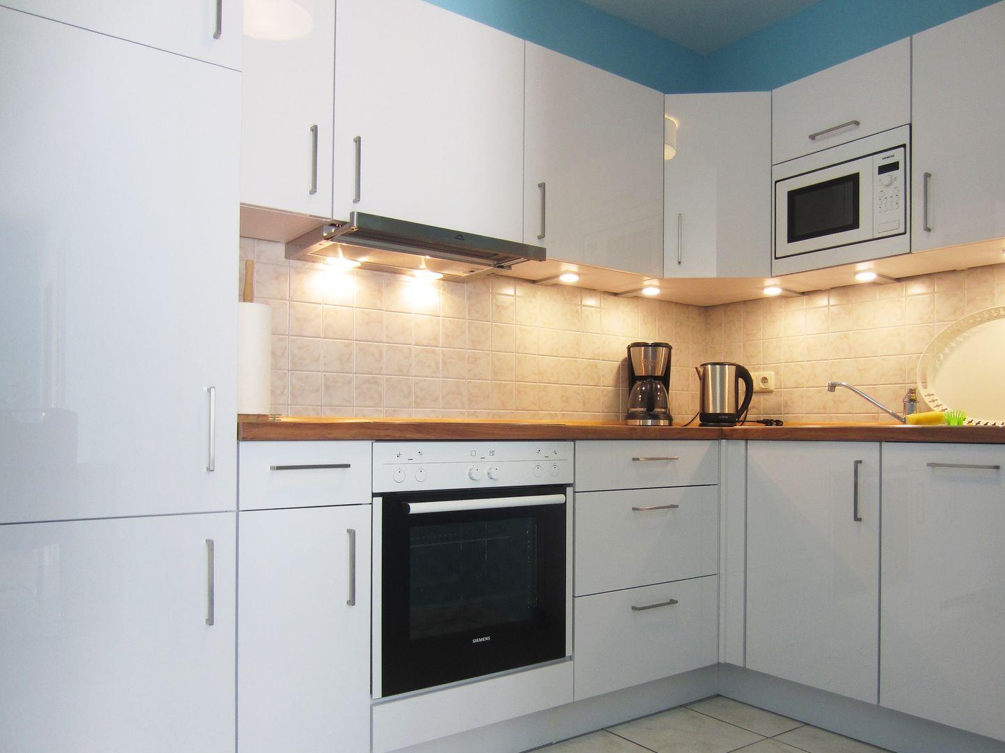 Die Küche ist vollausgestattet mit Kühlschrank + Gefrierfach, Geschirrspüler, Toaster, Wasserkocher, Kaffeemaschine und Herd mit Backofen.