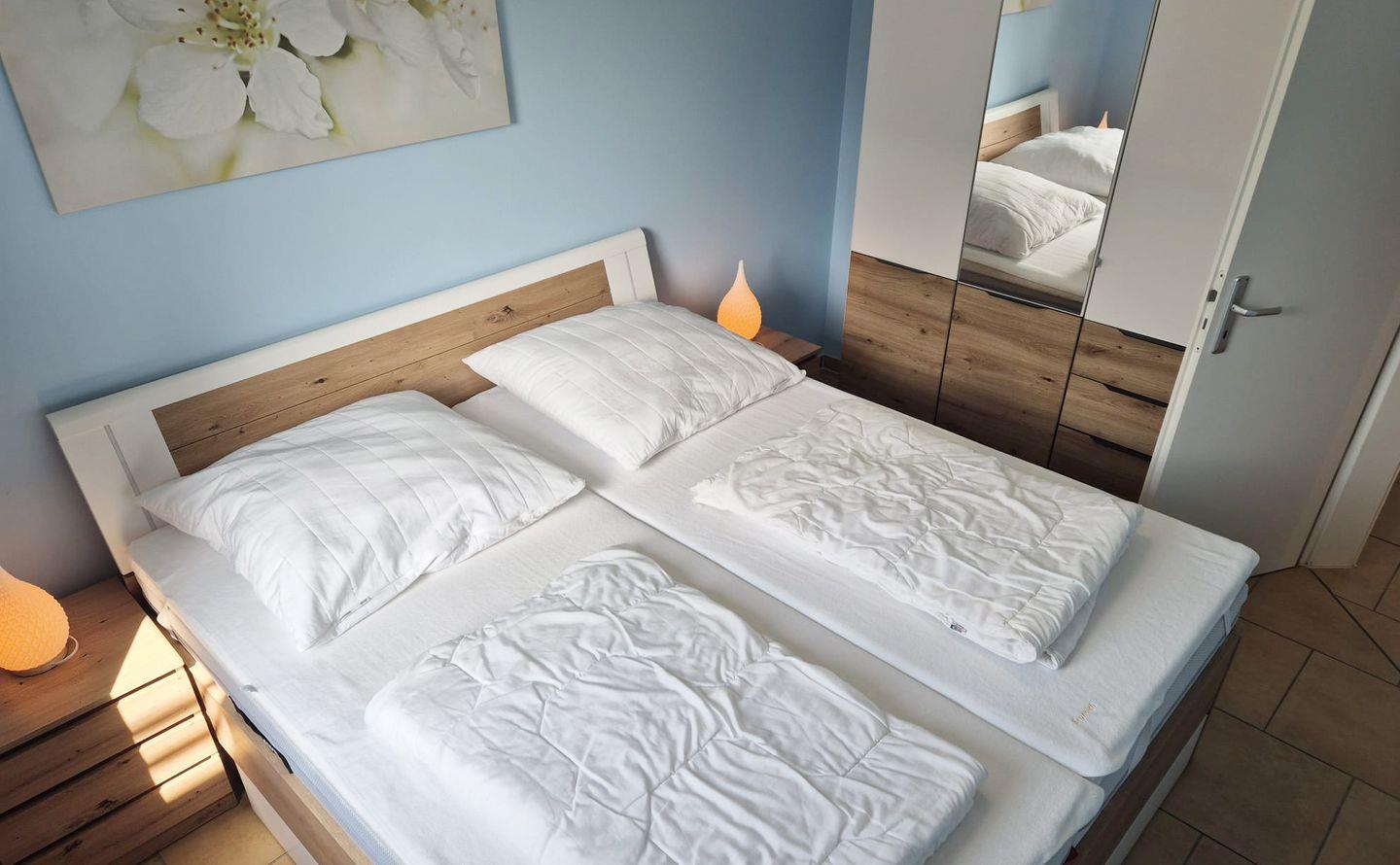 Das Schlafzimmer verfügt über ein Doppelbett, einen Kleiderschrank, Kinderreisebett (ohne Bettzeug und Matratze) und Fenster.