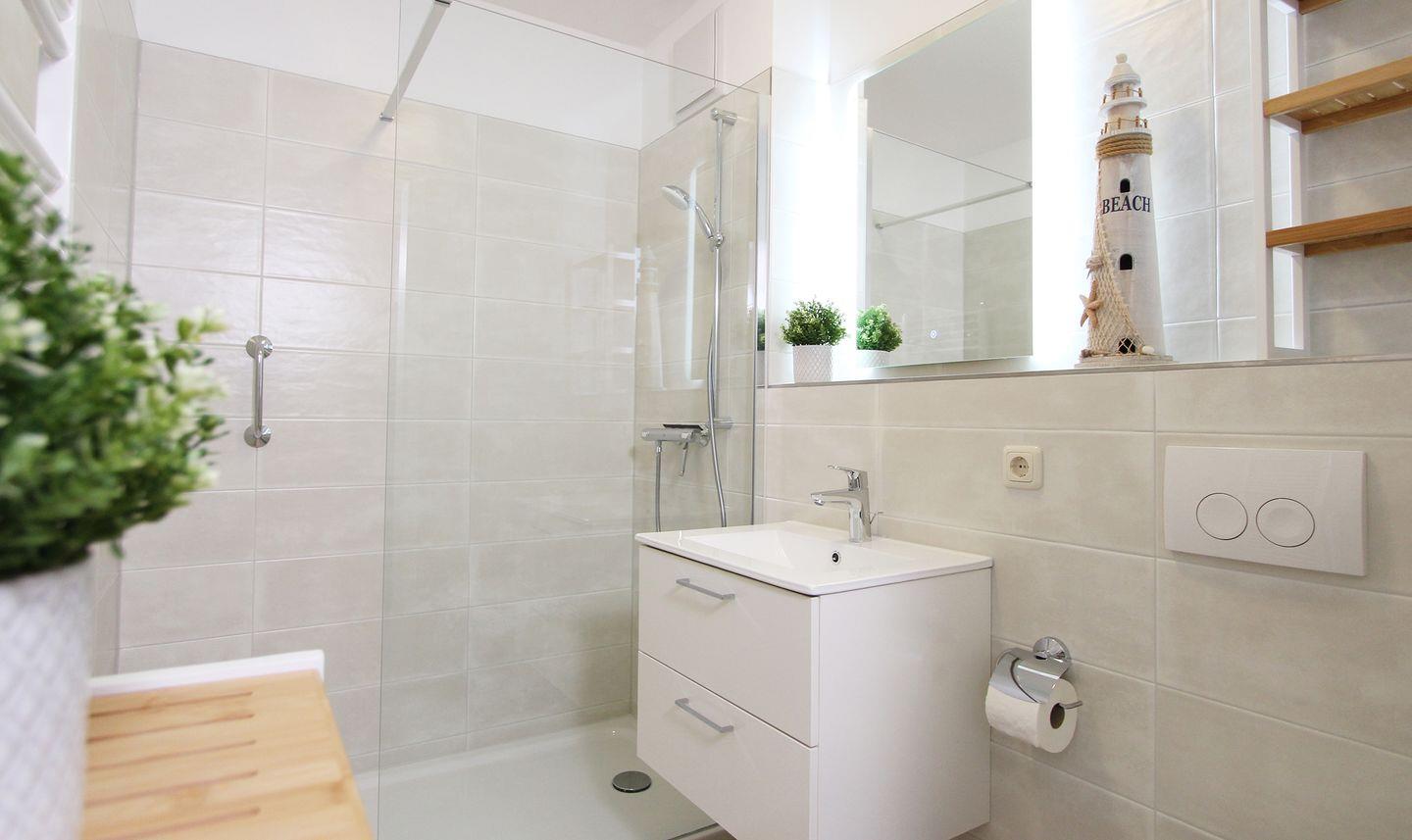 Die Ferienwohnung bietet einen Eingangsbereich mit Zugang zum Badezimmer und Wohnbereich. Das Badezimmer verfügt über ebenerdige Dusche und ein WC. Im Wohnbereich befindet sich ein bequemes Sofa, ein Flachbild TV, der Essbereich sowie die Zugänge zum Schlafzimmer, zur Küche und Terrasse.