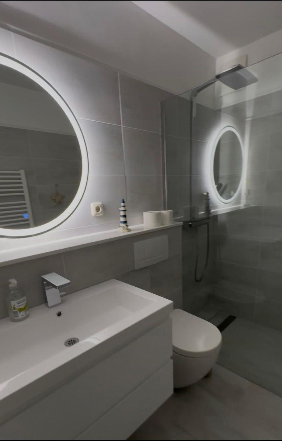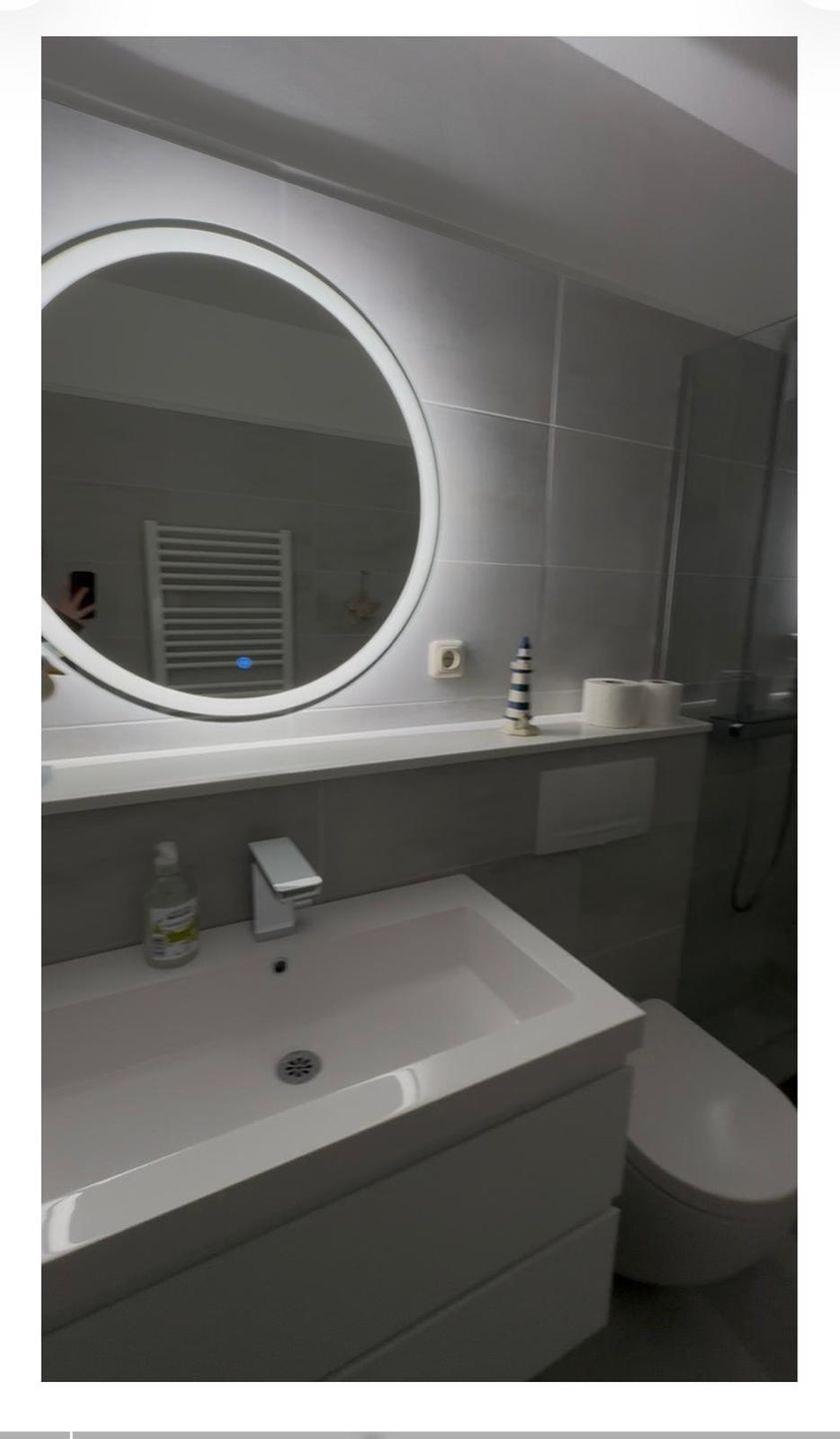 Das Schlafzimmer sowie das Wohnzimmer sind mit pflegeleichtem Laminatboden ausgestattet, was für ein angenehmes Wohnklima sorgt. Insgesamt bietet die Unterkunft Schlafmöglichkeiten für vier Personen aufgeteilt auf ein separates Schlafzimmer und weitere Schlafgelegenheiten im Wohnraum. Das moderne Badezimmer verfügt sowohl über eine Dusche mit Wanne als auch über eine Badewanne, WC und Waschbecken – ergänzt durch einen Spiegel und nützliche Ablagemöglichkeiten.