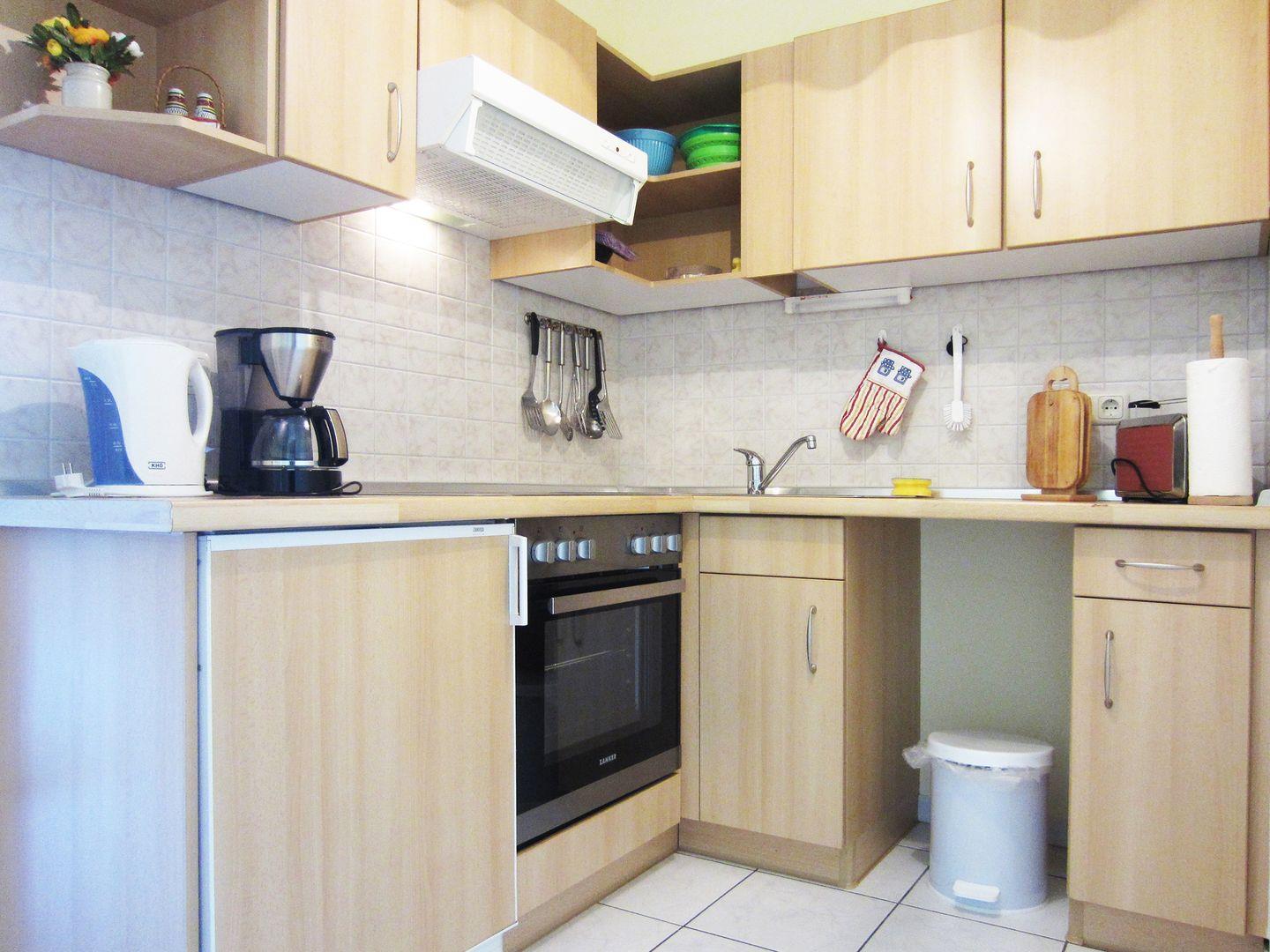 Die 1-Raumwohnung befindet sich im 1. Obergeschoß eines Mehrfamilienhauses. Auf 35 m² befindet sich eine gut ausgestattet Küchenzeile, ein Schrankbett mit einer Liegefläche von 1,20 m x 2 m und eine Chaiselongue, welche man als 3. Schlafmöglichkeit nutzen könnte. Die Küche hat ein Ceranfeld mit Backofen und einen Kühlschrank. Kaffeemaschine, Wasserkocher und Toaster sind vorhanden. Im Bad befindet sich ein WC und eine Badewanne mit Dusche. Gemeinschaftliche Münz-Waschmaschinen und -trockner sind im Keller vor zu finden.