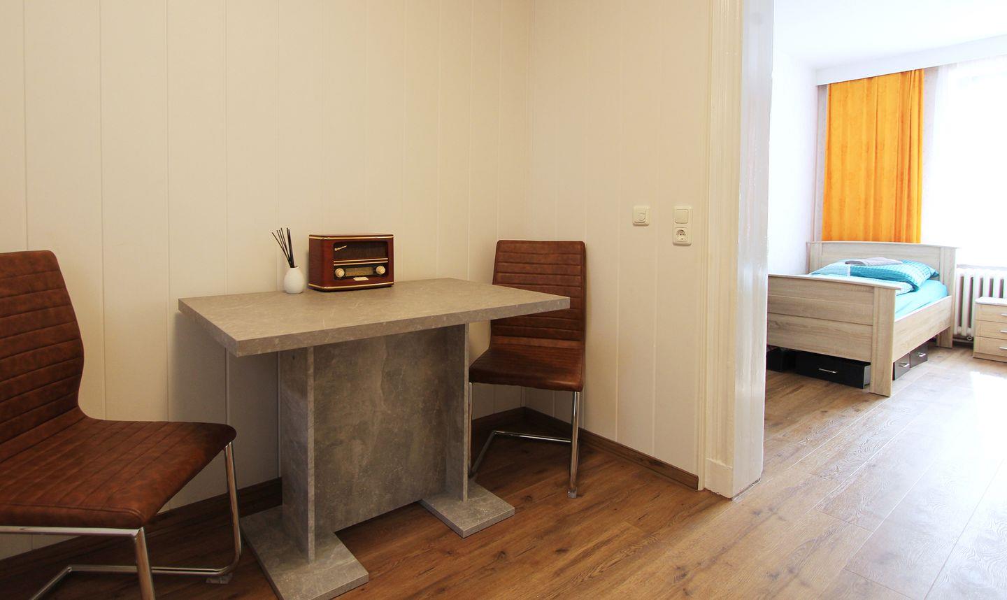 Ein 2-Zimmer Apartment, 44 m², im Erdgeschoß eines Einfamilienhauses. Es gibt ein Wohnzimmer mit Schlafsofa und einem TV, sowie ein Schlafzimmer mit 2 Einzelbetten. Eine gut ausgestattete Küchenzeile ist vorhanden. Zum Duschbad (Alleinnutzung) kommt man über den Flur, welcher außerhalb der Wohnung liegt. Hier gibt es eine ebenerdige Dusche, WC, Fön und ein Tageslichtfenster. PKW-Stellplatz, Sitzecke im Garten sind ebenfalls vorhanden.