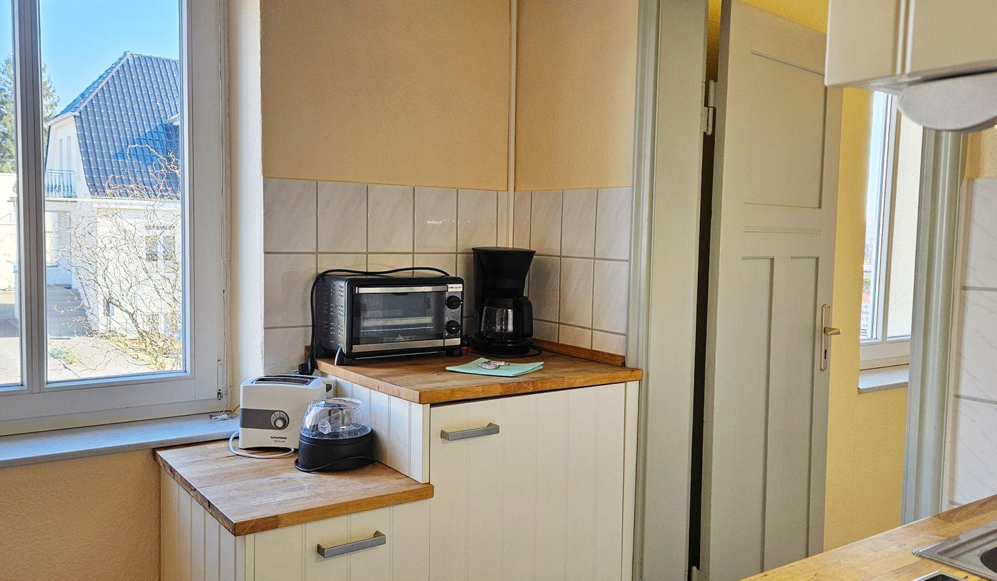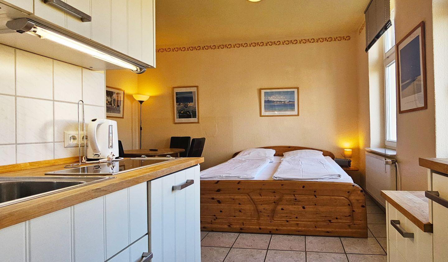 Die Kochnische ist mit den wichtigsten Ausstattungsmerkmalen für die Selbstversorgung versehen. Dazu gehören ein 2-Platten-Herd, Mikrowelle, Kühlschrank, Wasserkocher, Toaster sowie Küchenutensilien, Geschirr und Besteck. So können Sie kleinere Mahlzeiten unkompliziert zubereiten.