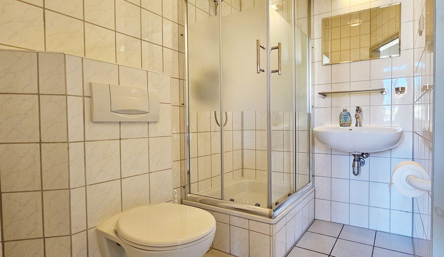 Das Badezimmer verfügt über WC, Waschbecken, Spiegel, Kosmetikspiegel und eine Dusche mit Wanne. Warmes Wasser ist selbstverständlich vorhanden. Zur weiteren Ausstattung gehören WLAN und Internet, ein Wäscheständer, Staubsauger, Abfalleimer sowie Rauchmelder.