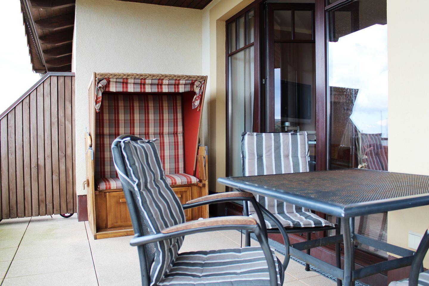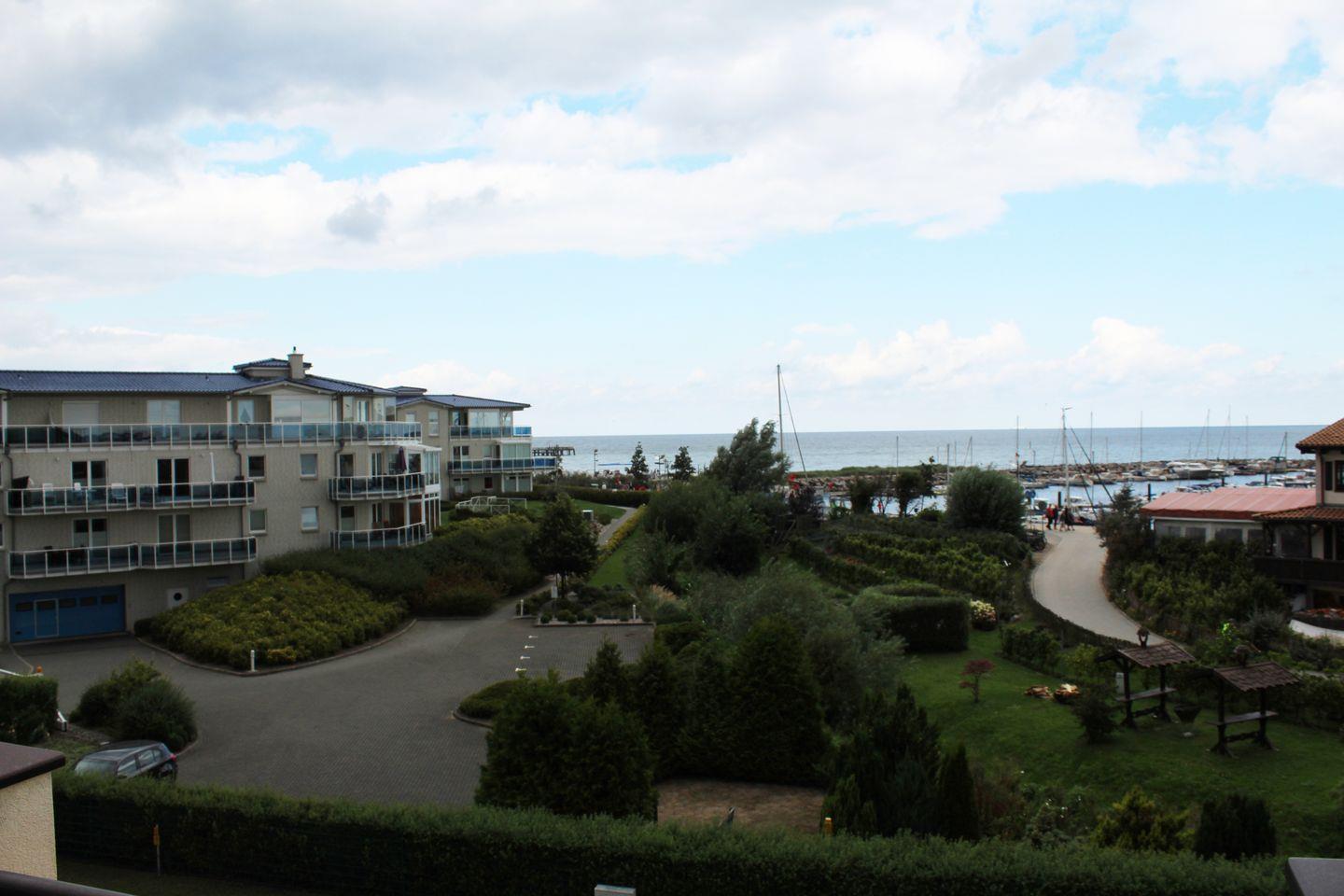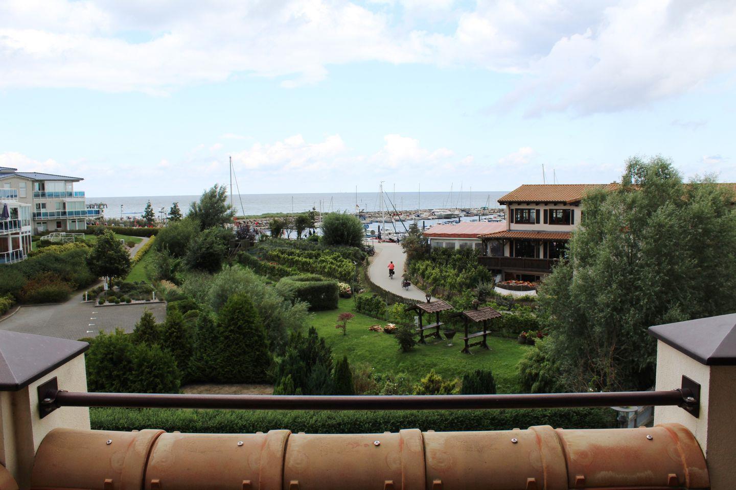 Ferienwohnung Hafenblick in Kühlungsborn mit Meerblick, überdachtem Balkon und Sauna für einen komfortablen Urlaub.