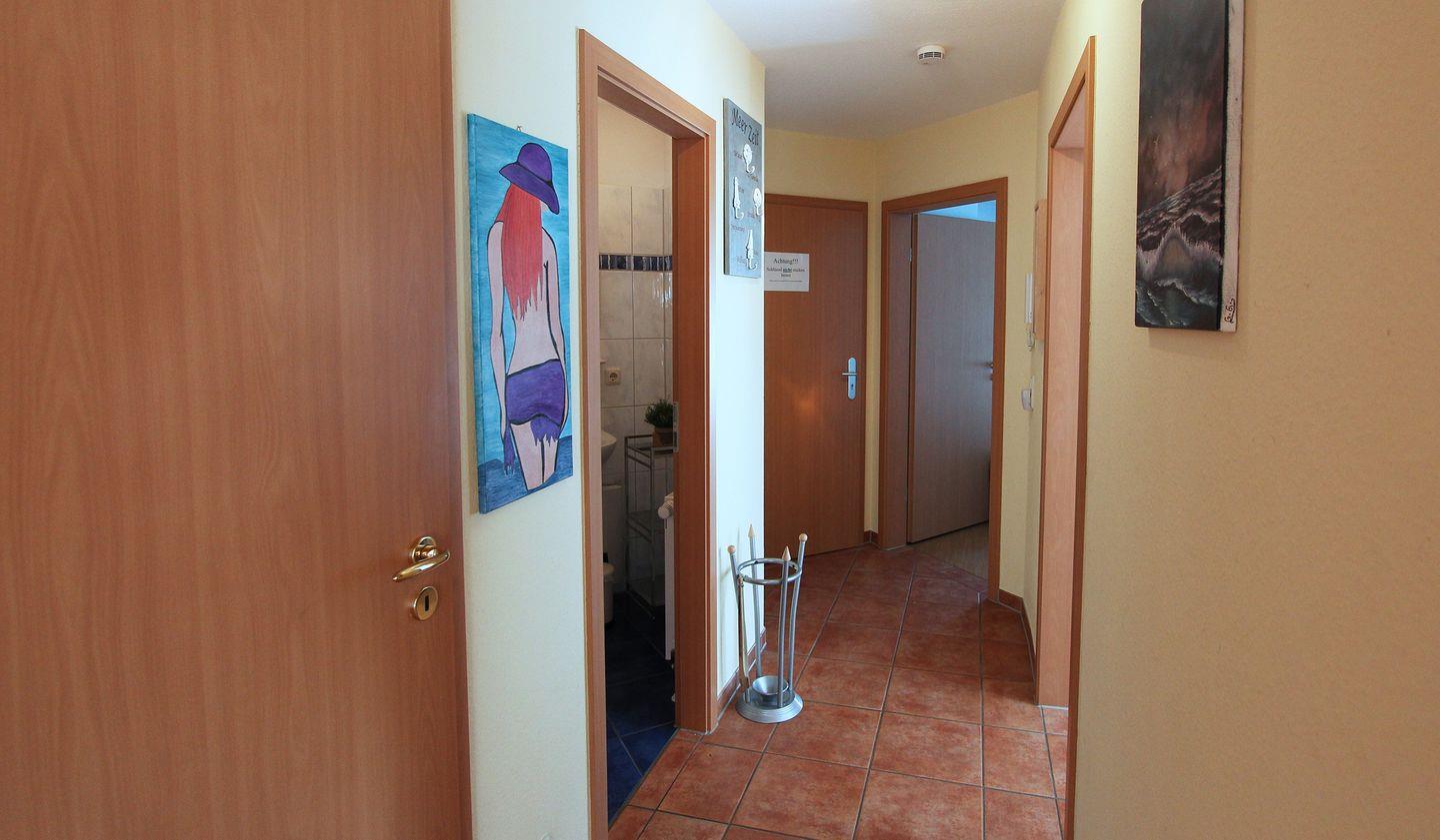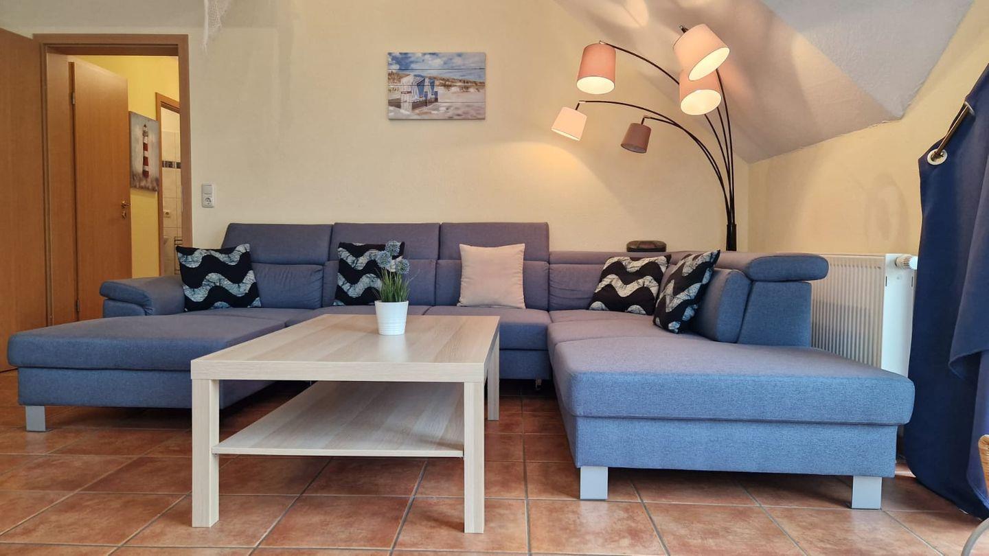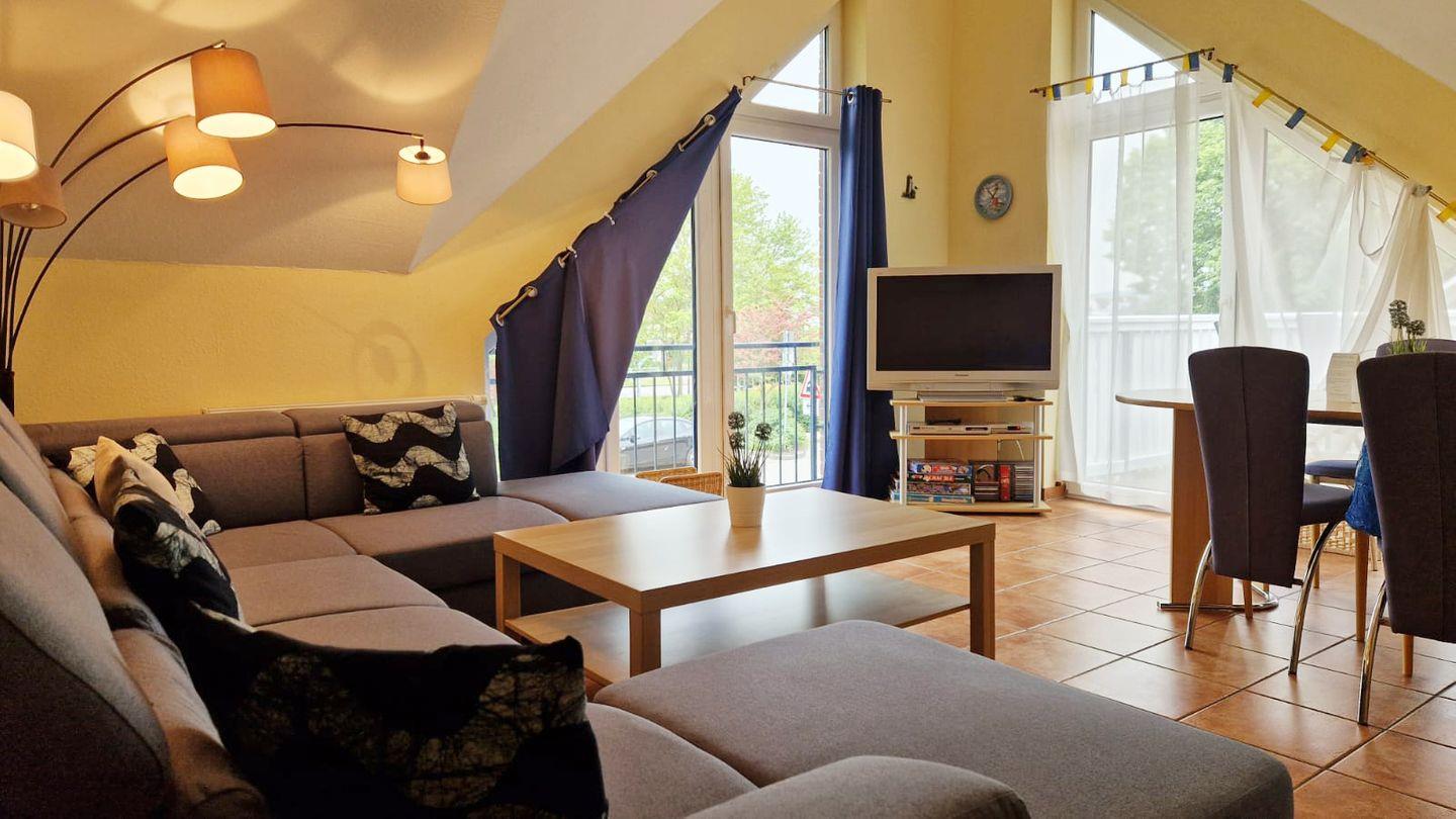 Die Ferienwohnung verfügt über 2 Schlafzimmer, einen Wohnbereich mit einer gut ausgestatteten Küchenzeile und einem Duschbad mit WC. Die Küche verfügt über einen Kühlschrank mit Gefrierfach, einen Geschirrspüler, ein Ceranfeld mit Backofen sowie einem Toaster, einer Kaffeemaschine und einem Wasserkocher. Der Essbereich schließt gleich dort an, genau wie der Zugang zum Balkon nach Süden. Ebenfalls verfügt der Wohnbereich über eine gemütliche Sitzecke und einen TV.