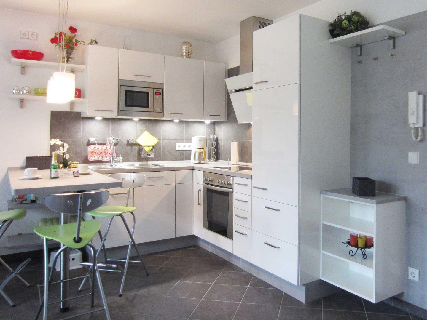 Die Wohnung befindet sich im 1. Stockwerk und umfasst insgesamt zwei Zimmer, darunter ein separates Schlafzimmer mit unempfindlichem Fliesenboden für eine angenehme Wohnhygiene. Insgesamt stehen drei Schlafmöglichkeiten zur Verfügung, sodass auch kleine Familien hier gut aufgehoben sind. Ein wohnlicher Wohnbereich mit offen gestalteter Küche lädt zum Verweilen und gemeinsamen Kochen ein. Die Küche bietet eine umfassende Ausstattung: Spülmaschine, Kühlschrank, Gefrierfach, Backofen, Mikrowelle, Herd mit warmem Wasser, Toaster, Wasserkocher sowie Kaffeemaschine und natürlich ausreichend Geschirr und Besteck. Auch Geschirrhandtücher sind vorhanden.